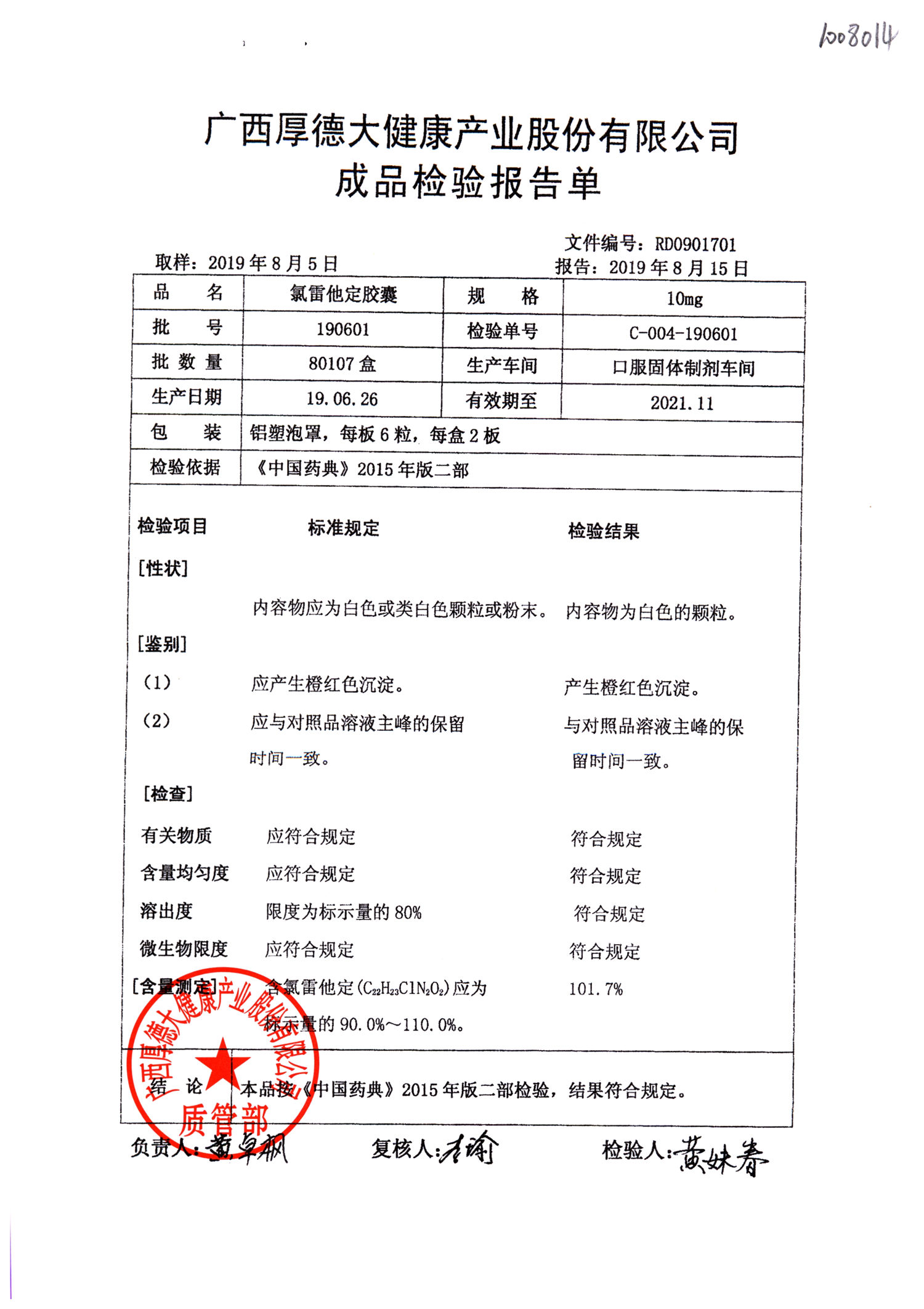 氯雷他定胶囊 | 10mg*12粒 | 190601(2/2) | 查看详情 |