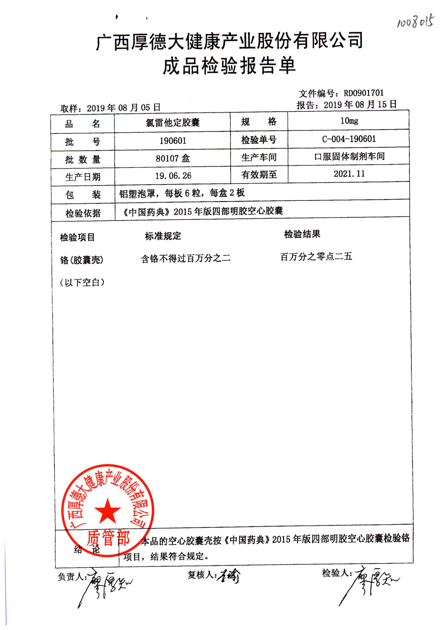 氯雷他定胶囊 | 10mg*12粒 | 190601(1/2) | 查看详情 |