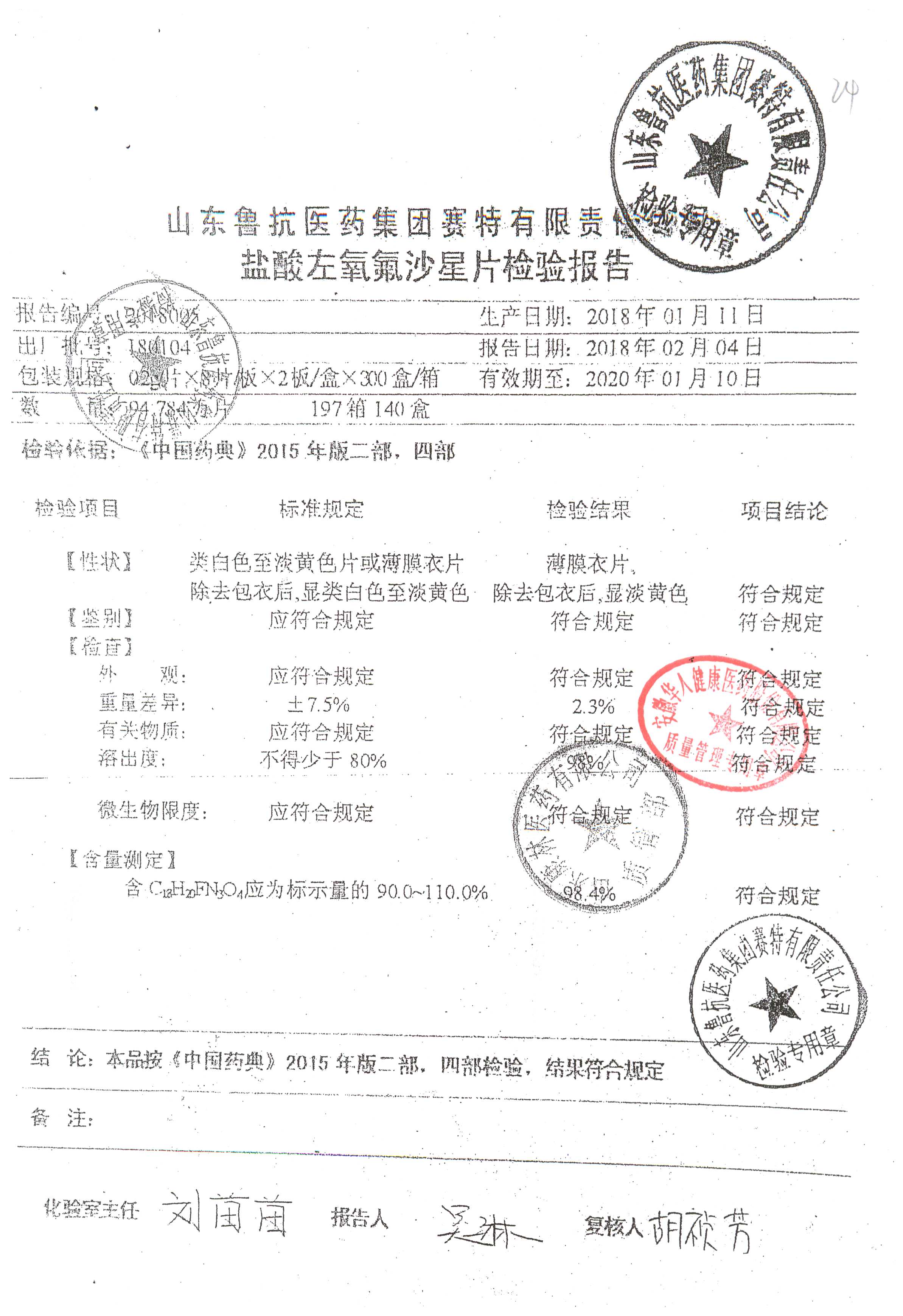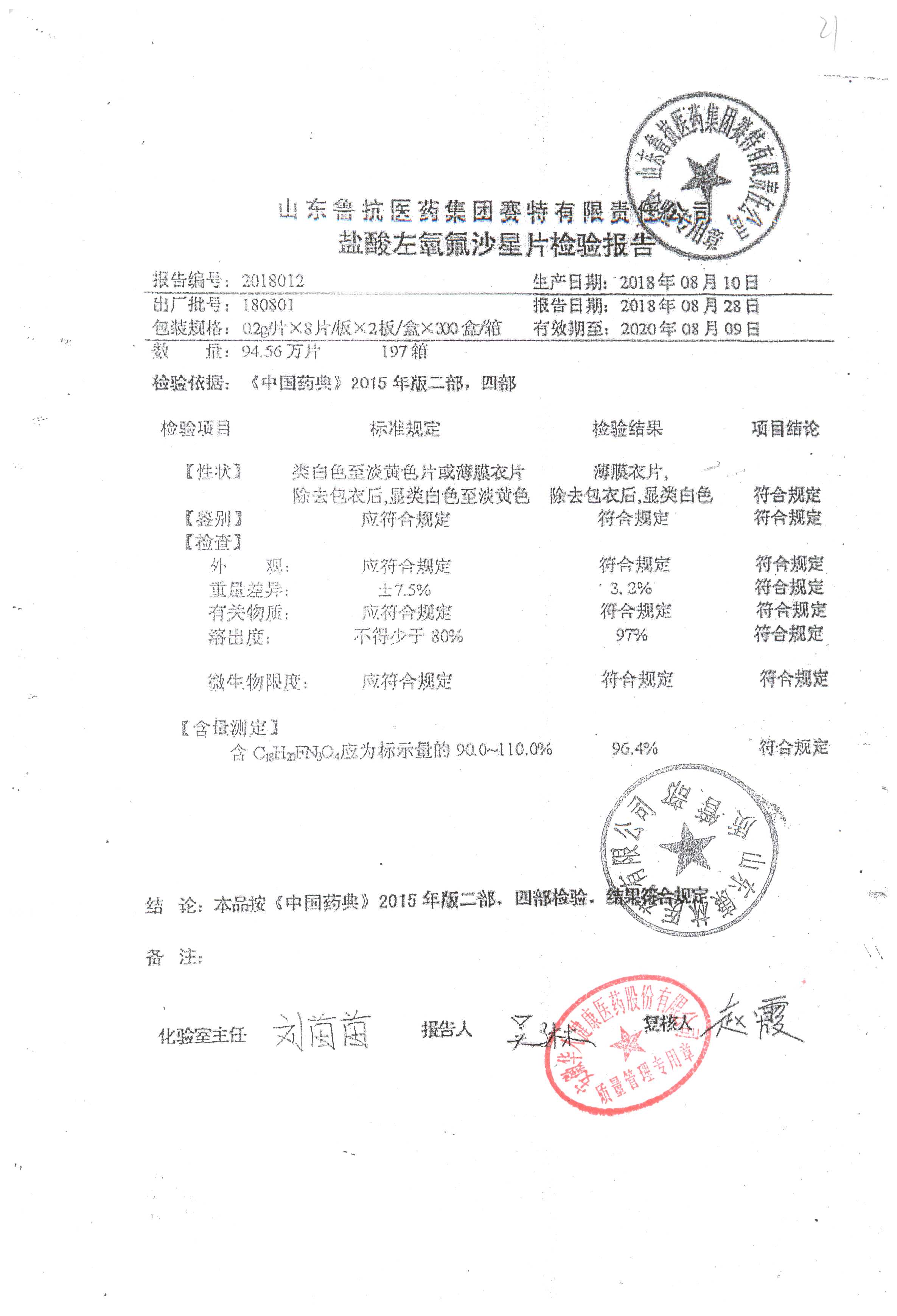盐酸左氧氟沙星片 | 0.2g*16s | 180801 | 查看详情 |