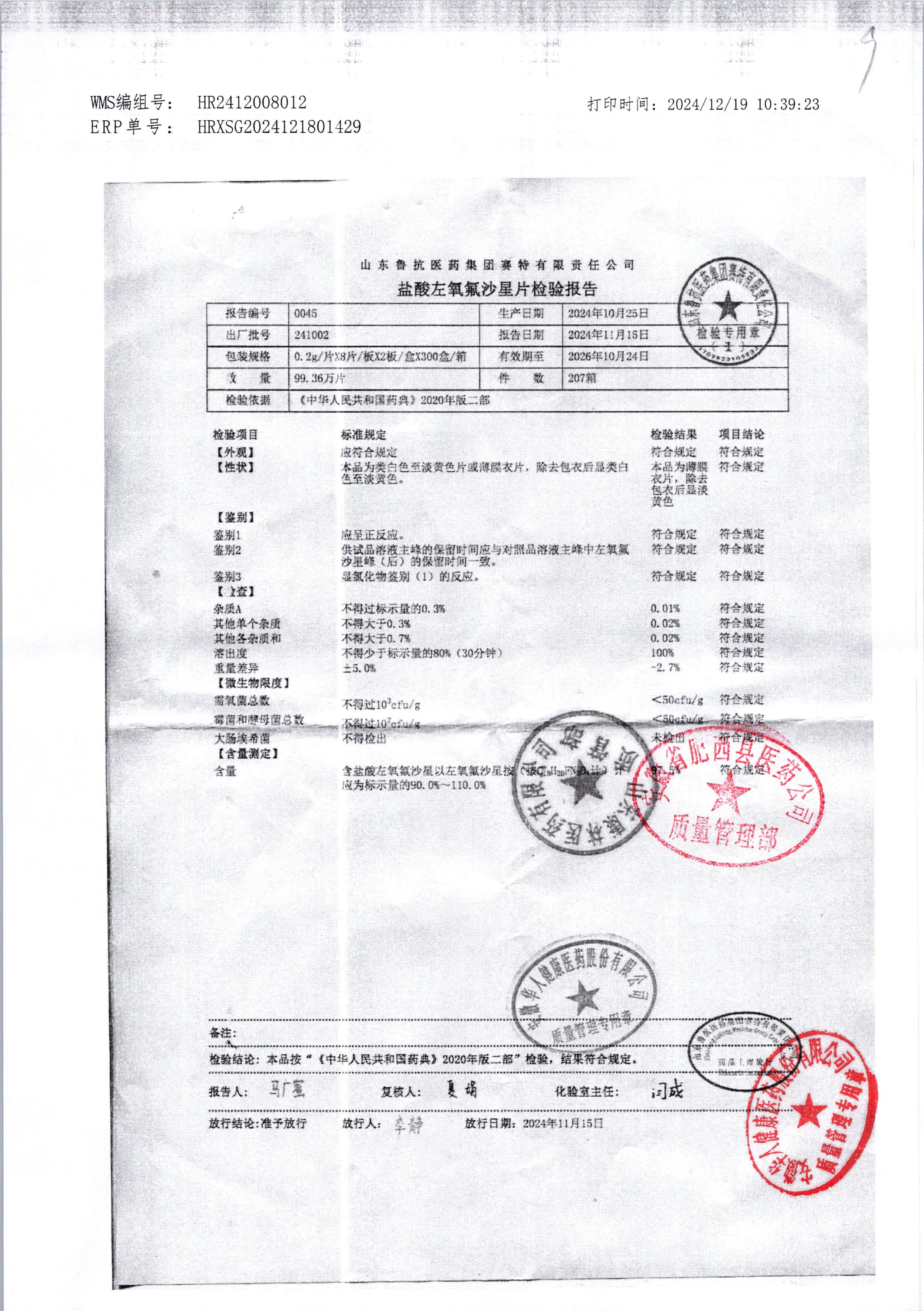 盐酸左氧氟沙星片 | 0.2g*16s | 241002 | 查看详情 |