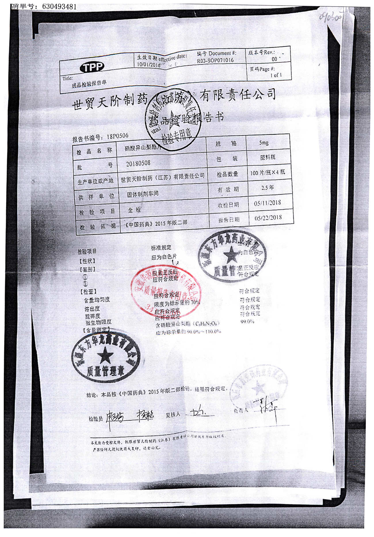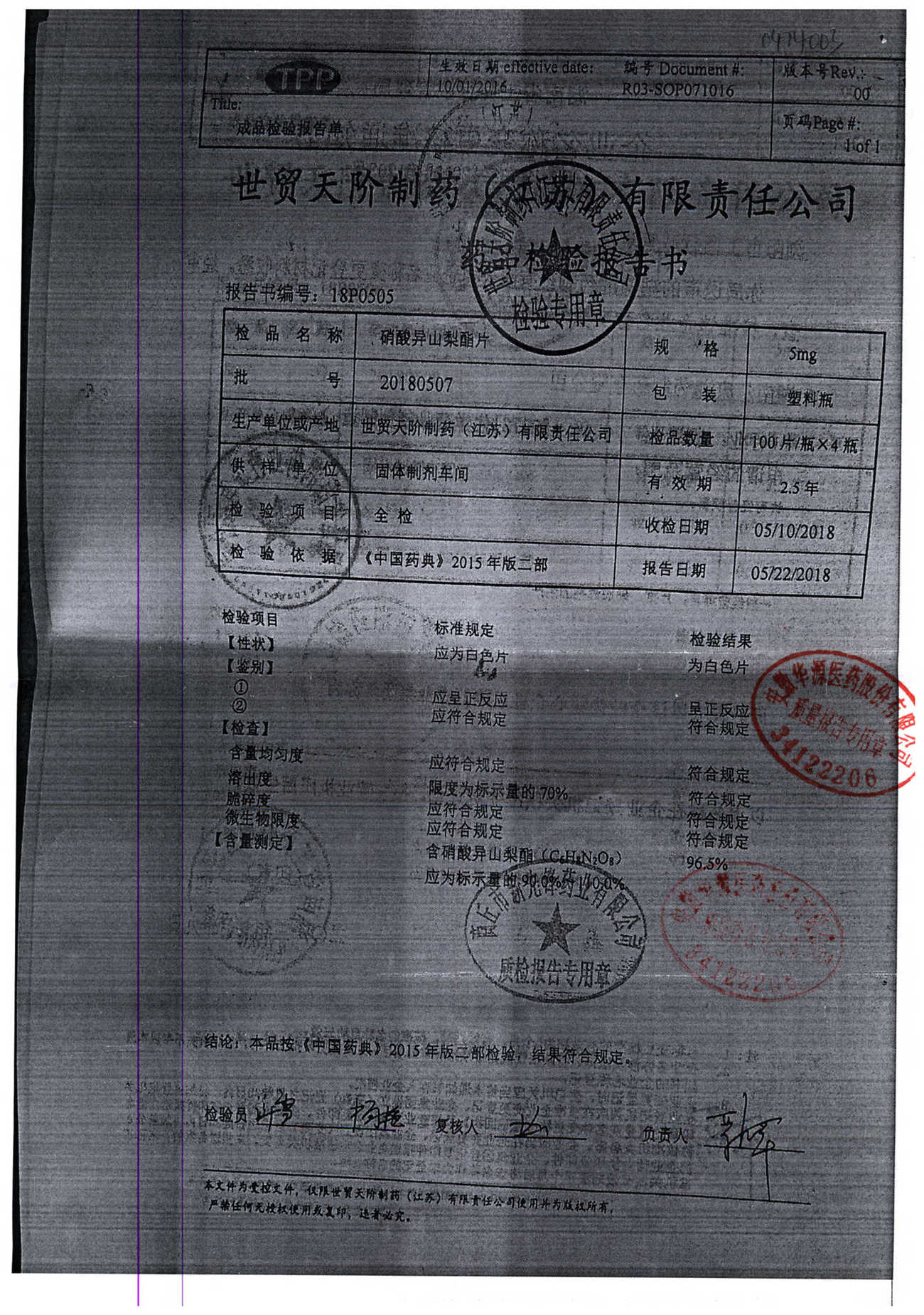 硝酸异山梨酯片 | 5mg*100片 | 20180507 | 查看详情 |