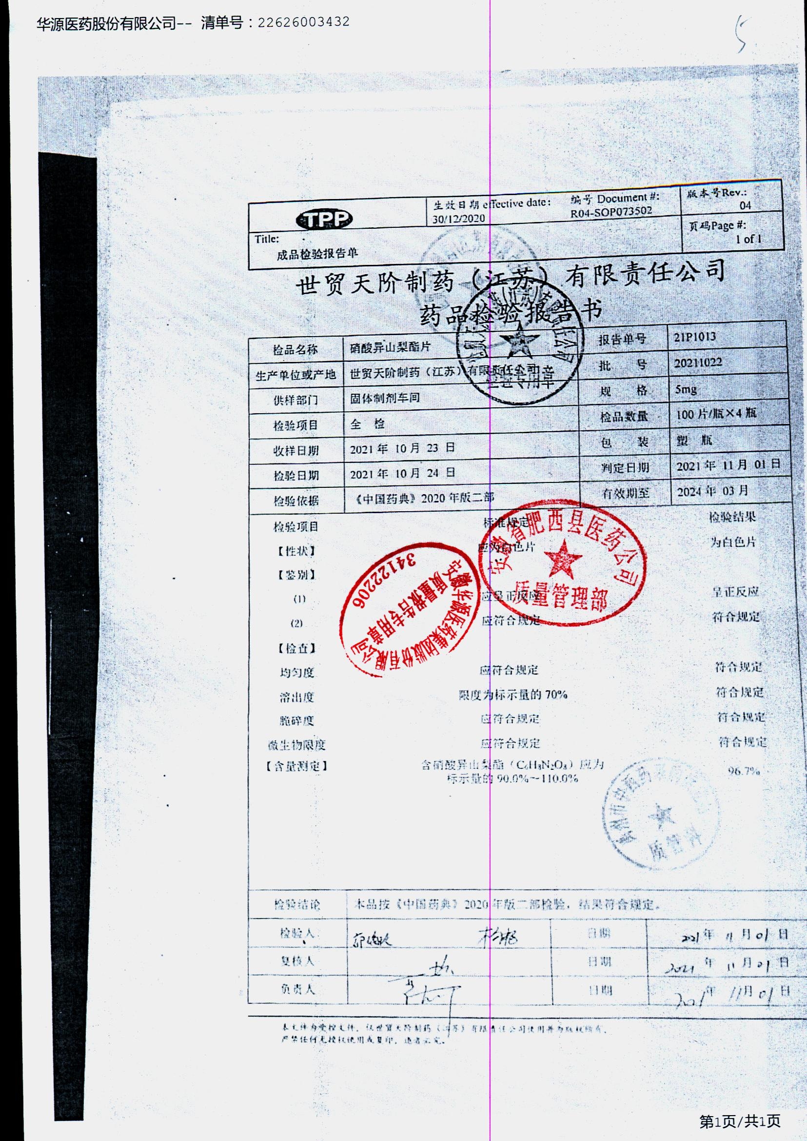 硝酸异山梨酯片 | 5mg*100片 | 21P1013 | 查看详情 |