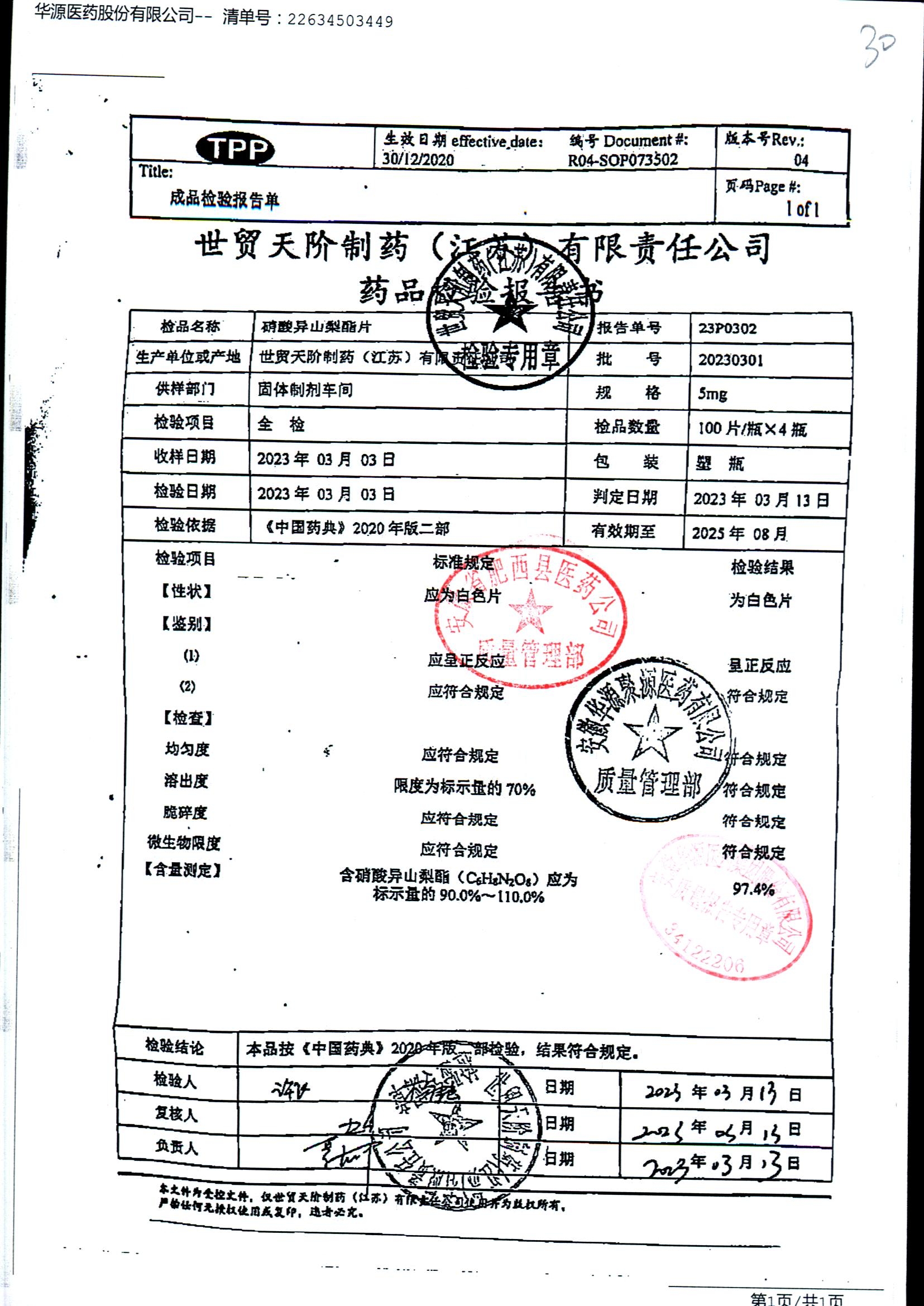 硝酸异山梨酯片 | 5mg*100片 | 20230301 | 查看详情 |