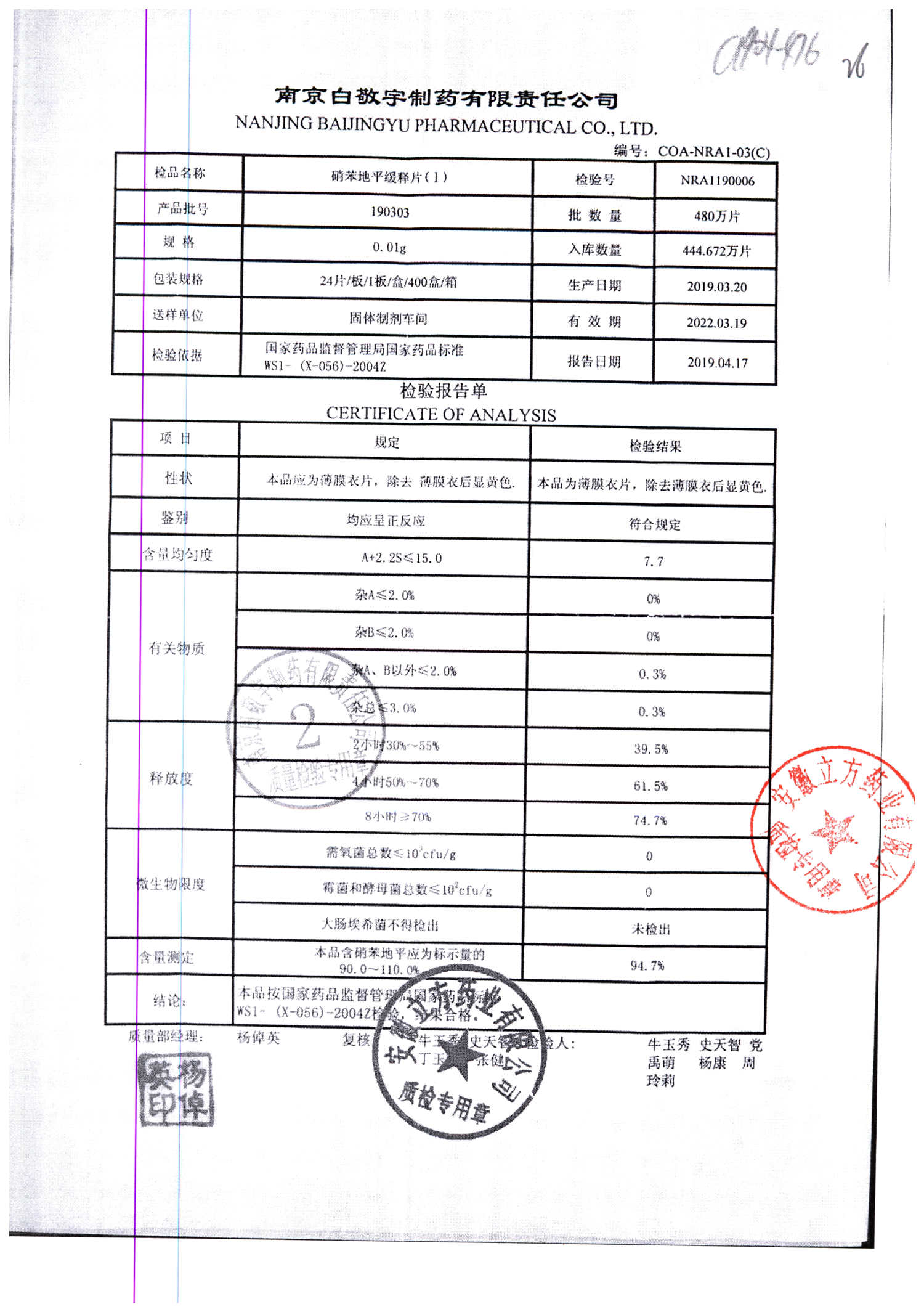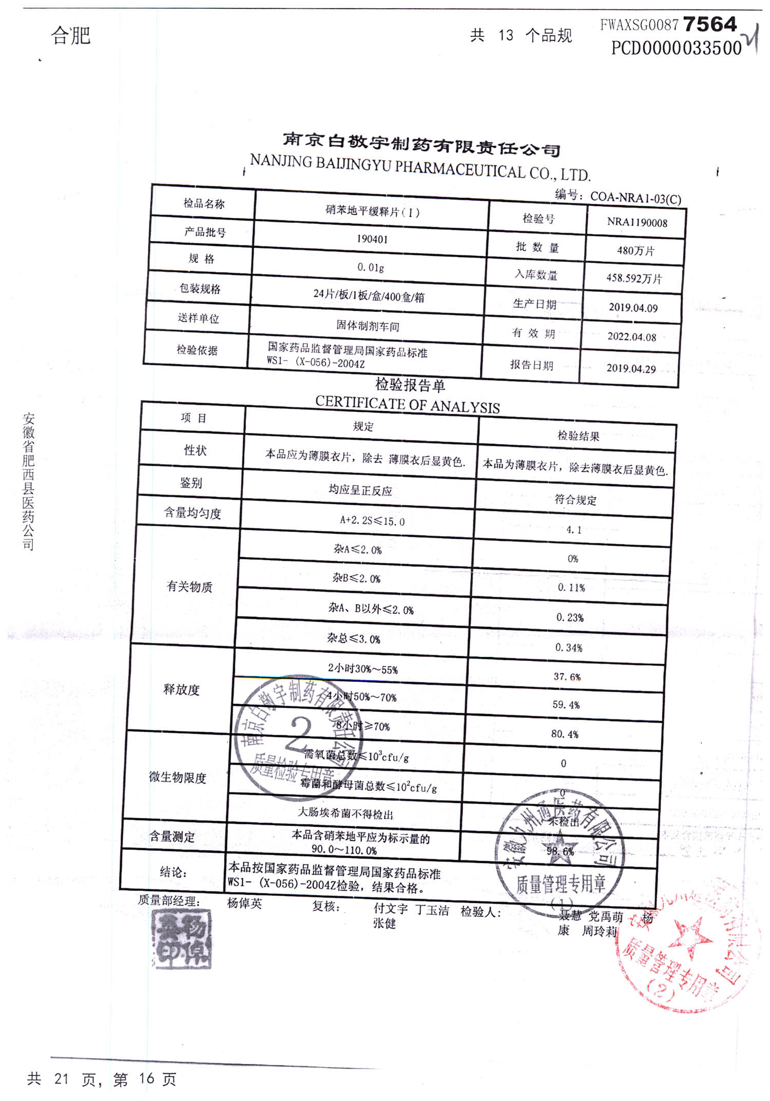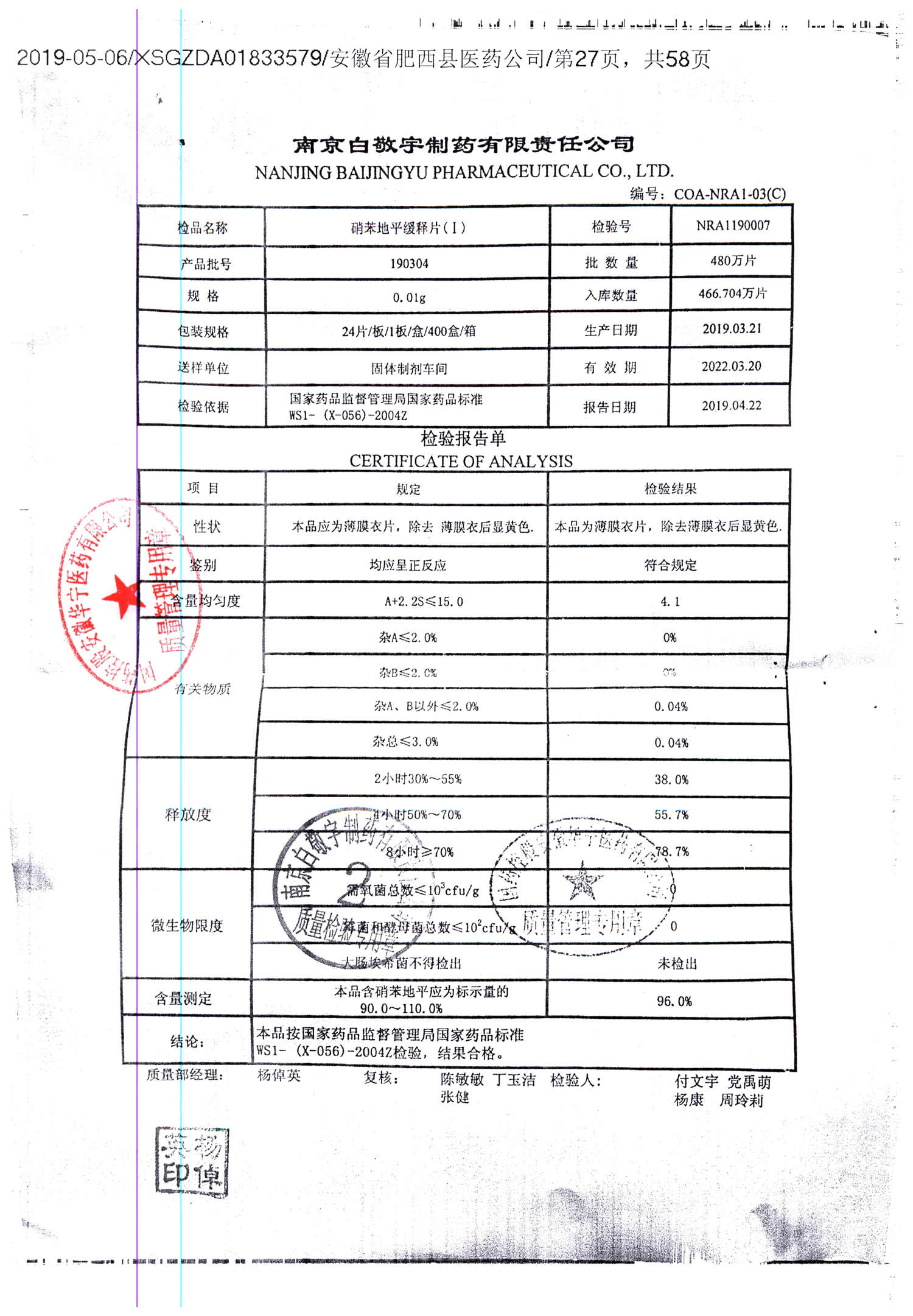硝苯地平缓释片(I) | 0.01g*24片 | 190401 | 查看详情 |