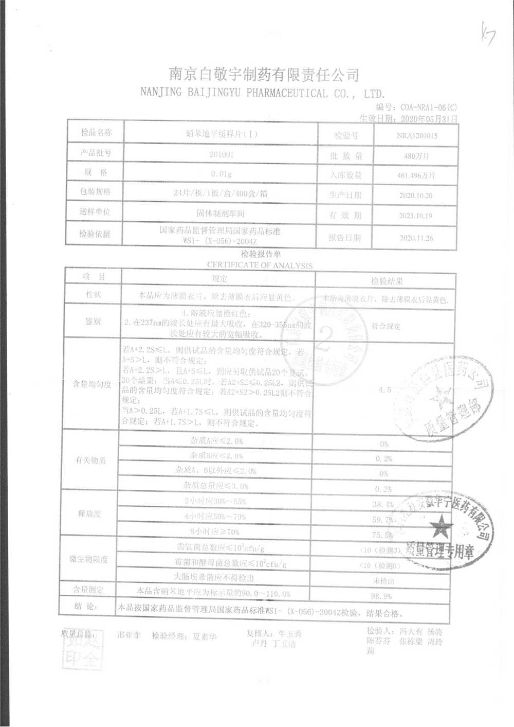 硝苯地平缓释片(I) | 0.01g*24片 | 191201 | 查看详情 |