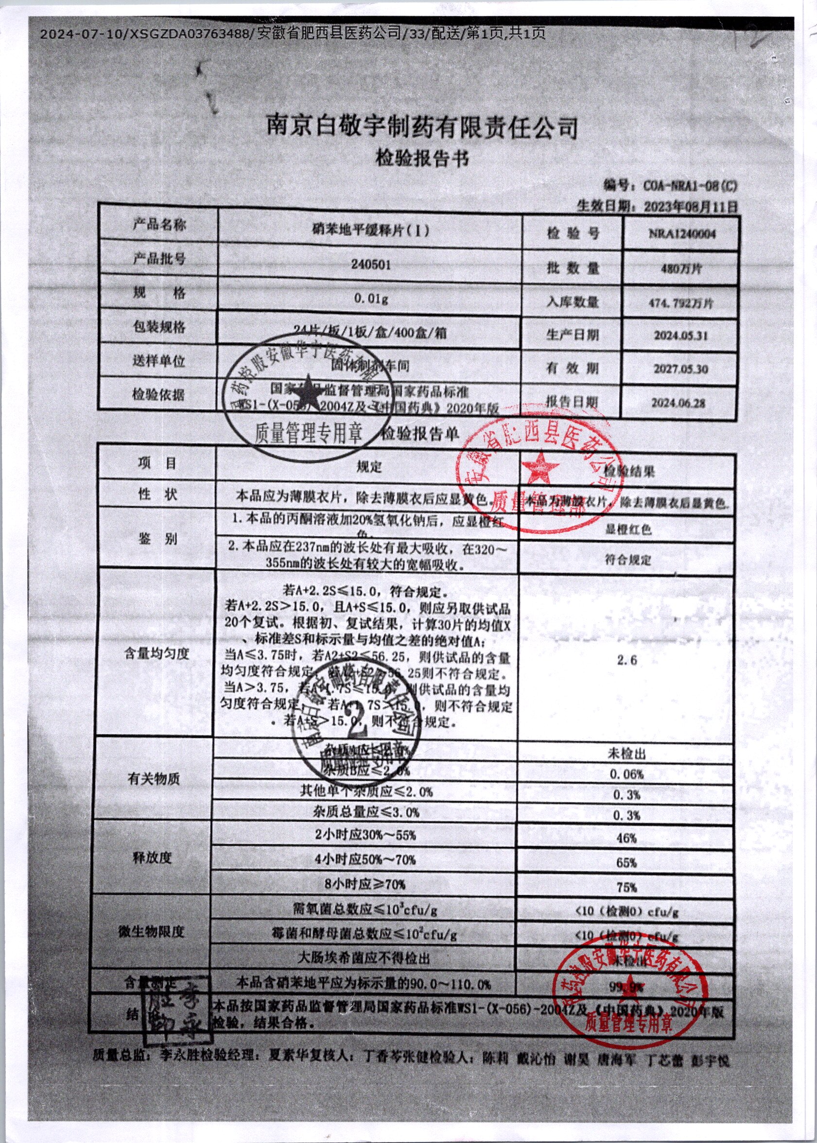 硝苯地平缓释片(I) | 0.01g*24片 | 240501 | 查看详情 |