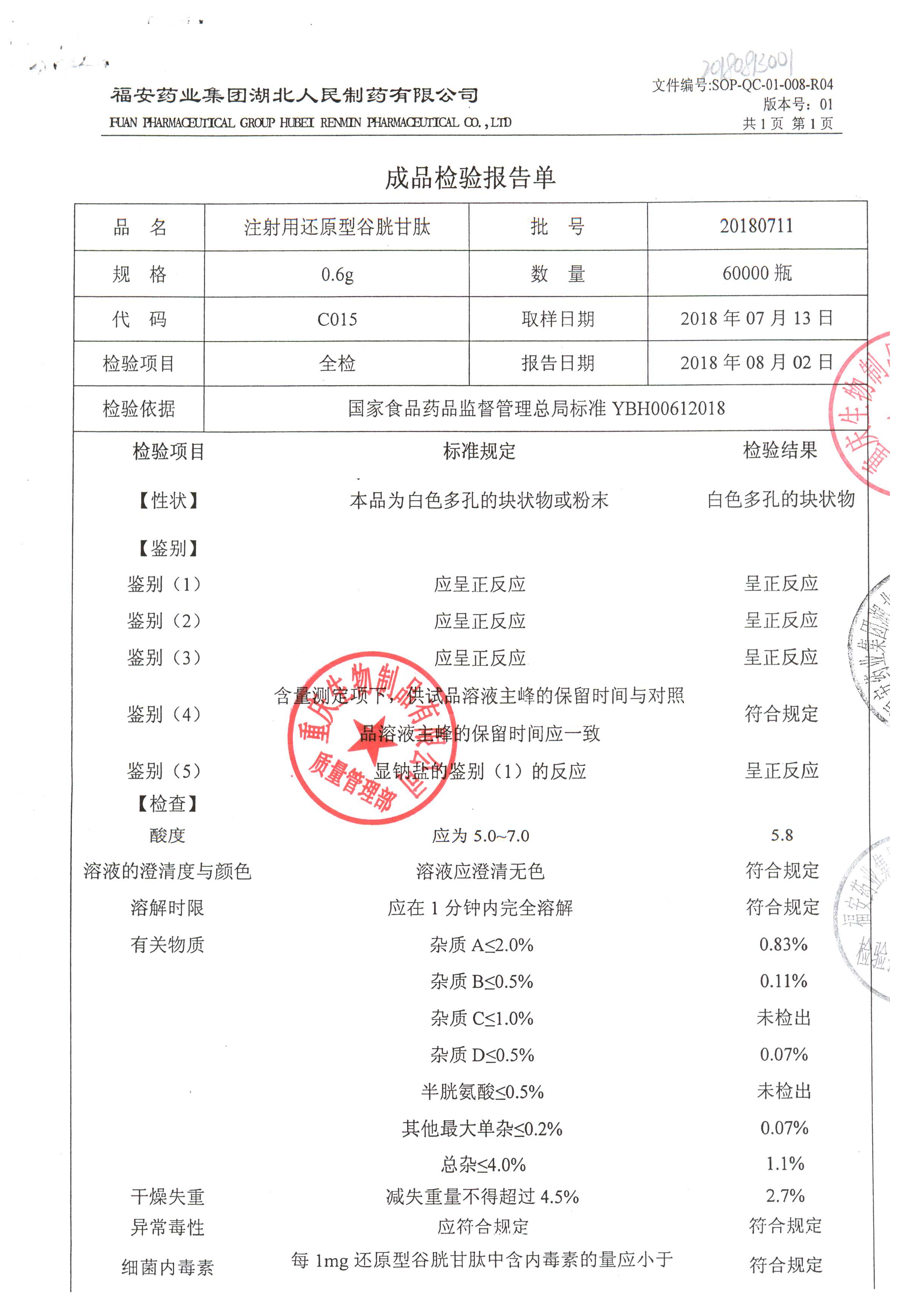 注射用还原型谷胱甘肽 | 0.6g | 20180711(1/2) | 查看详情 |