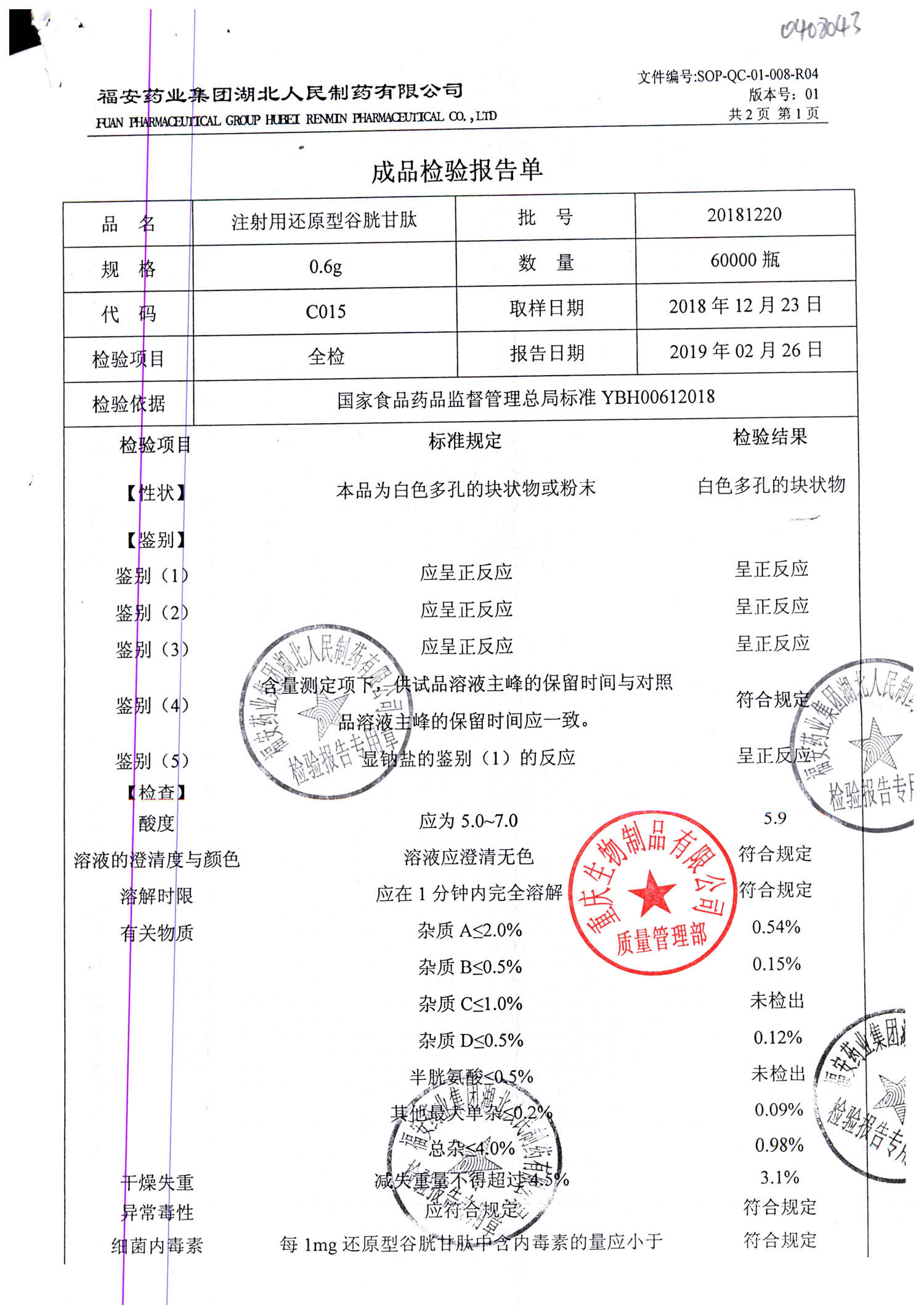 注射用还原型谷胱甘肽 | 0.6g | 20190601(1/2) | 查看详情 |