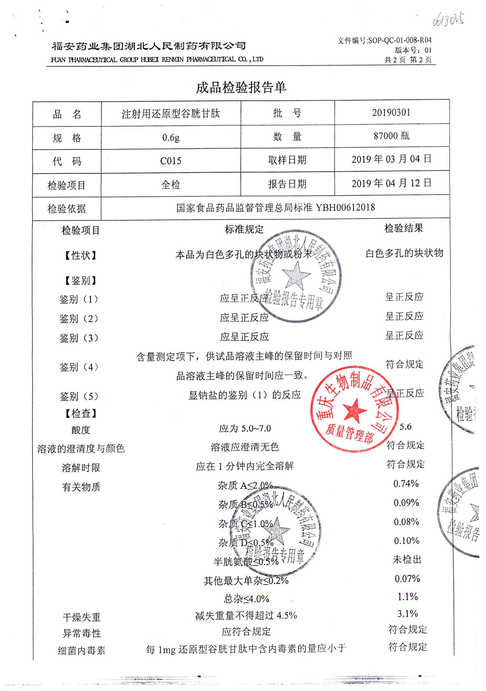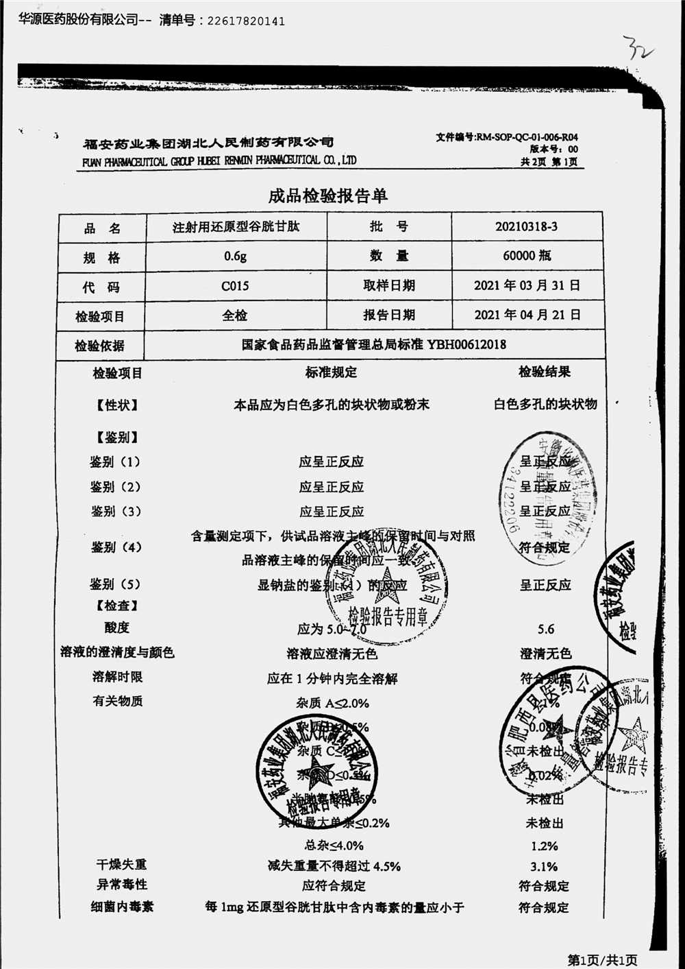注射用还原型谷胱甘肽 | 0.6g | 20210318-3(1/2) | 查看详情 |