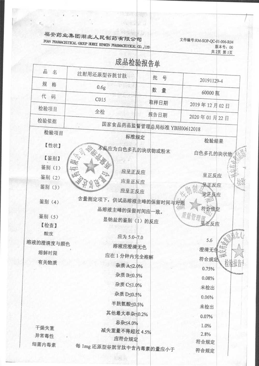 注射用还原型谷胱甘肽 | 0.6g | 20191129(2/2) | 查看详情 |