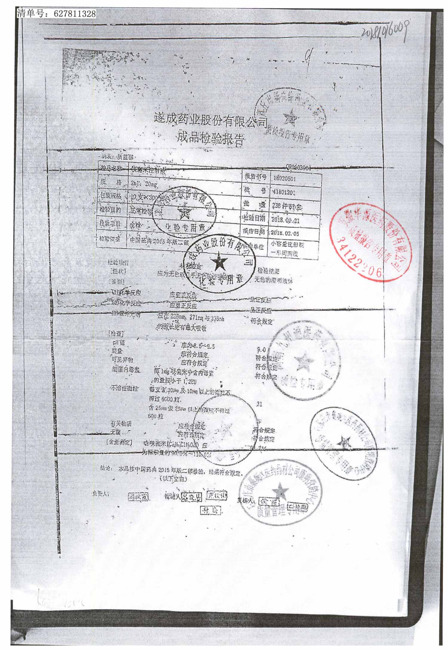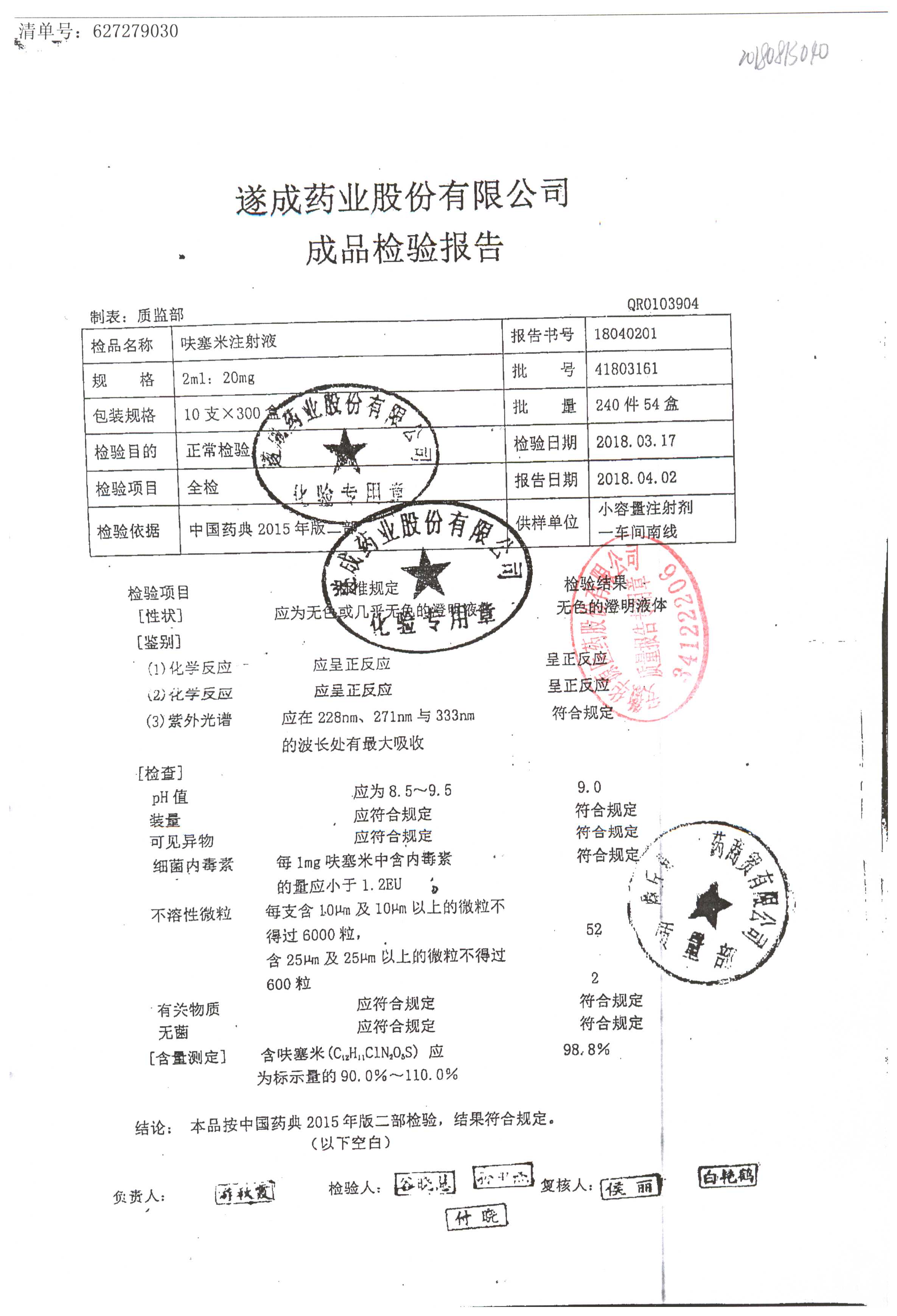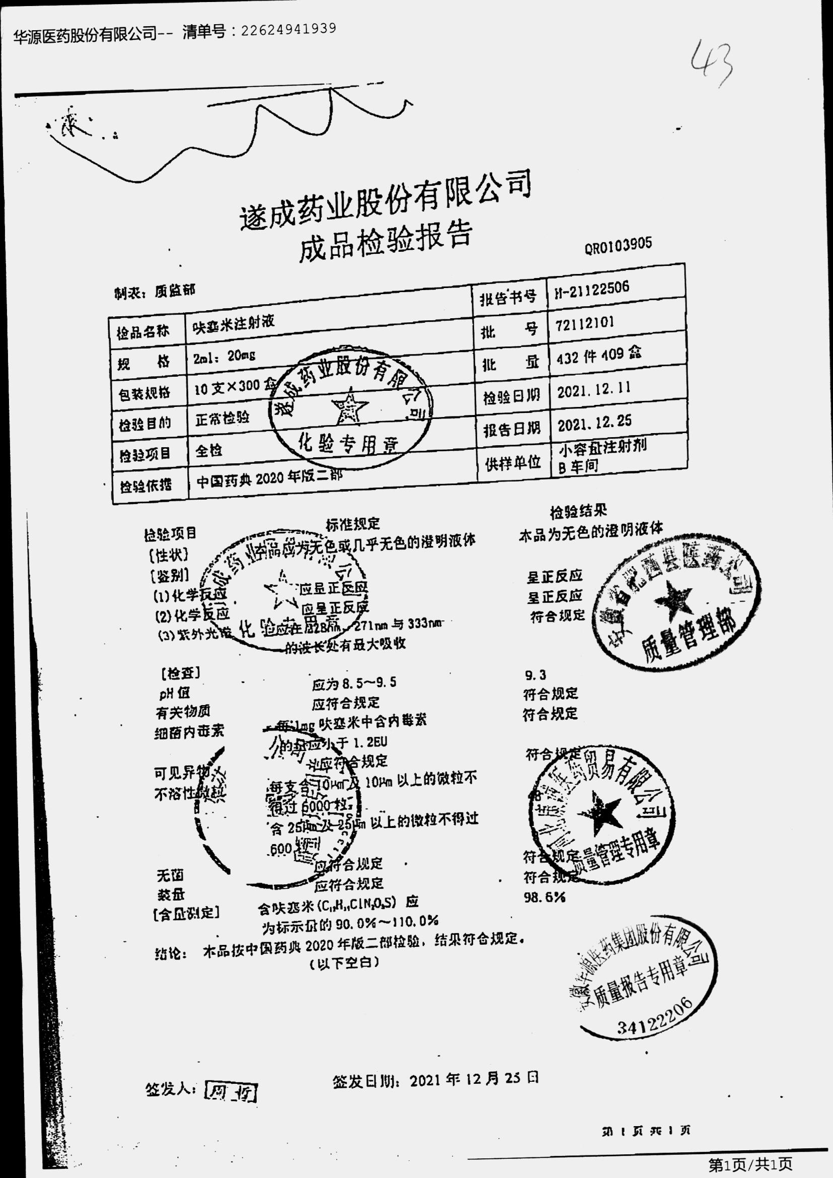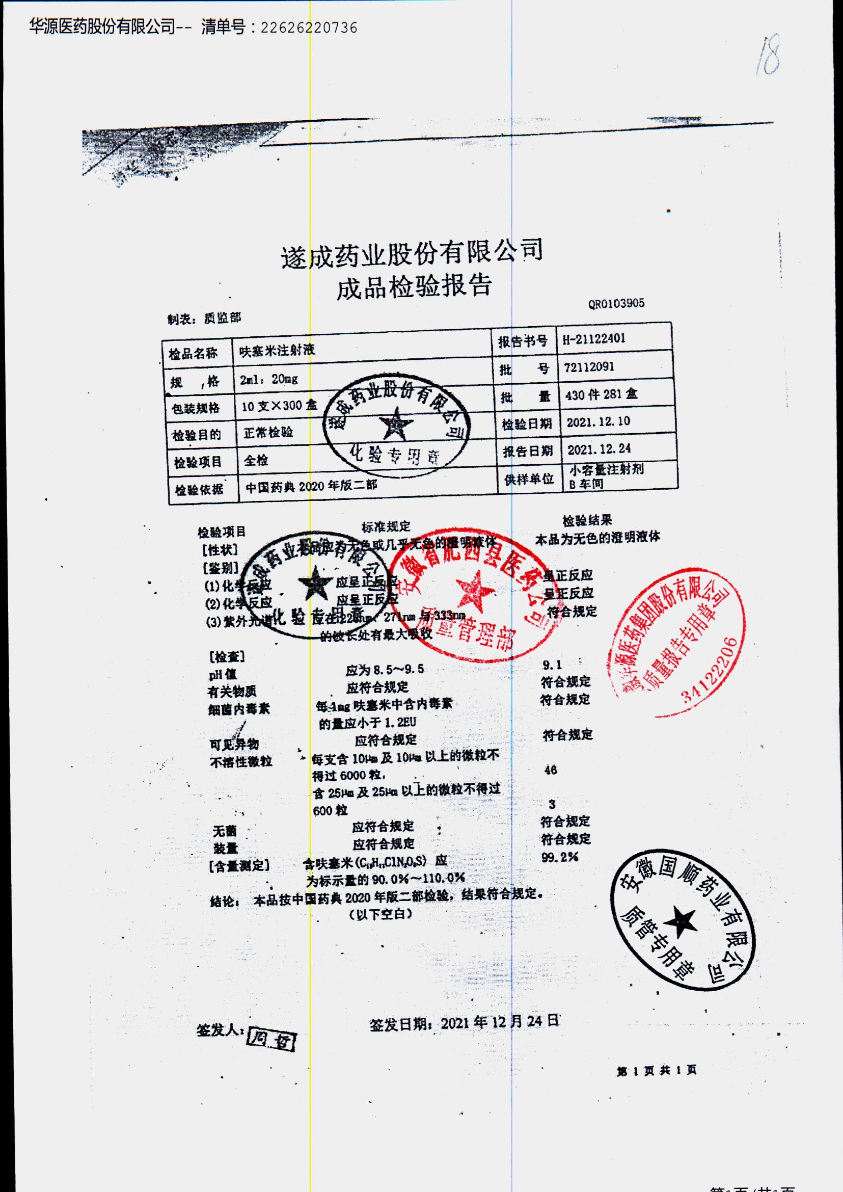 名称 | 规格 | 批号 | 药检报告 |