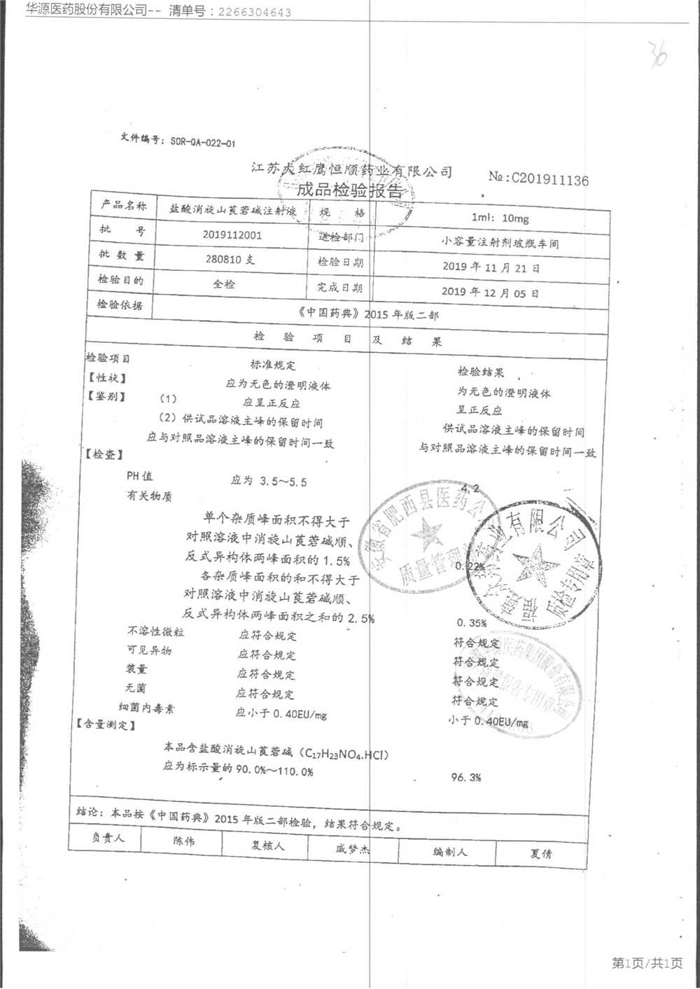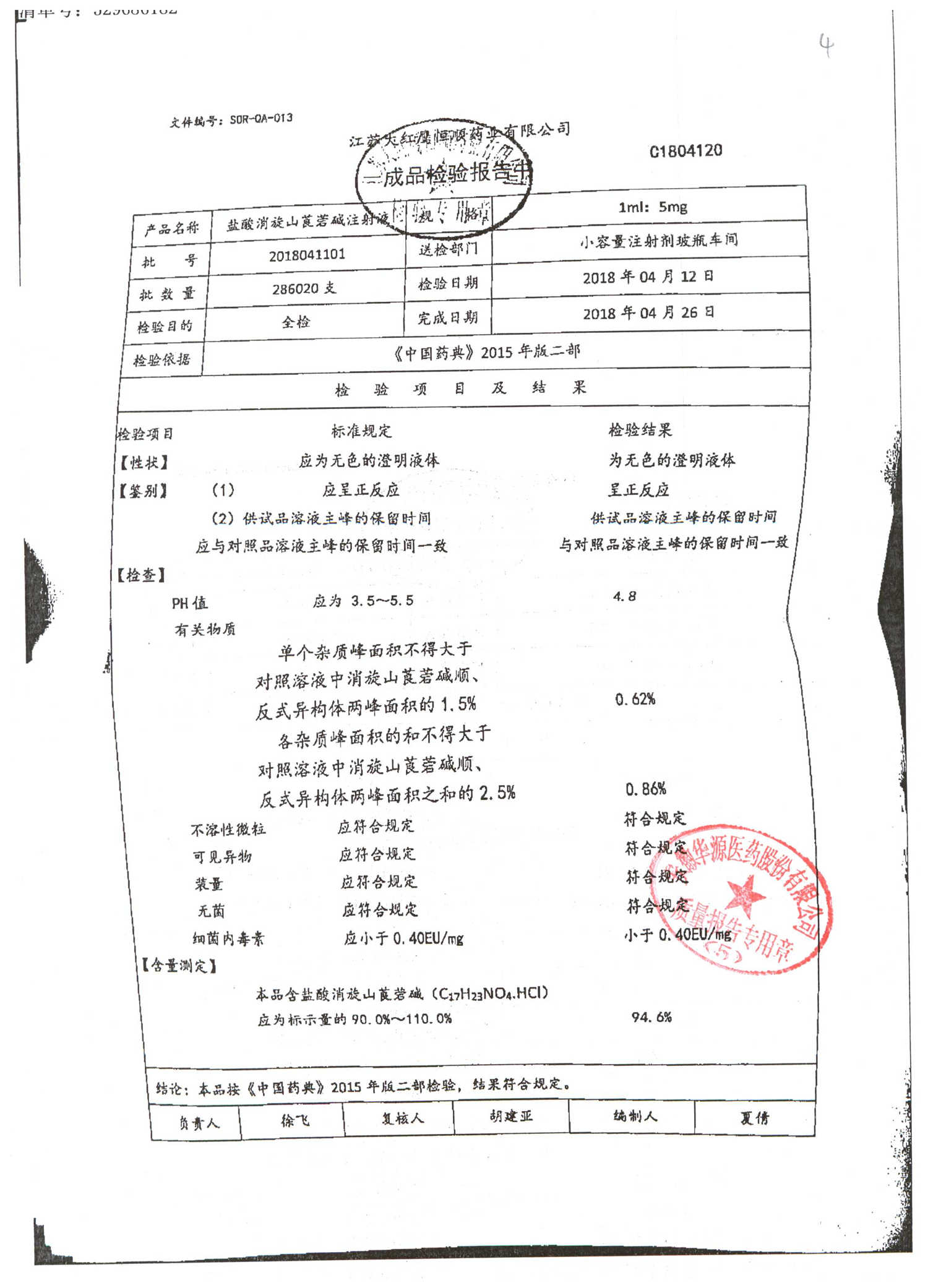 盐酸消旋山莨菪碱注射液 | 1ml:5mg | 20200910 | 查看详情 |