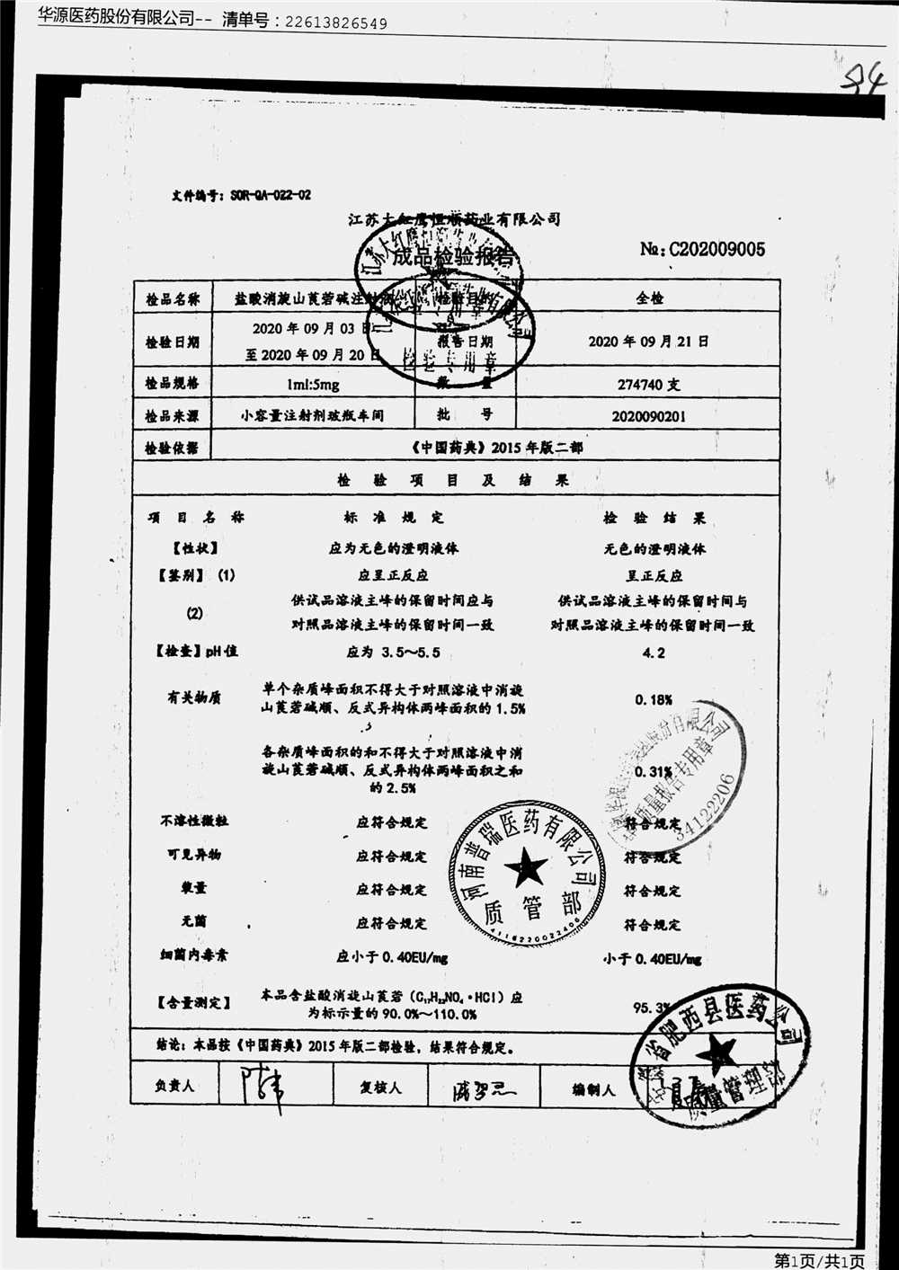 盐酸消旋山莨菪碱注射液 | 1ml:5mg | 2020090201 | 查看详情 |