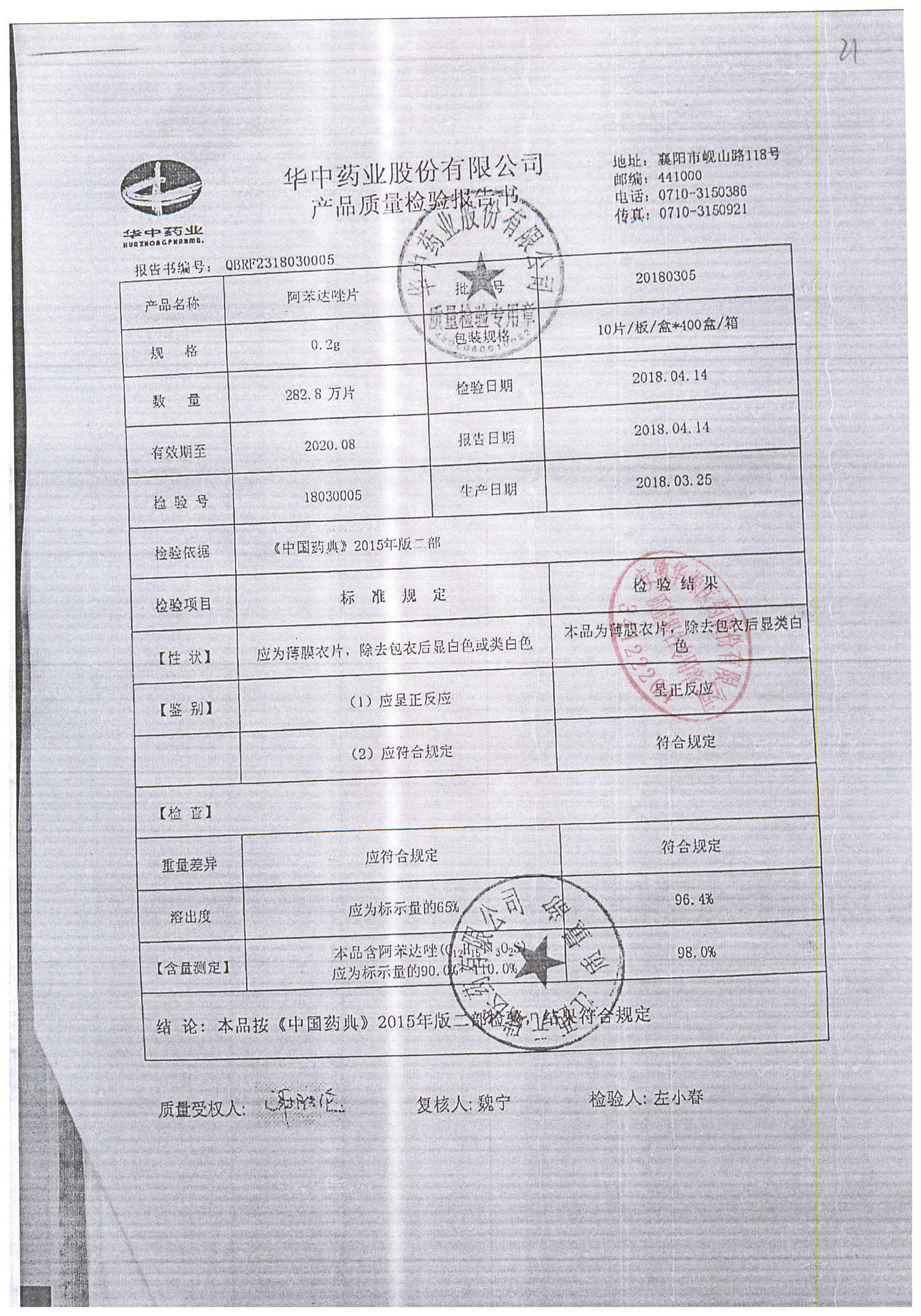 阿苯达唑片 | 0.2g*10片 | 20180305 | 查看详情 |