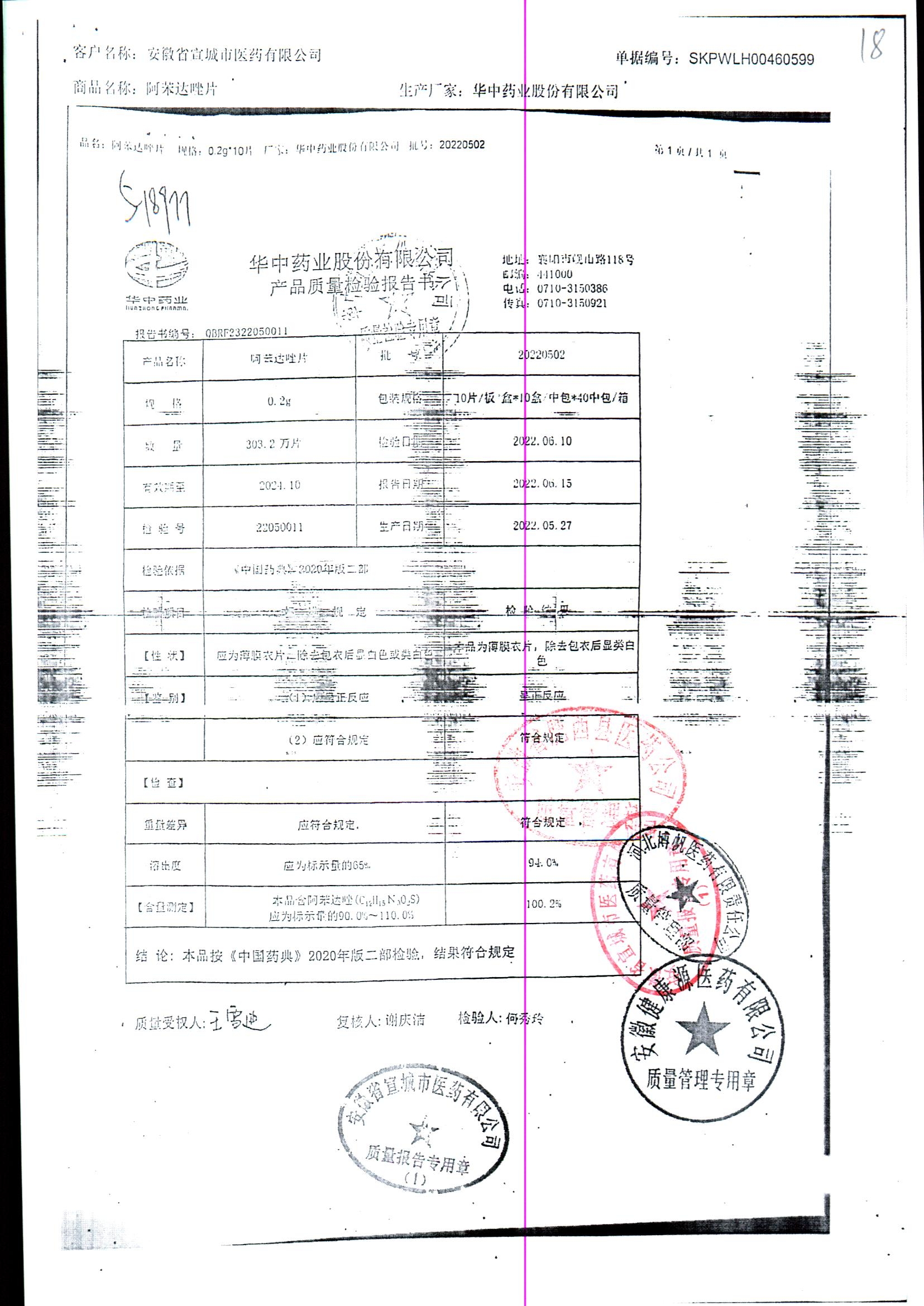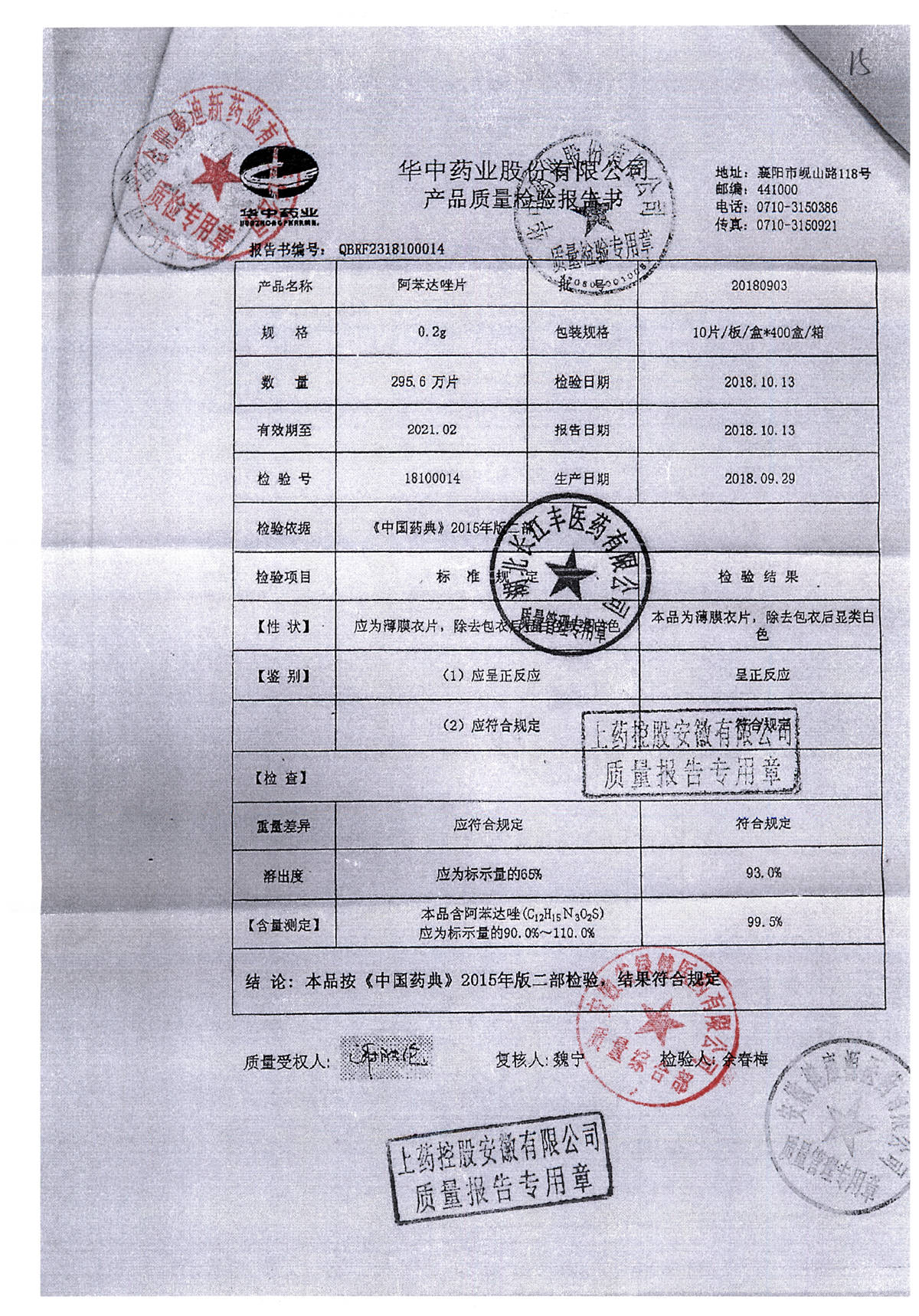 阿苯达唑片 | 0.2g*10片 | 20180903 | 查看详情 |