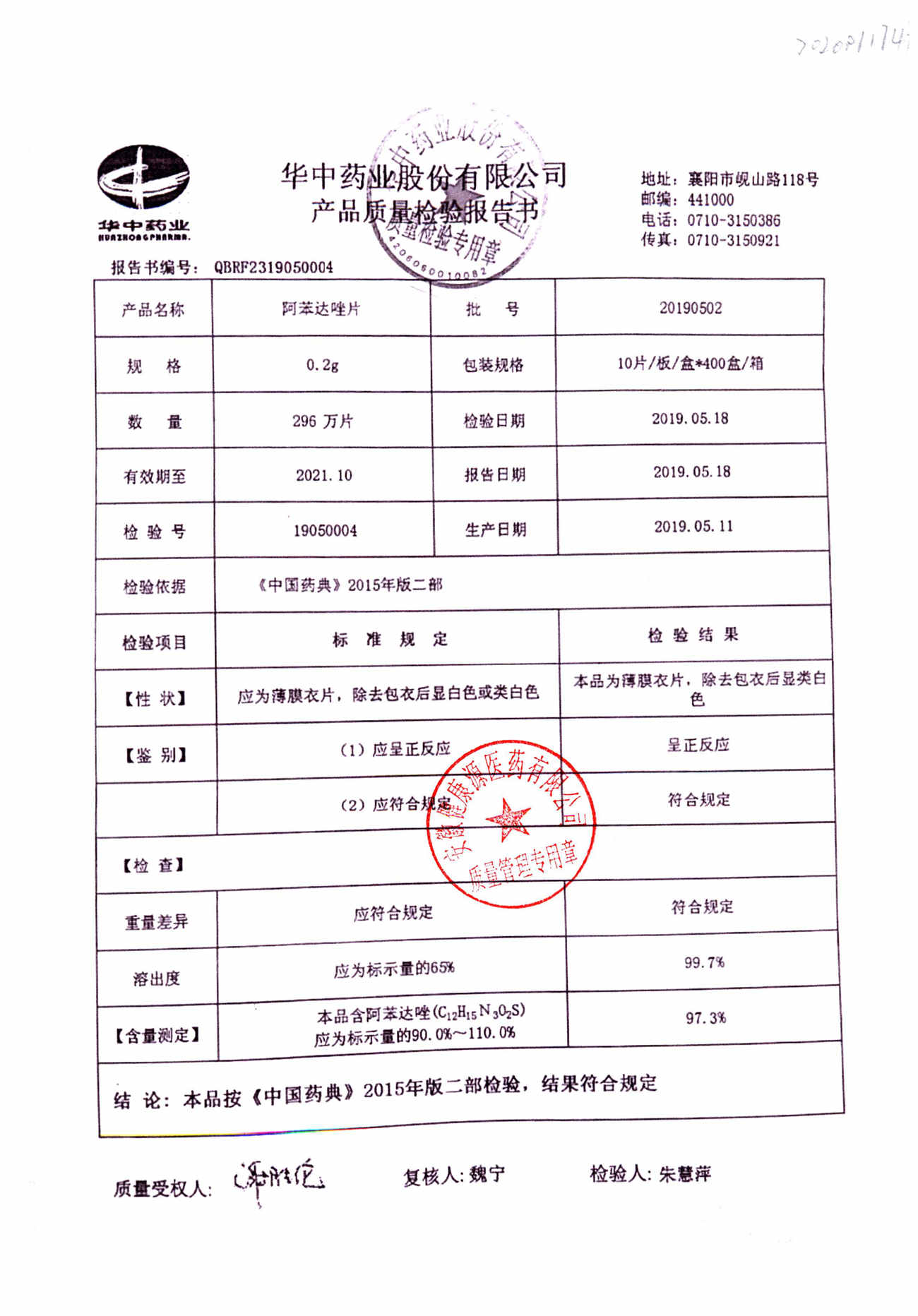 阿苯达唑片 | 0.2g*10片 | 20190502 | 查看详情 |