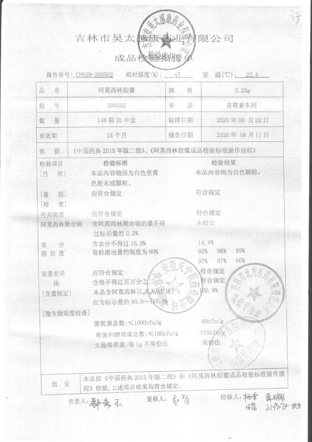 阿莫西林胶囊 | 0.25g | 200502 | 查看详情 |