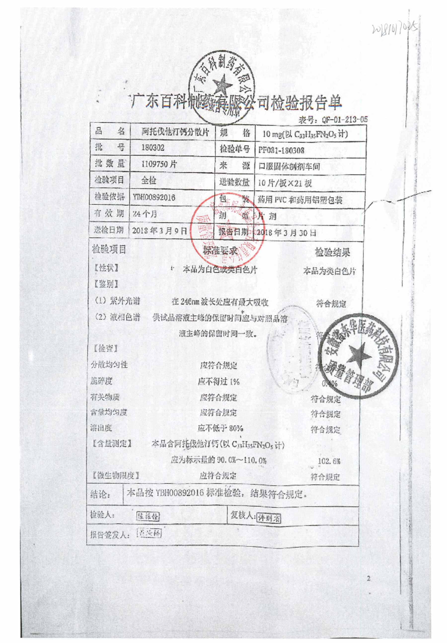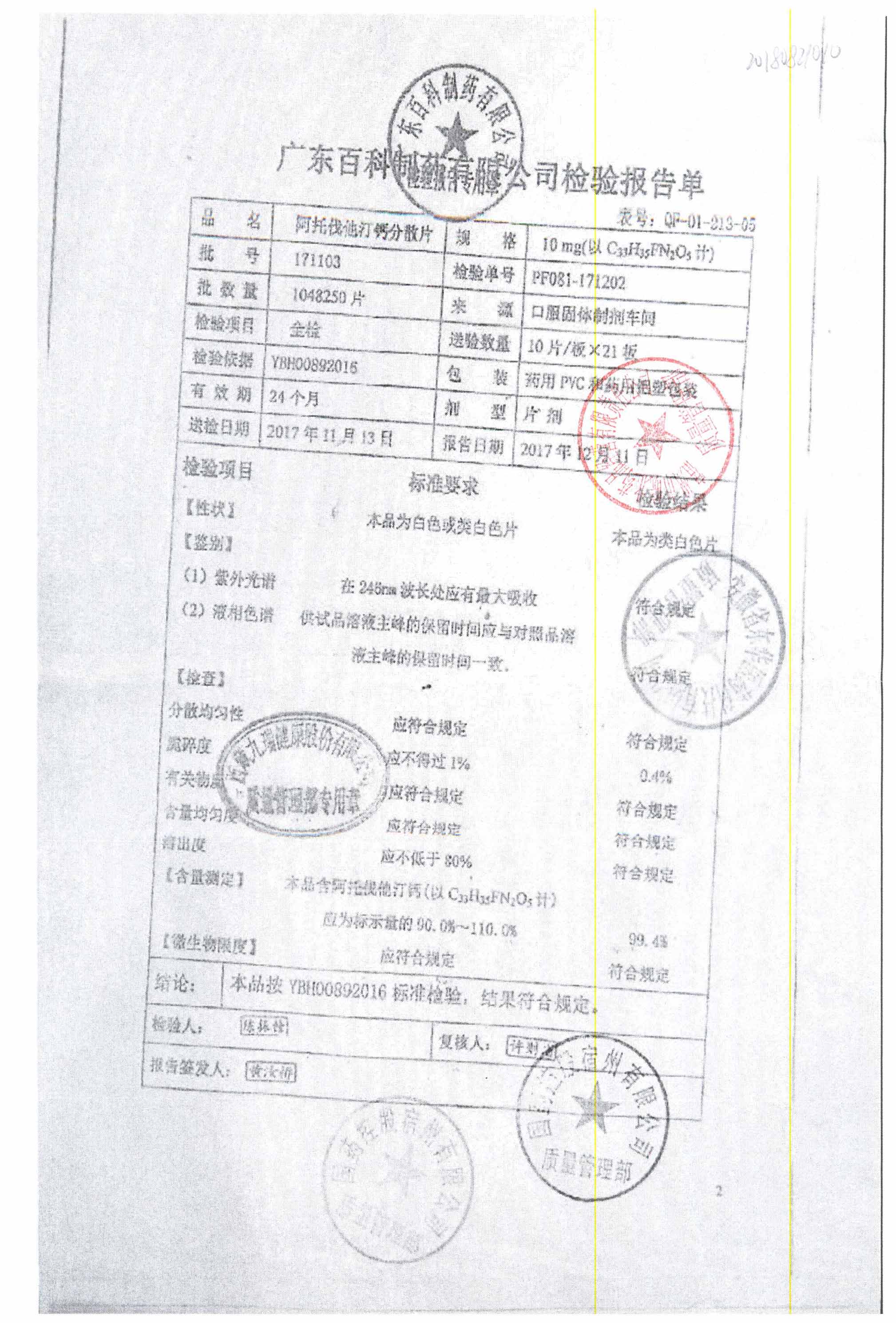 阿托伐他汀钙分散片 | 10mg*10片 | 180808 | 查看详情 |