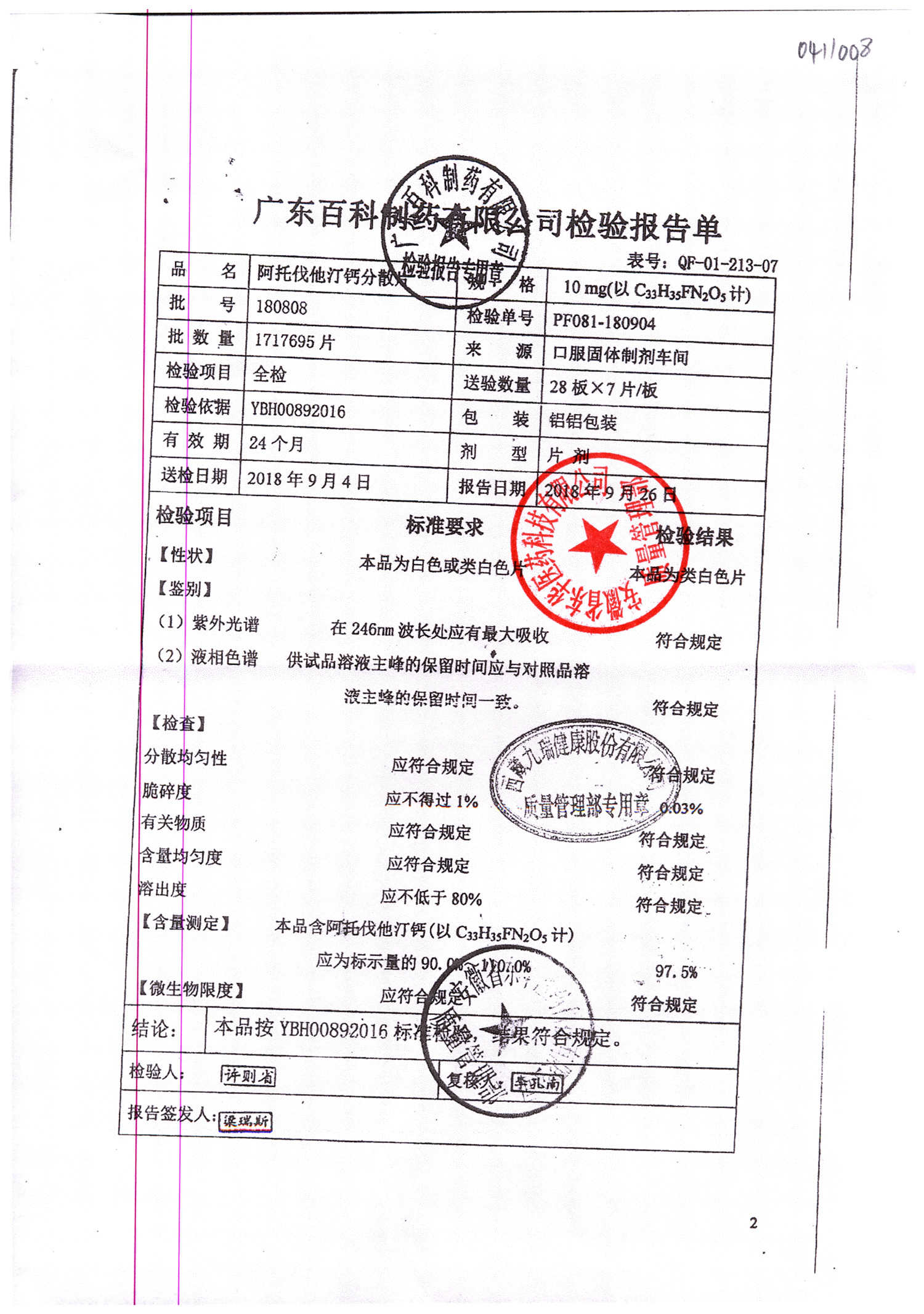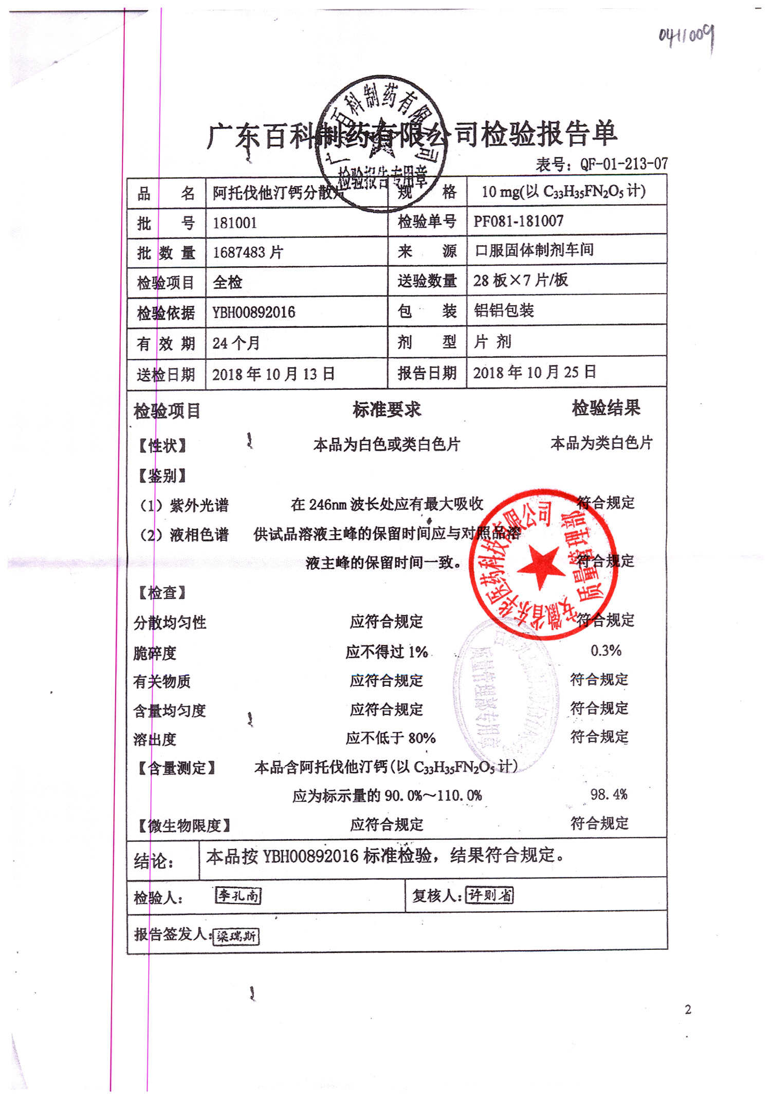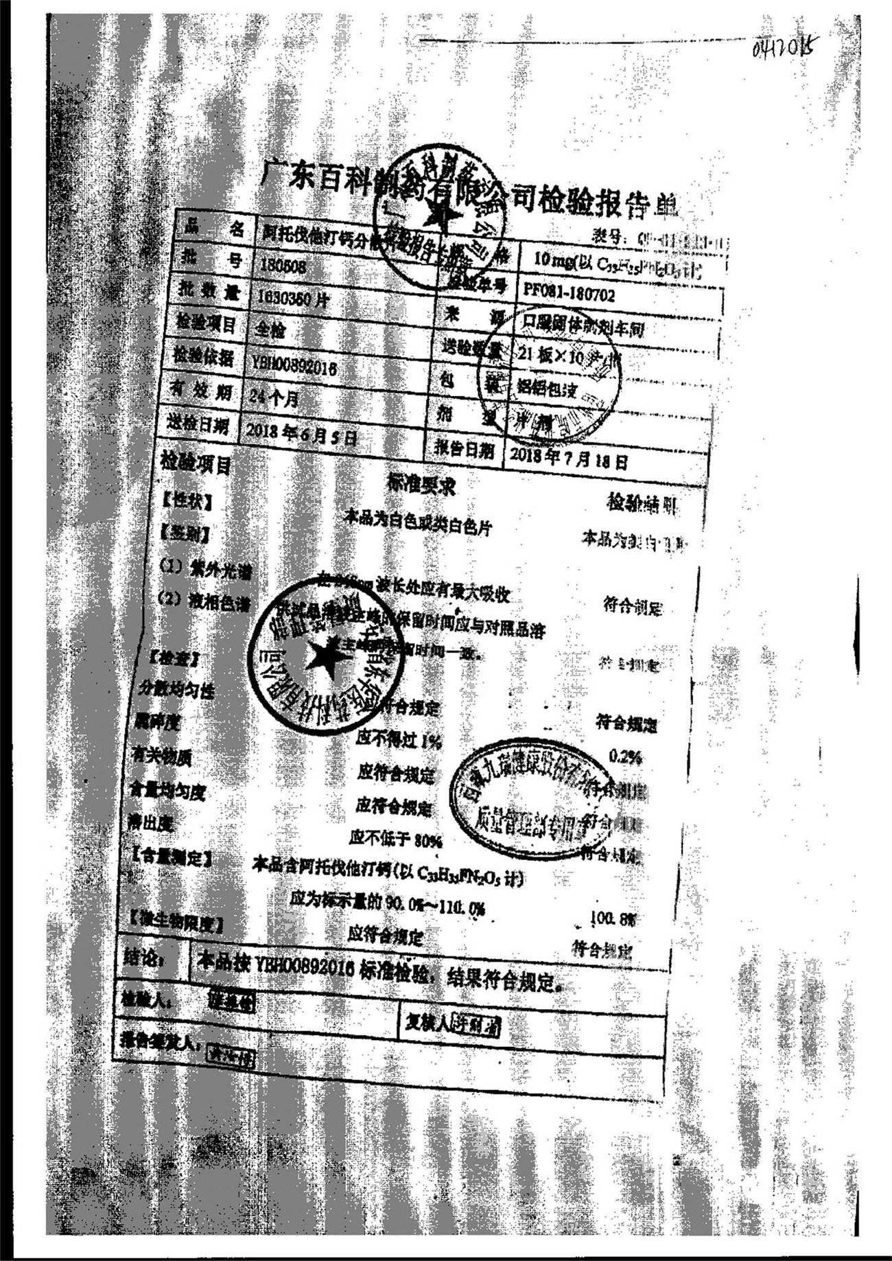 名称 | 规格 | 批号 | 药检报告 |