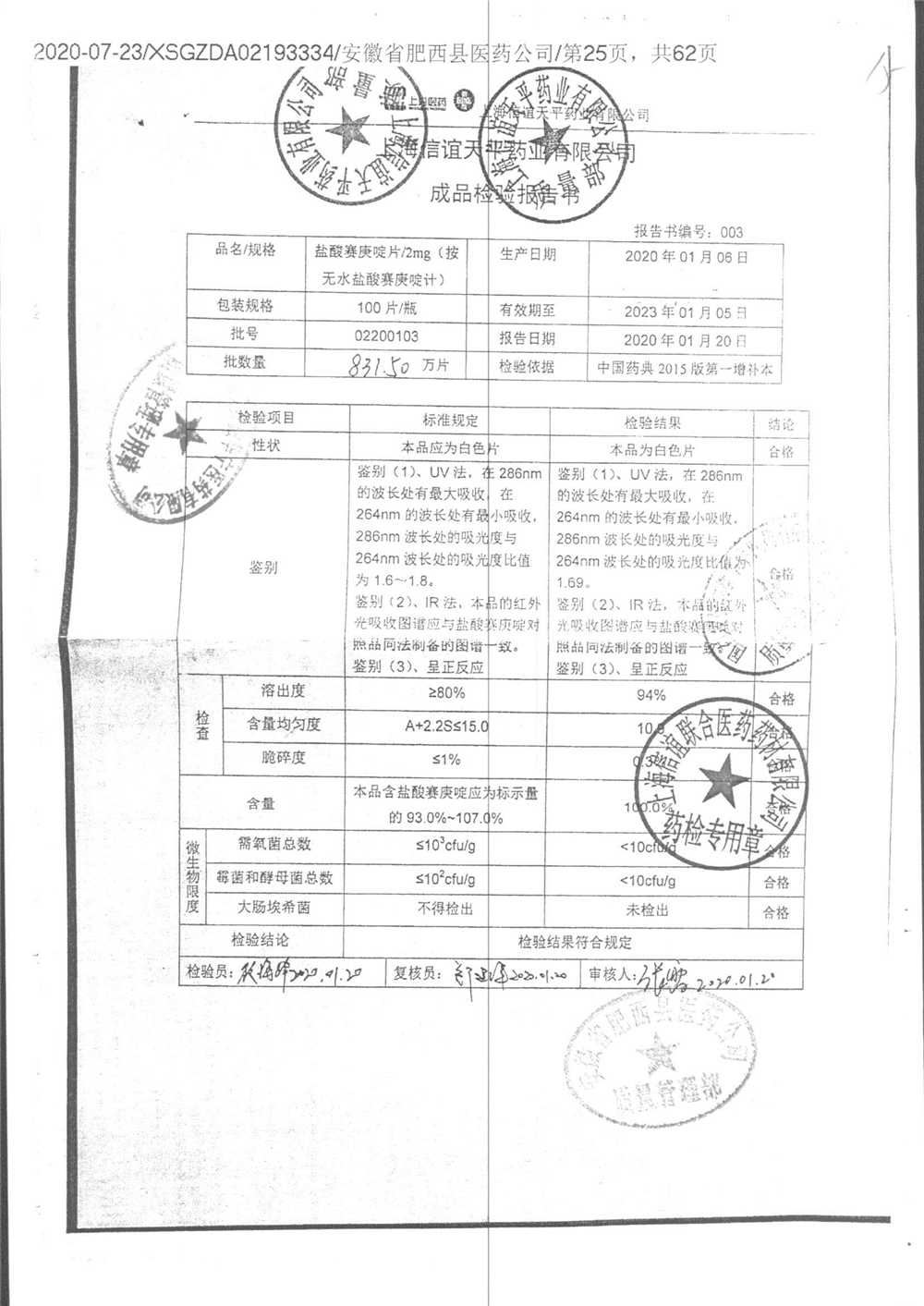 盐酸赛庚啶片 | 2mg*100片 | 02200103 | 查看详情 |