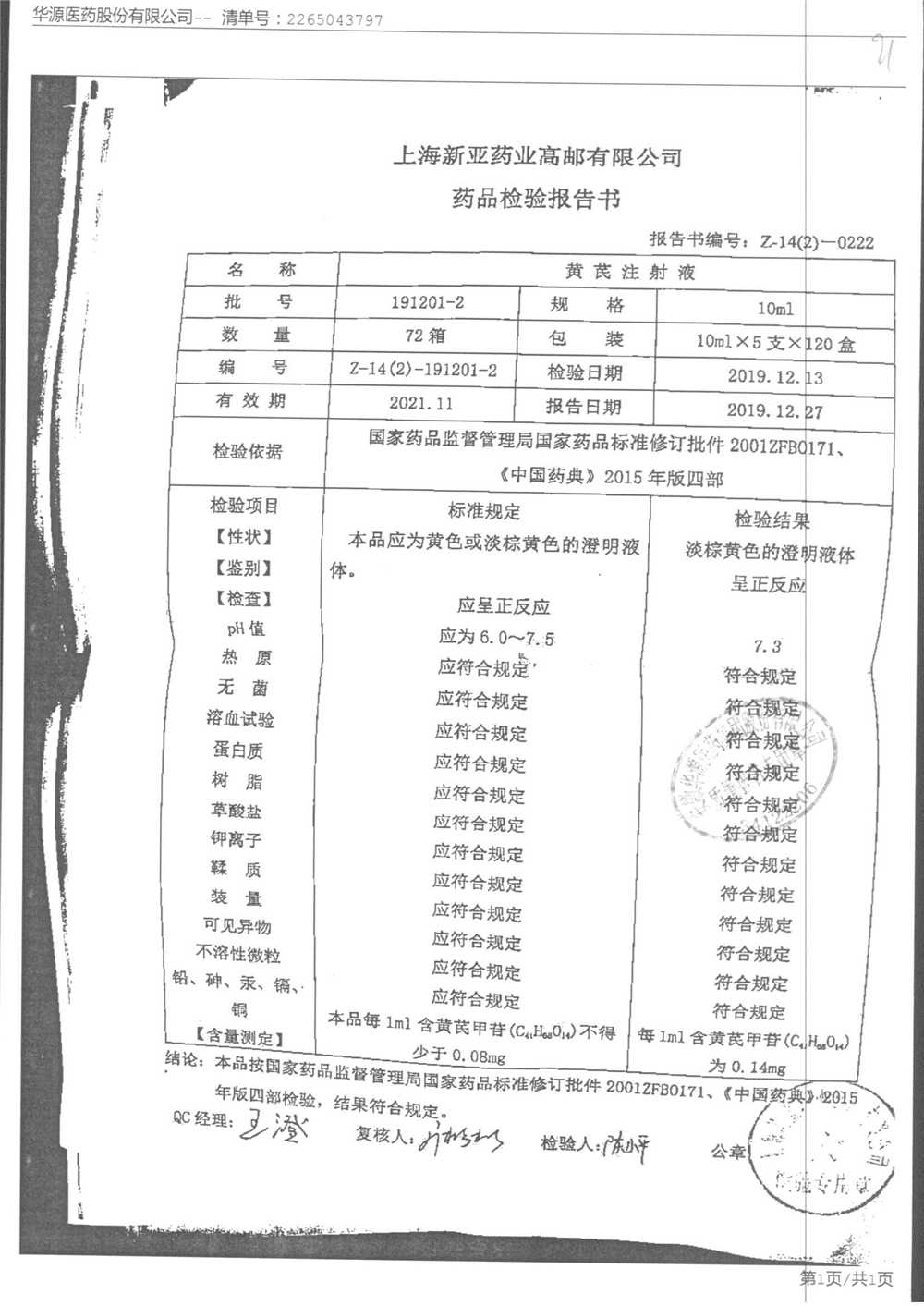 黄芪注射液 | 10ml | 191201-2 | 查看详情 |