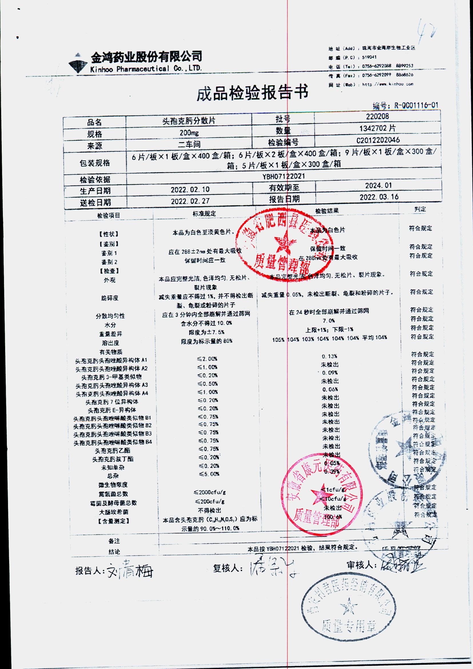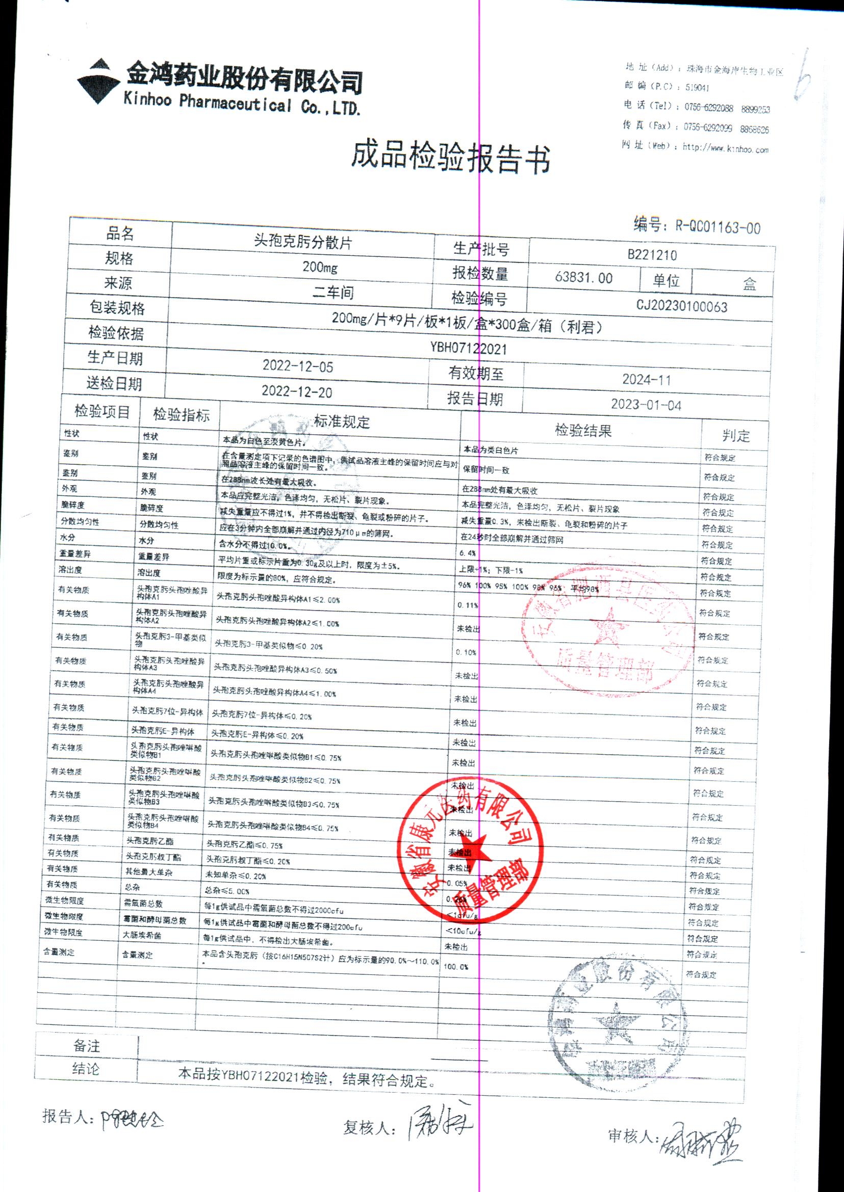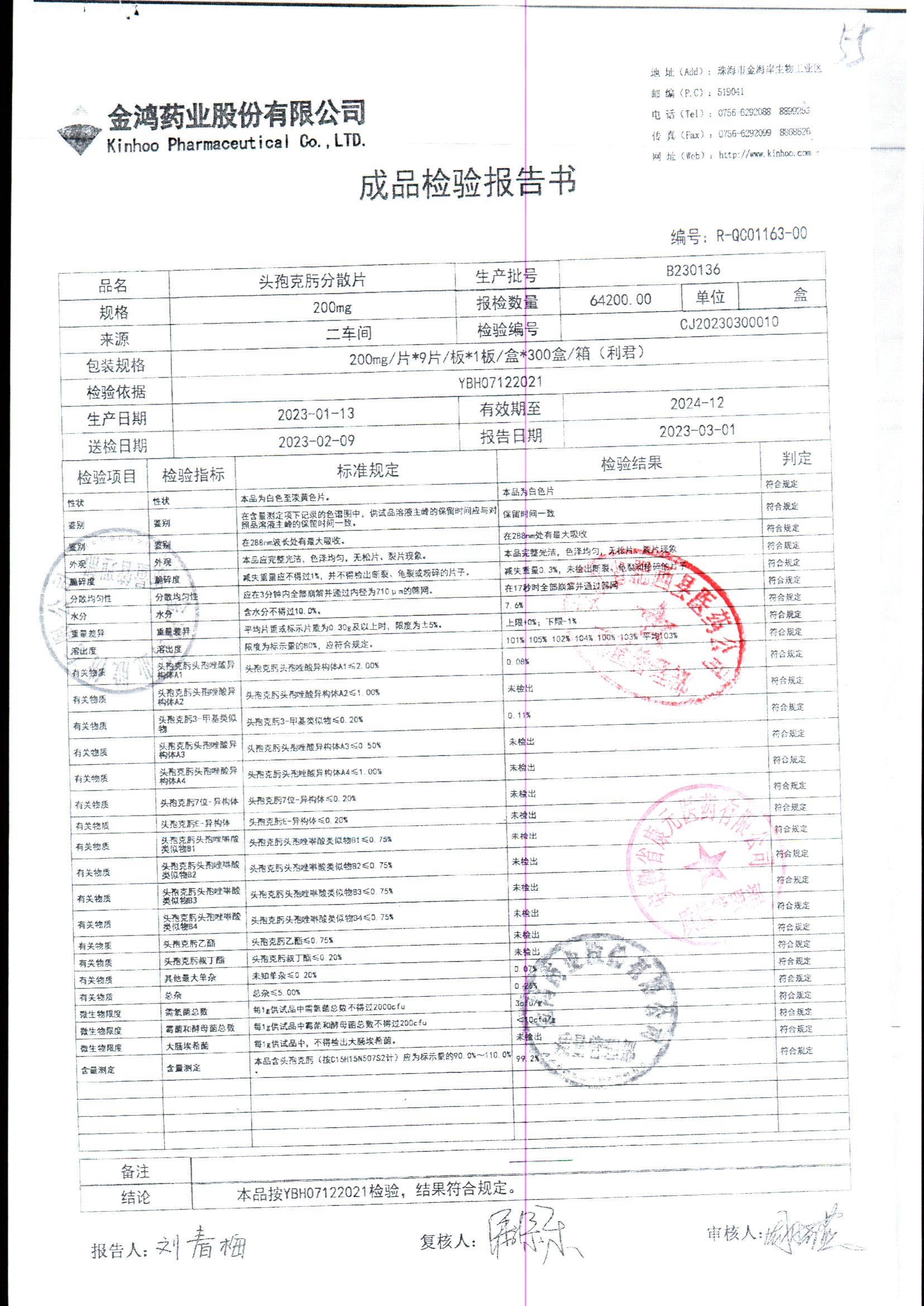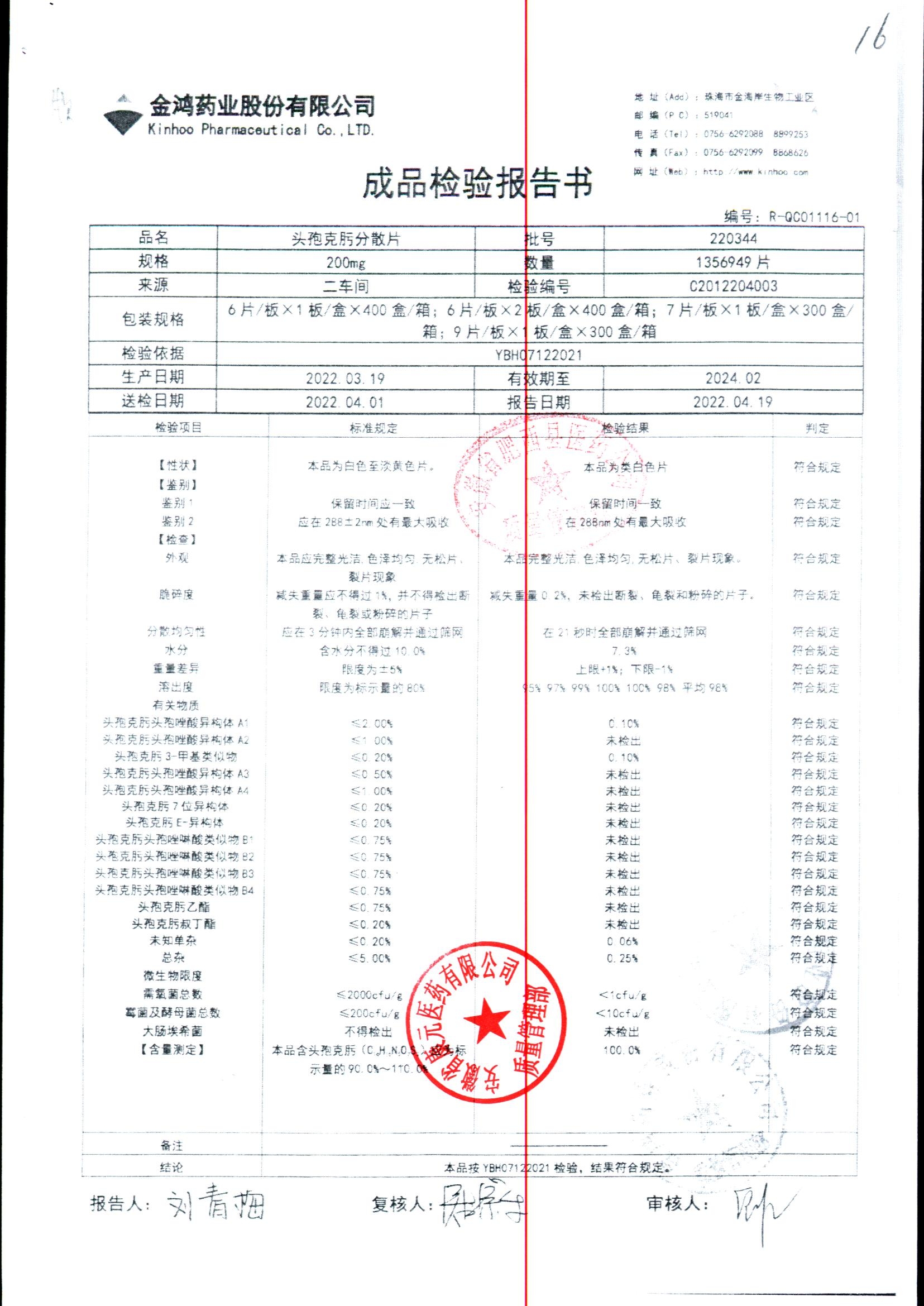 头孢克肟分散片 | 200mg | B221210 | 查看详情 |