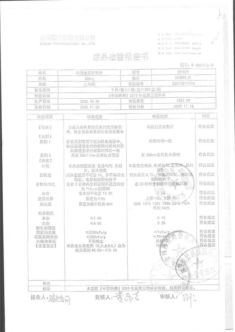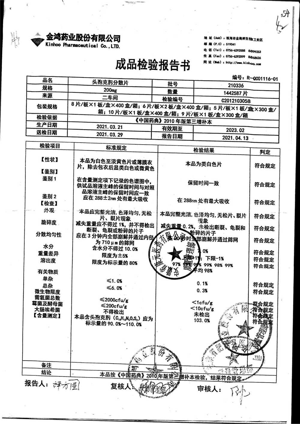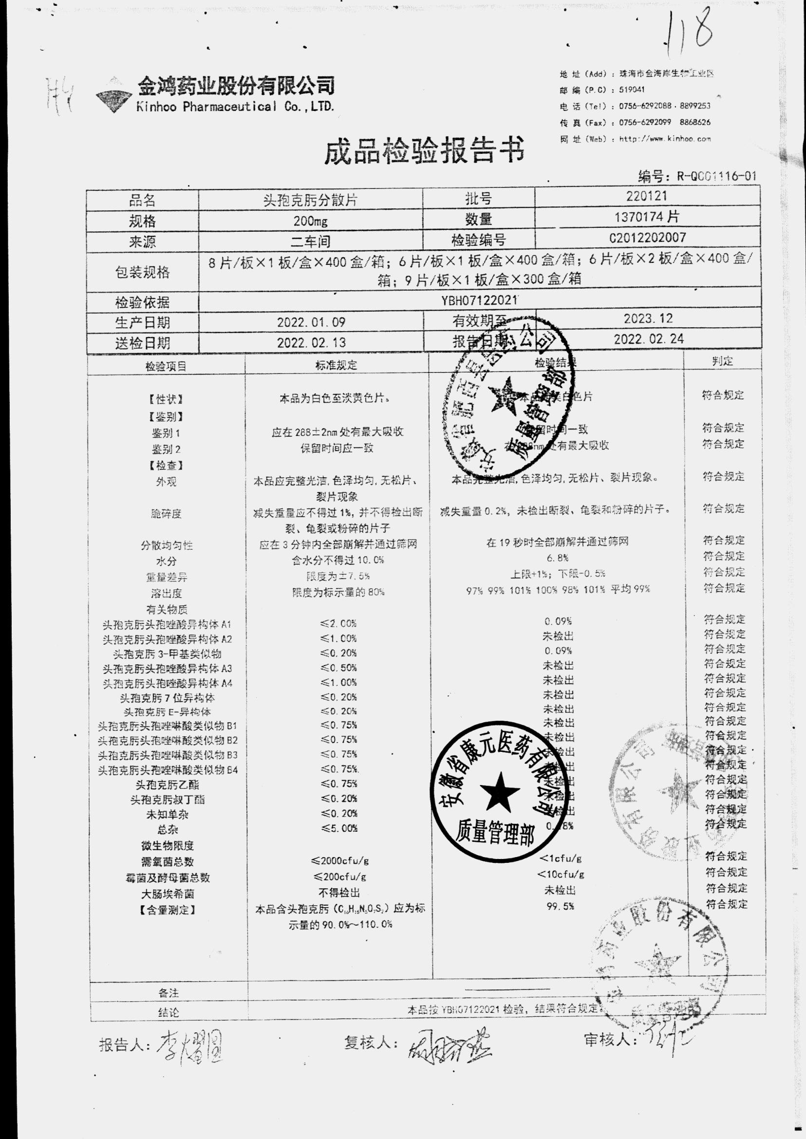 头孢克肟分散片 | 200mg | B221210 | 查看详情 |