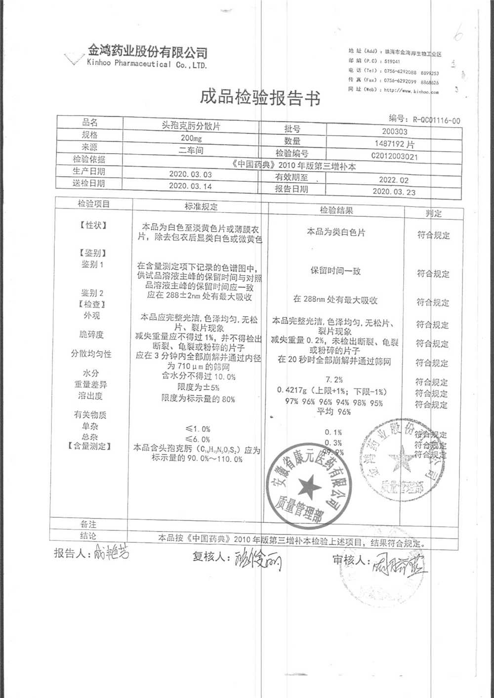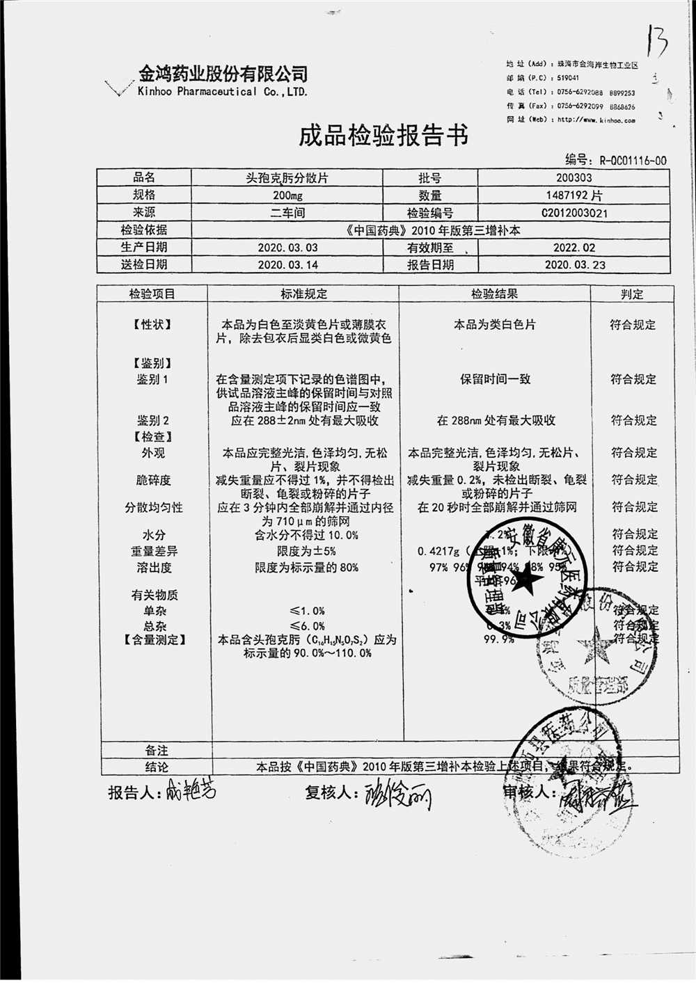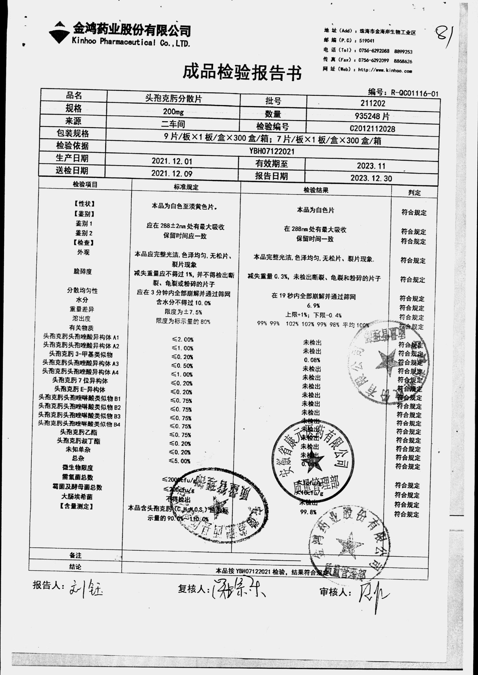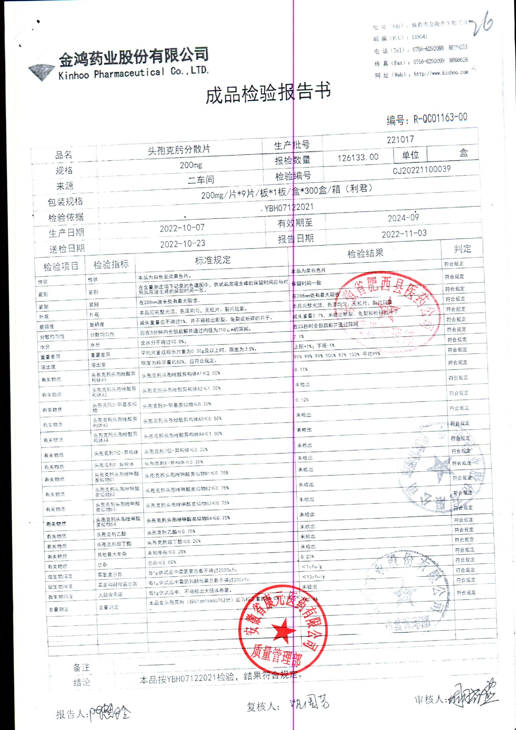 头孢克肟分散片 | 200mg | B221210 | 查看详情 |