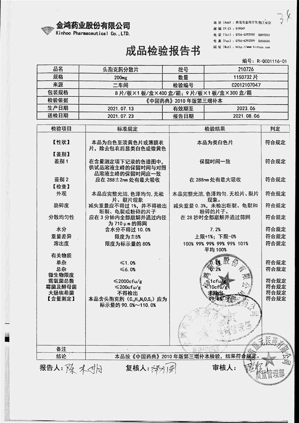 头孢克肟分散片 | 200mg | 210726 | 查看详情 |