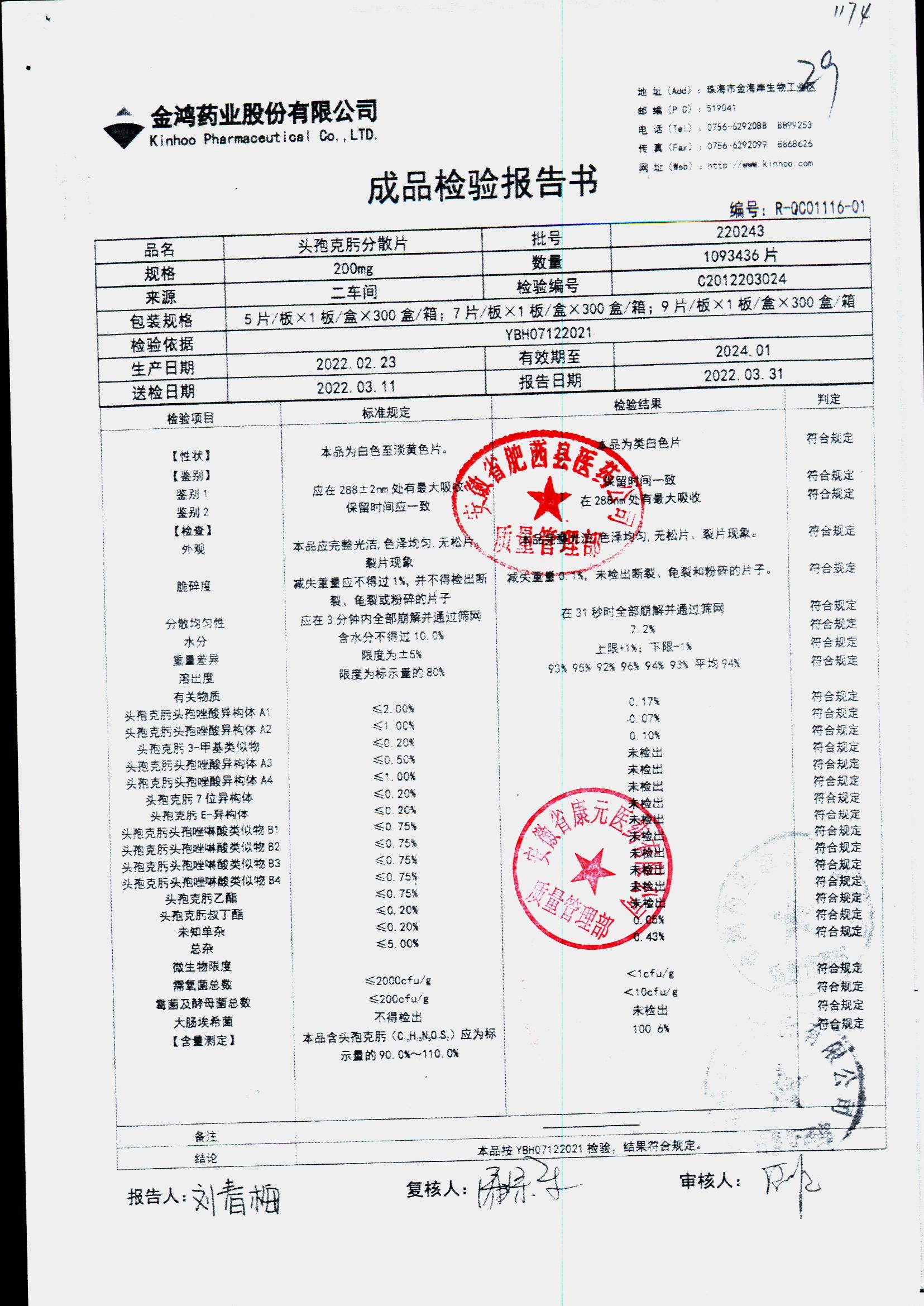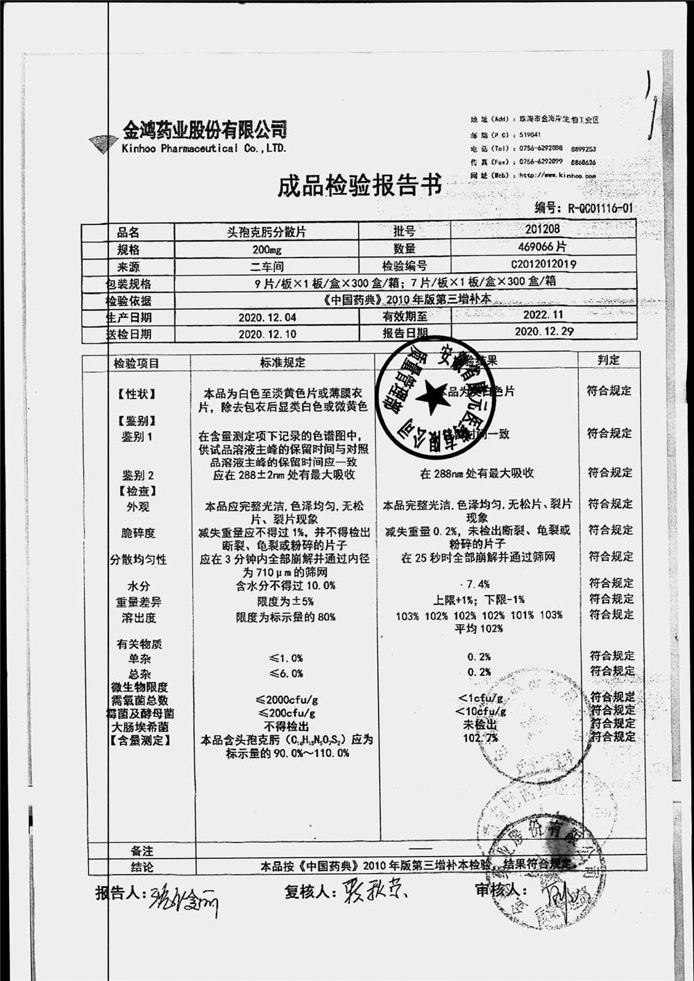 头孢克肟分散片 | 200mg | 220208 | 查看详情 |