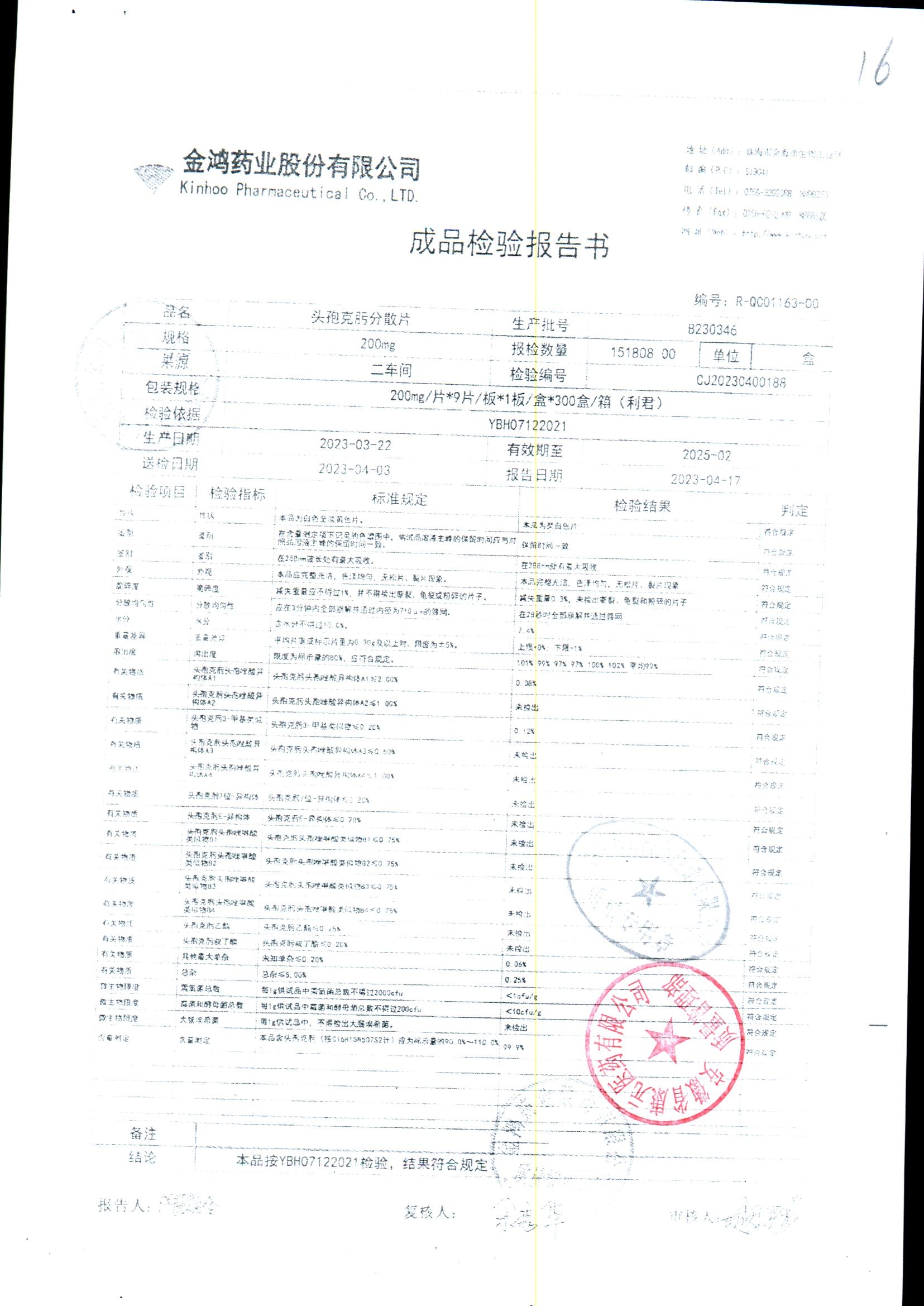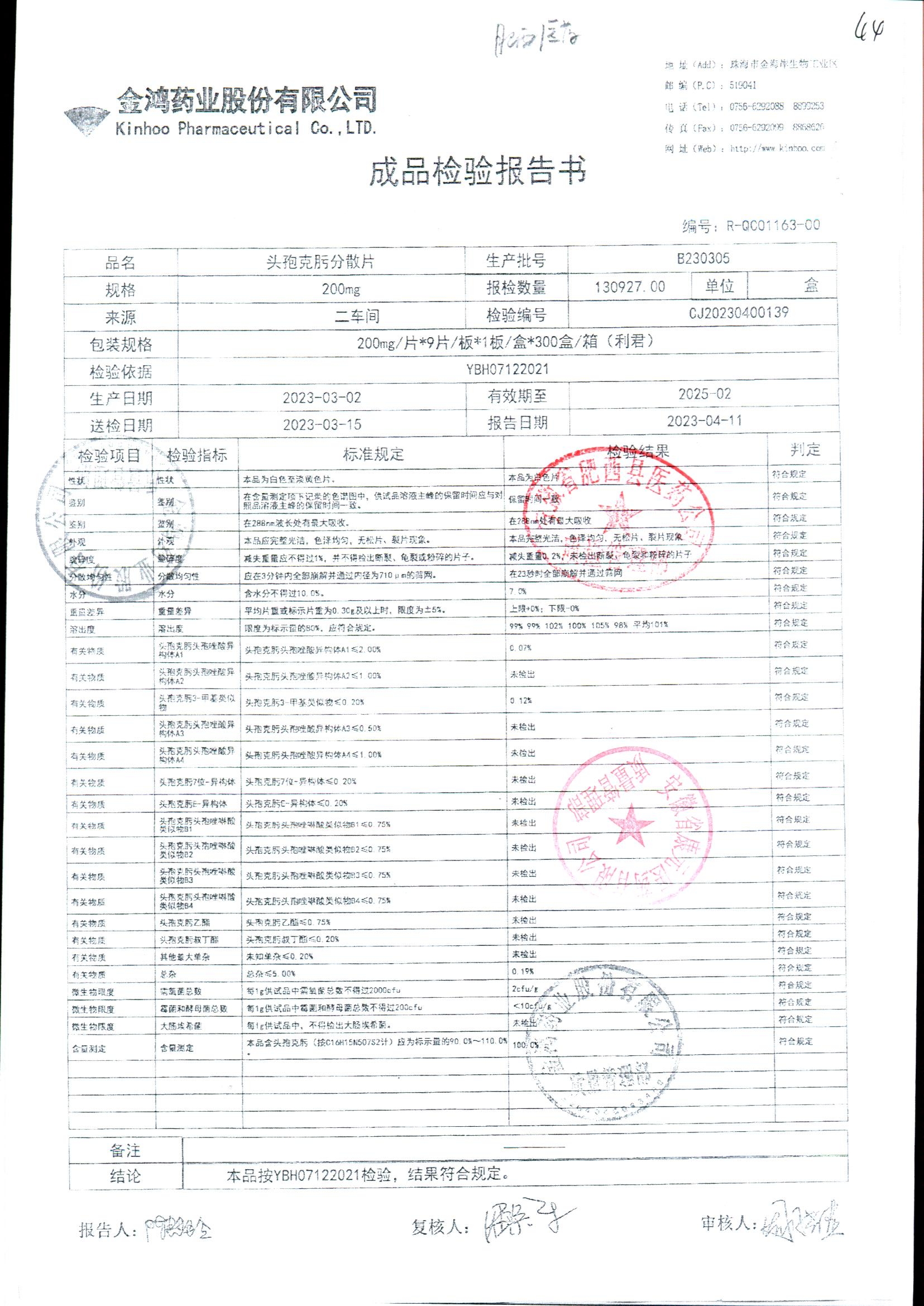 头孢克肟分散片 | 200mg | B230305 | 查看详情 |