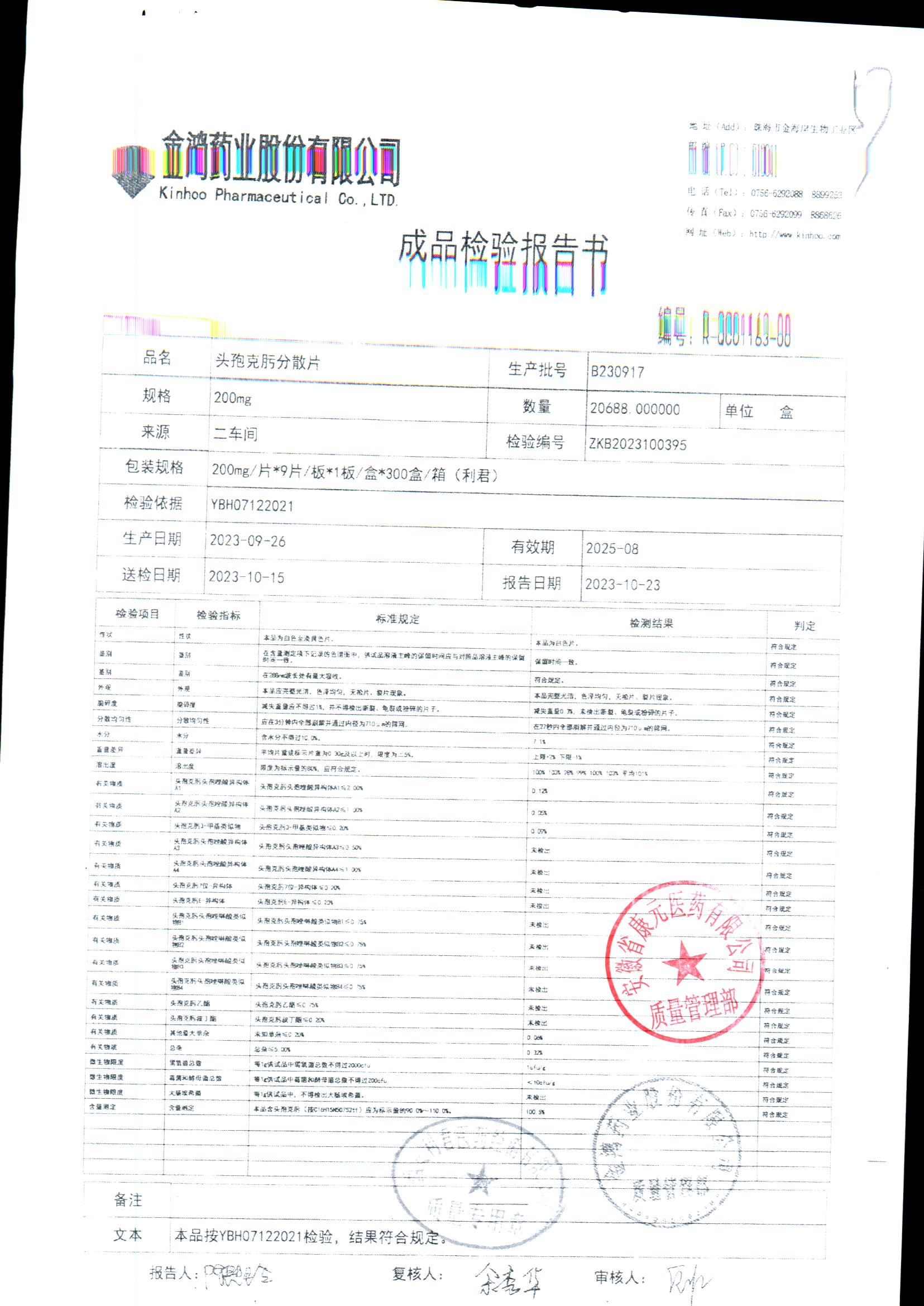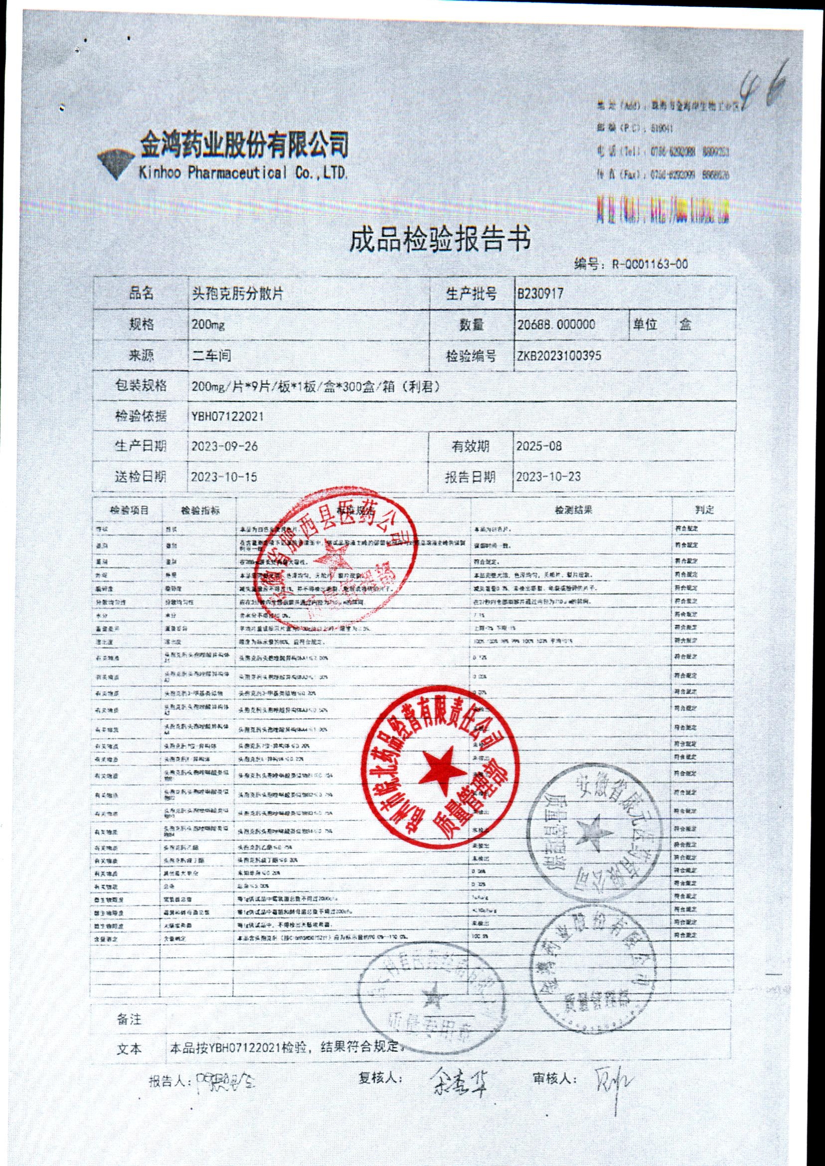 头孢克肟分散片 | 200mg | B230917 | 查看详情 |