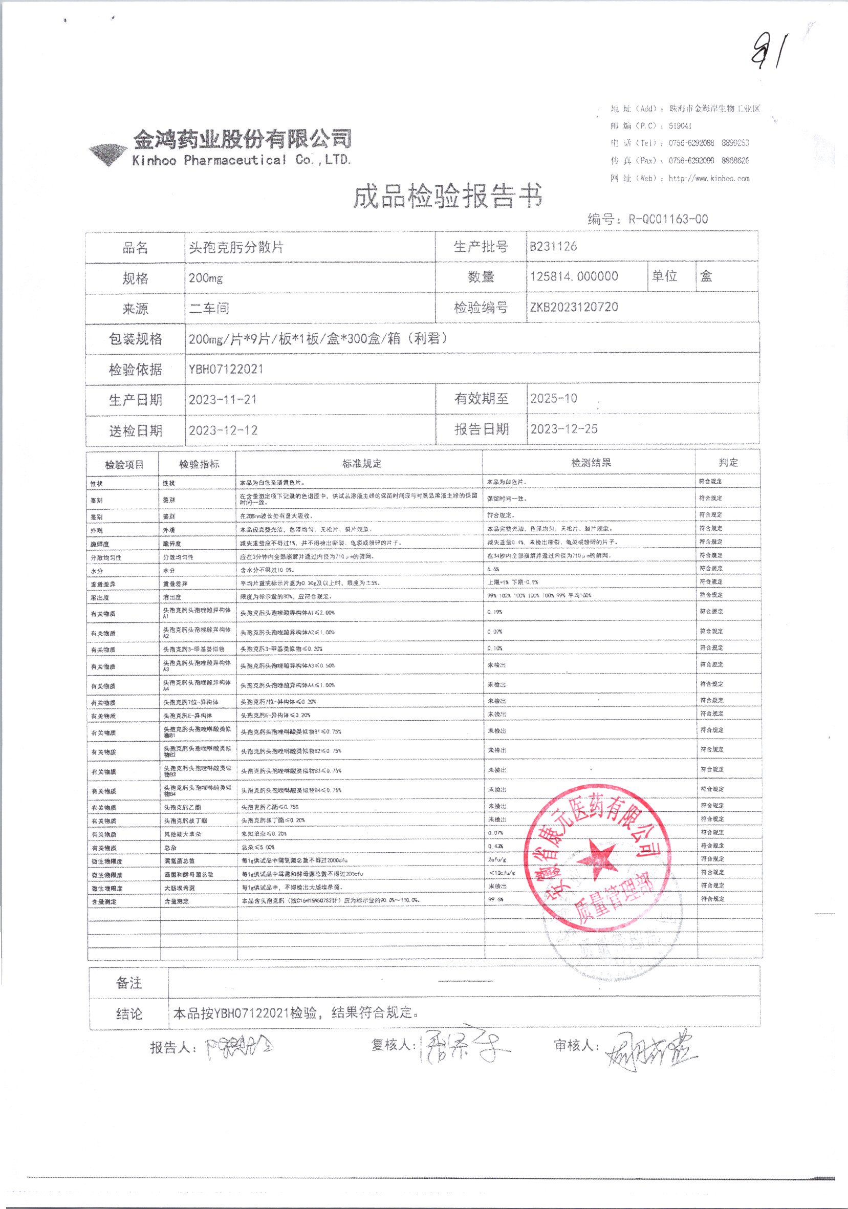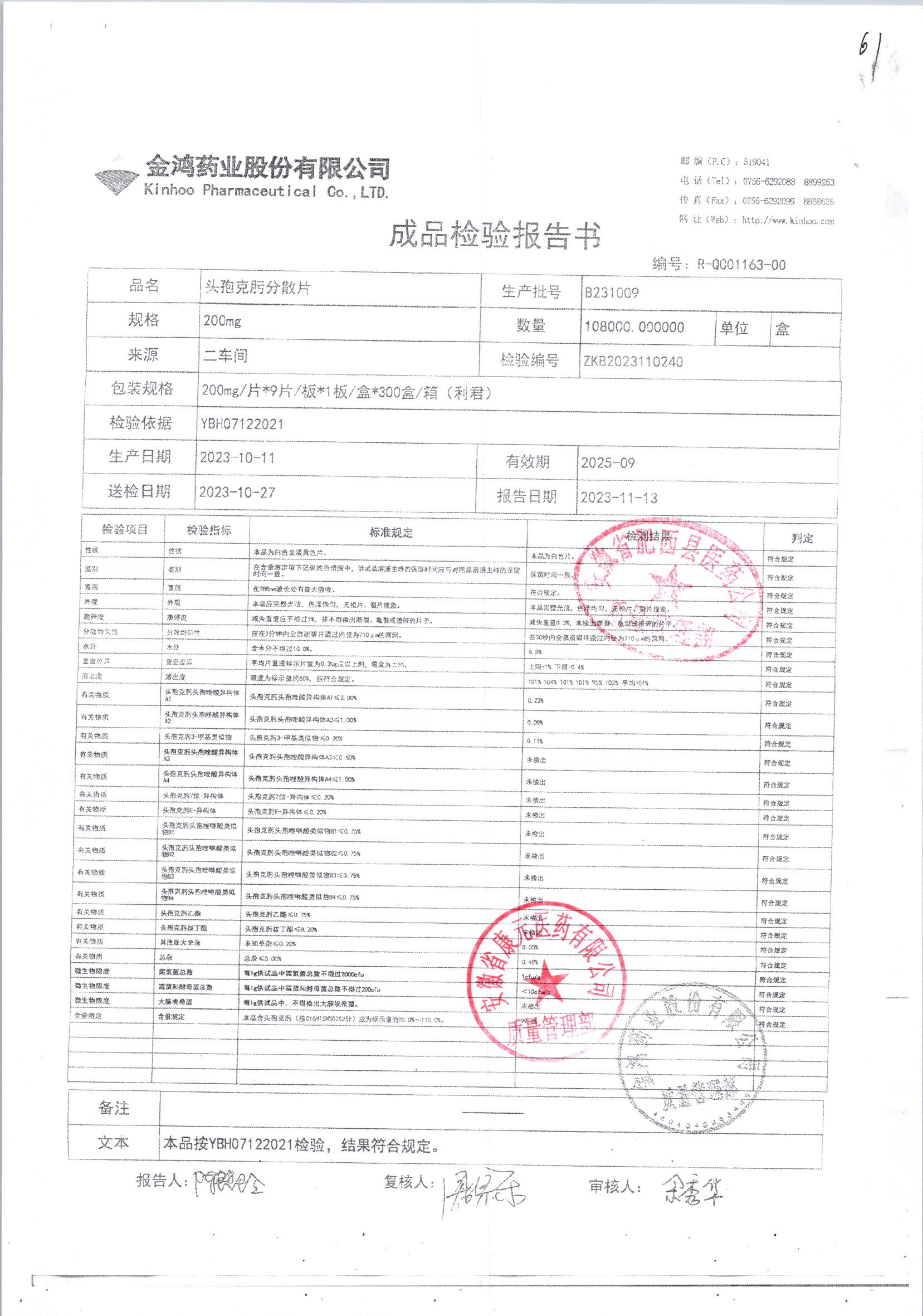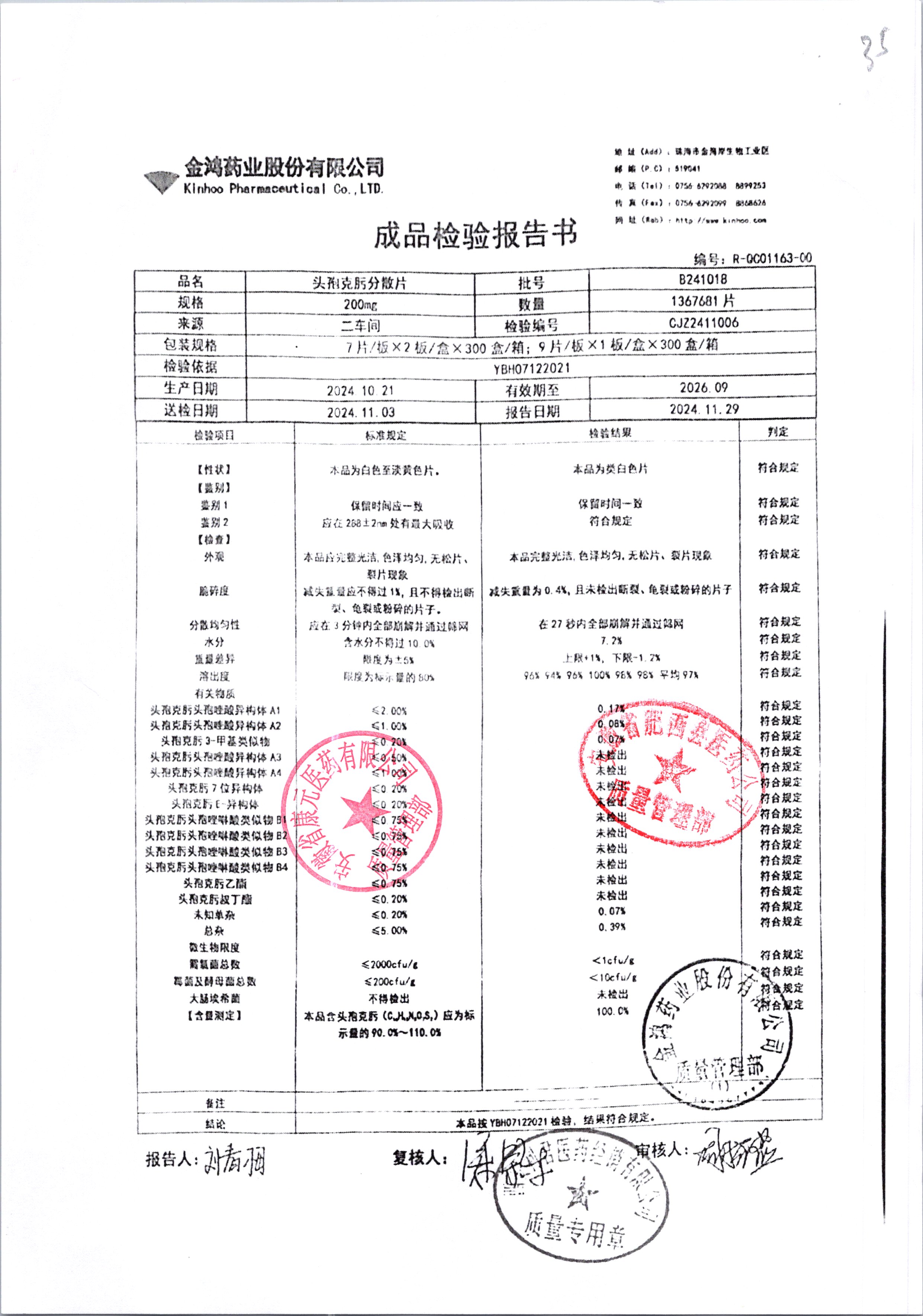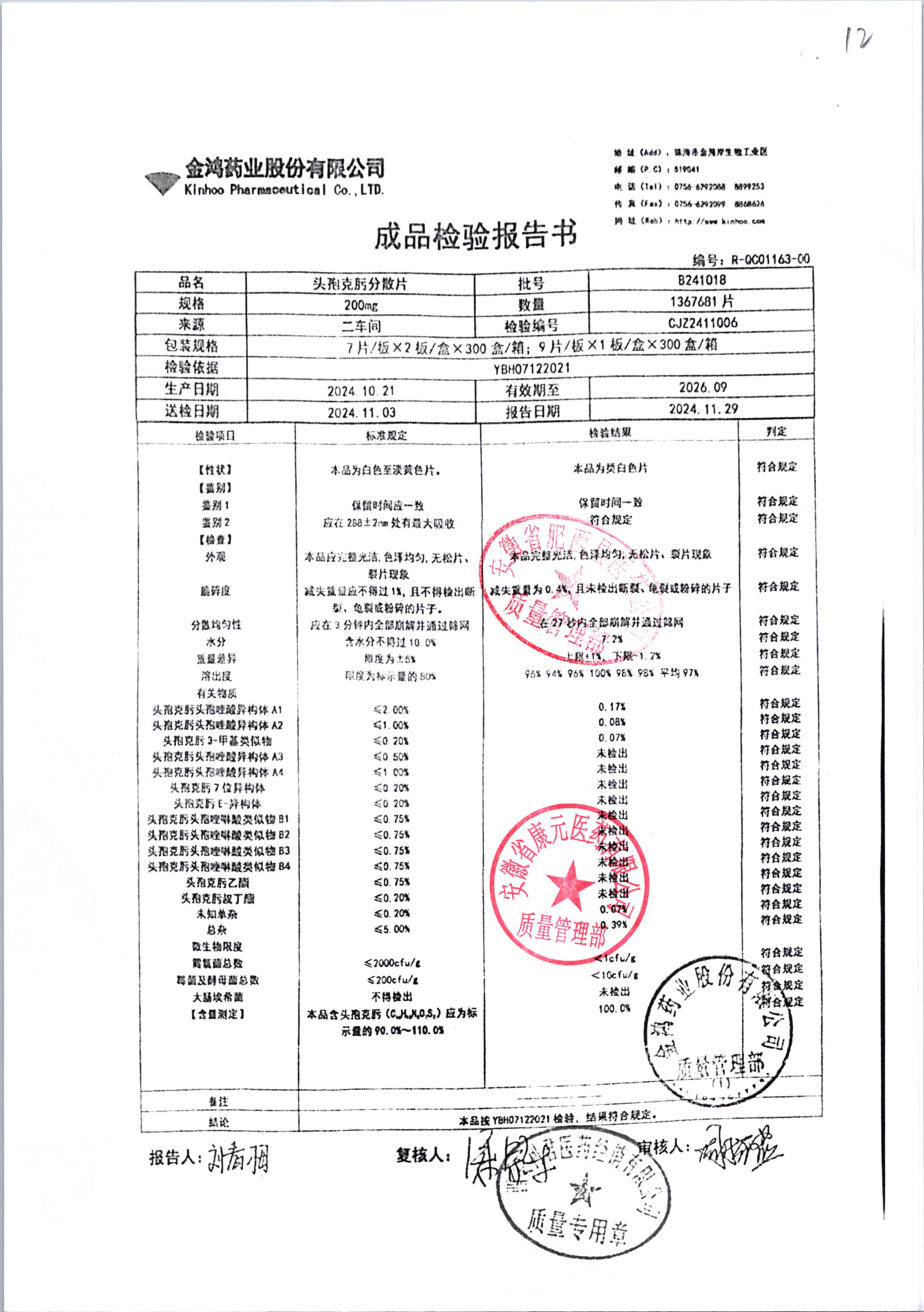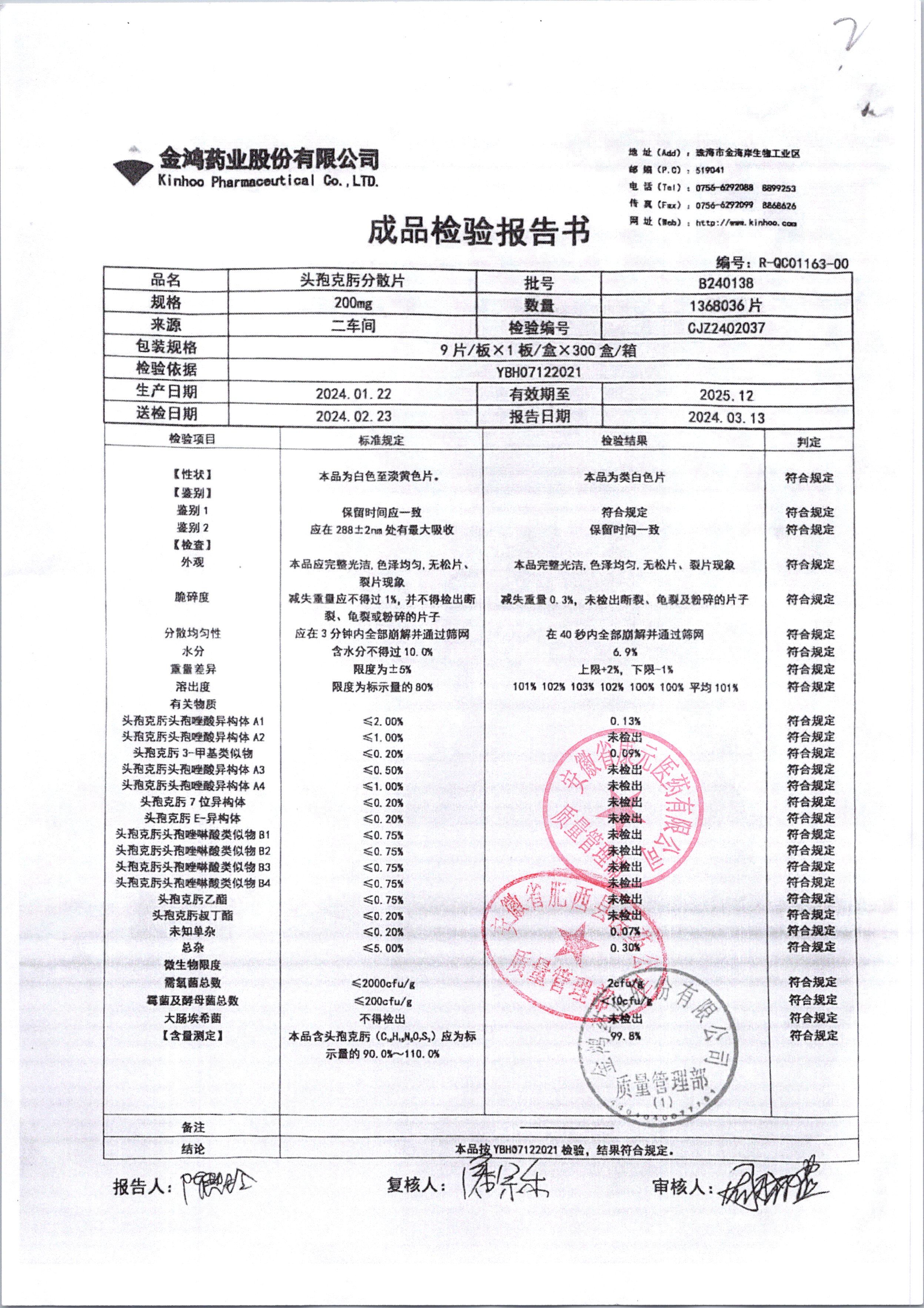 头孢克肟分散片 | 200mg | B241018 | 查看详情 |