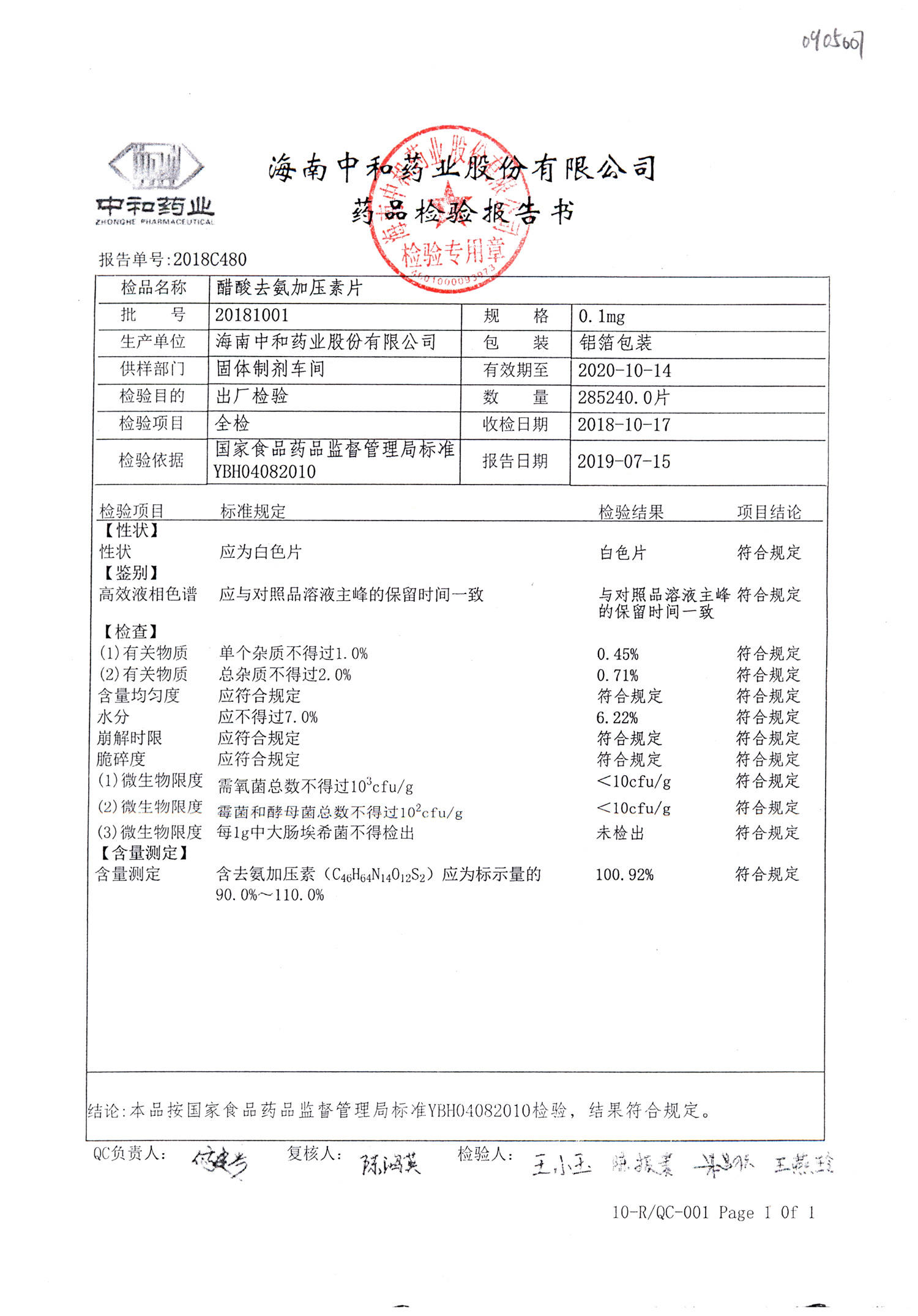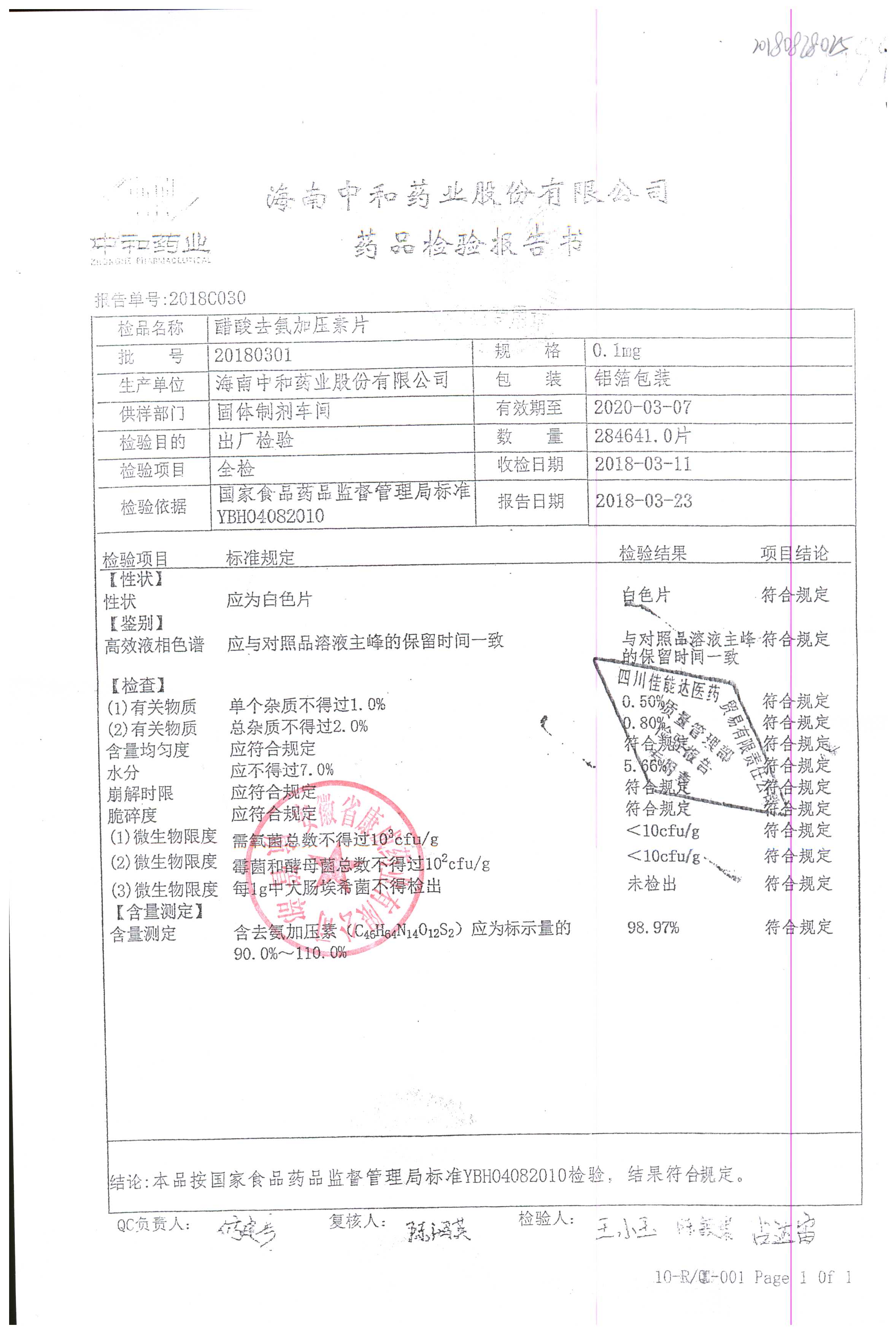 醋酸去氨加压素片 | 0.1mg | 20181001 | 查看详情 |