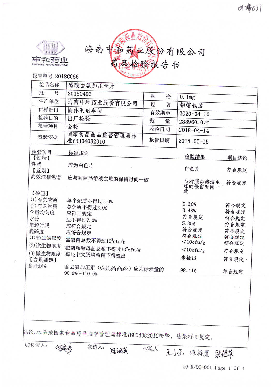 醋酸去氨加压素片 | 0.1mg | 20180403 | 查看详情 |