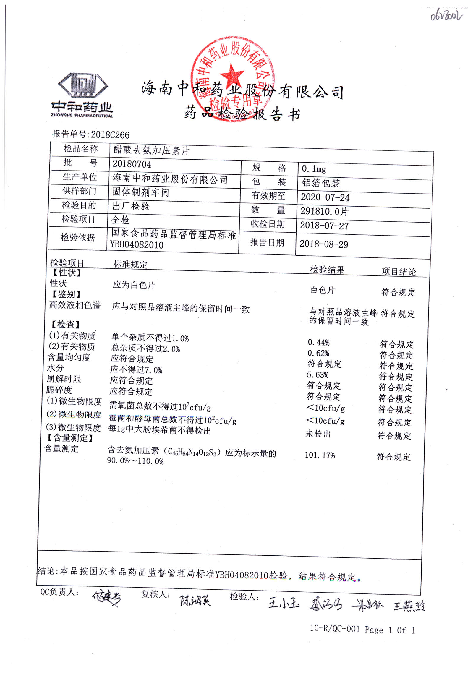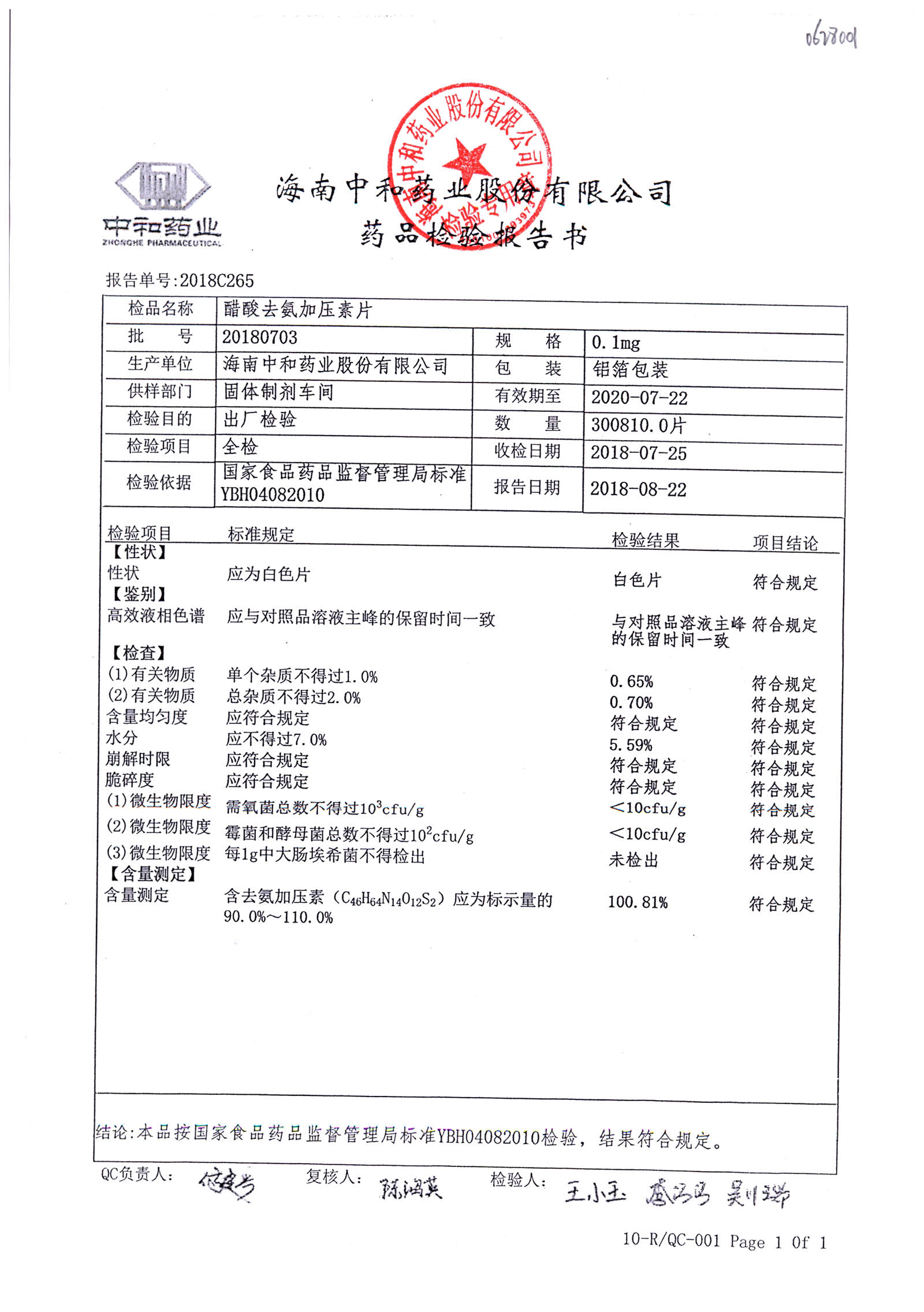 醋酸去氨加压素片 | 0.1mg | 20180704 | 查看详情 |