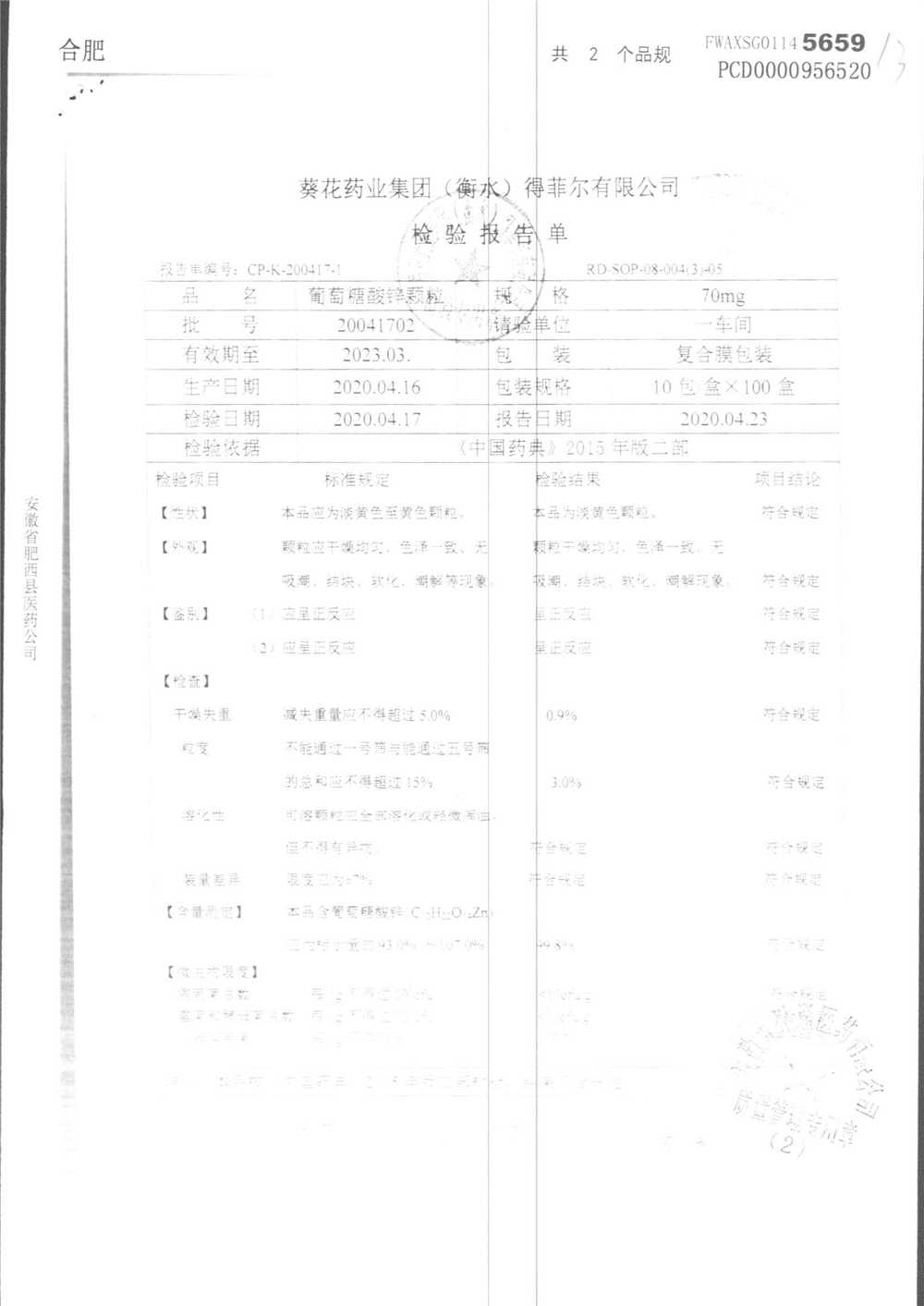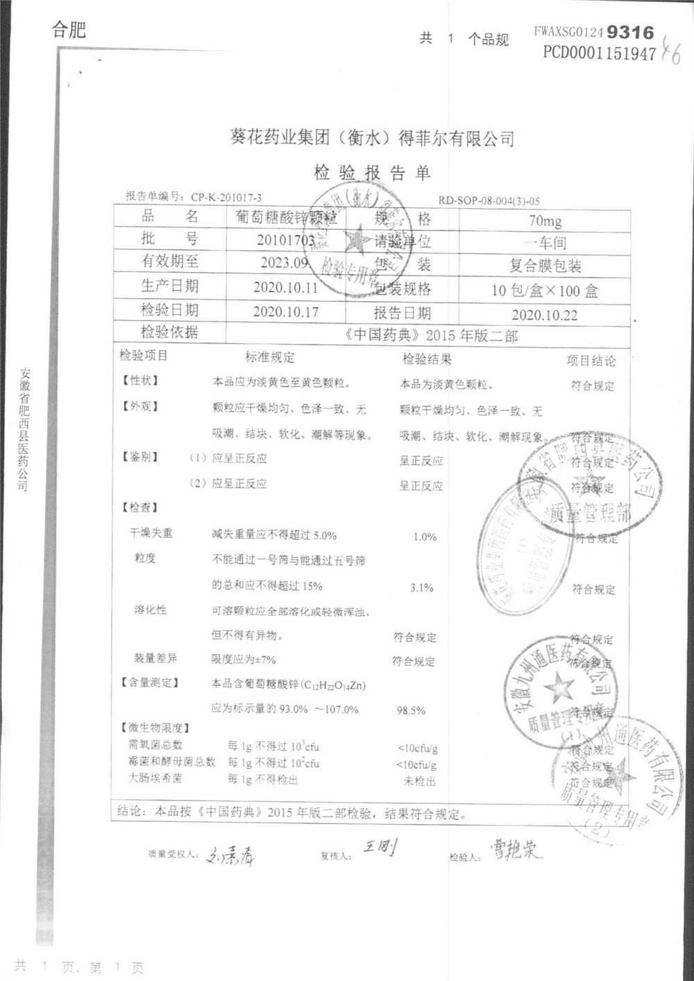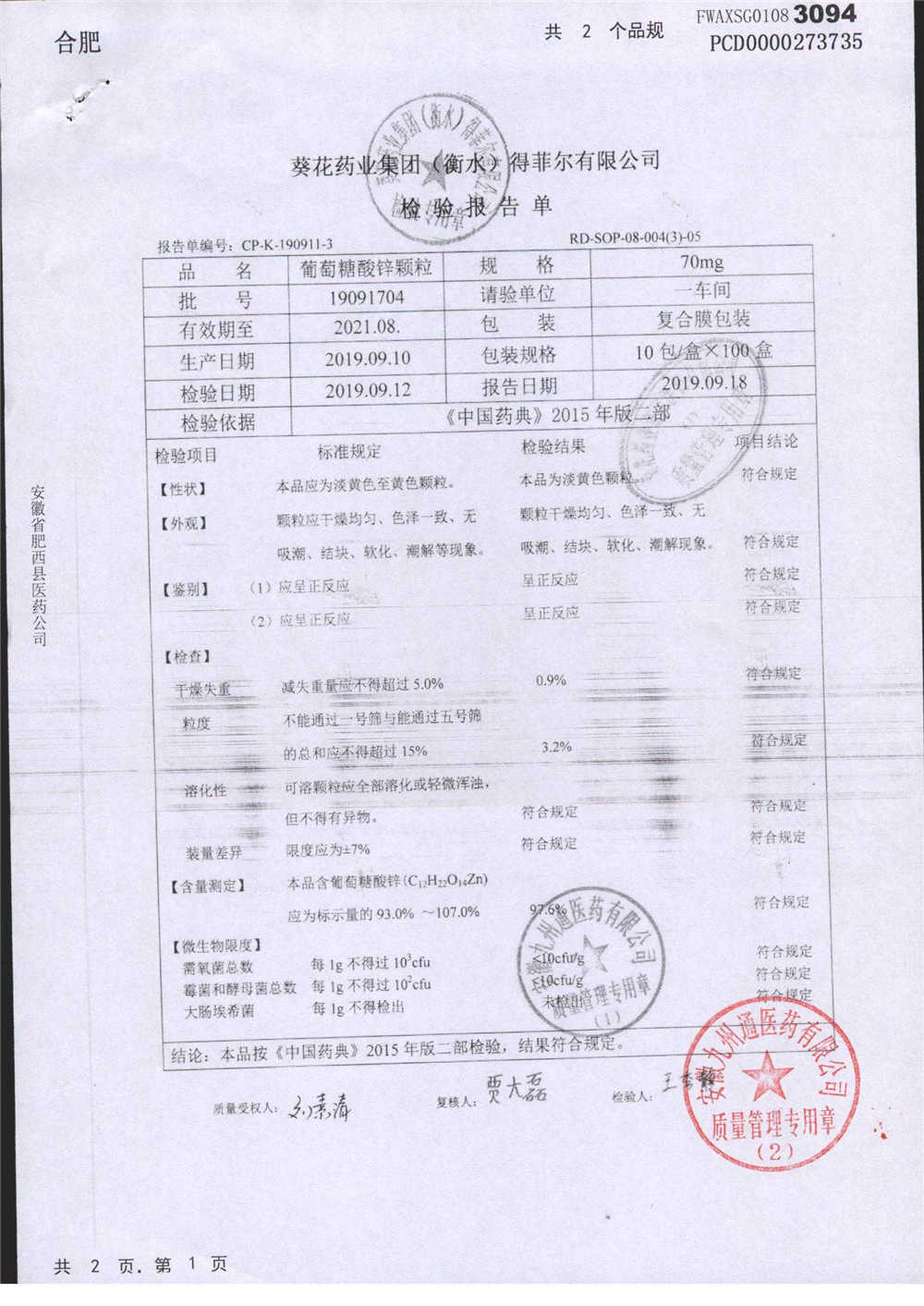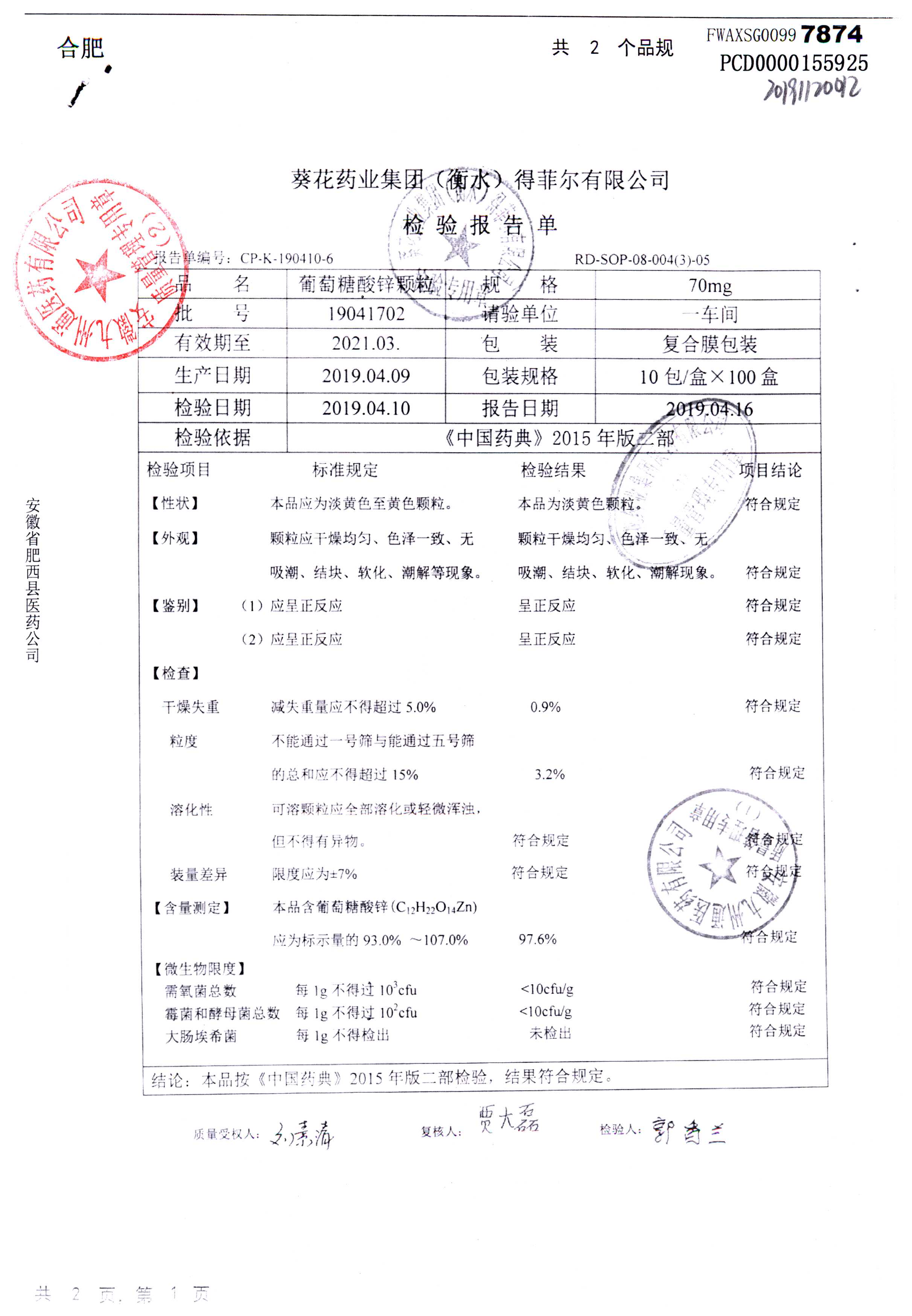 葡萄糖酸锌颗粒 | 70mg*10包 | 20051702 | 查看详情 |
