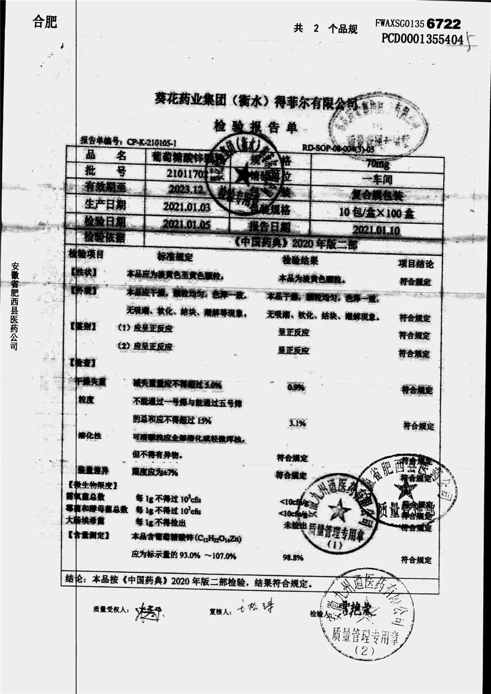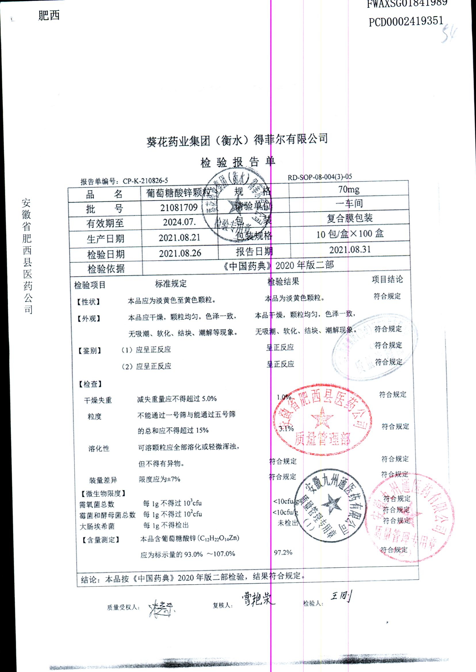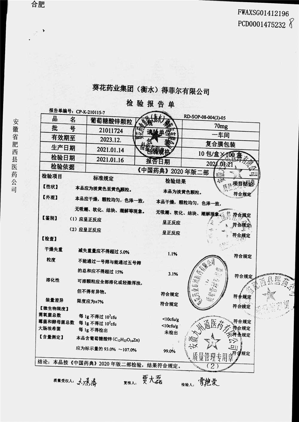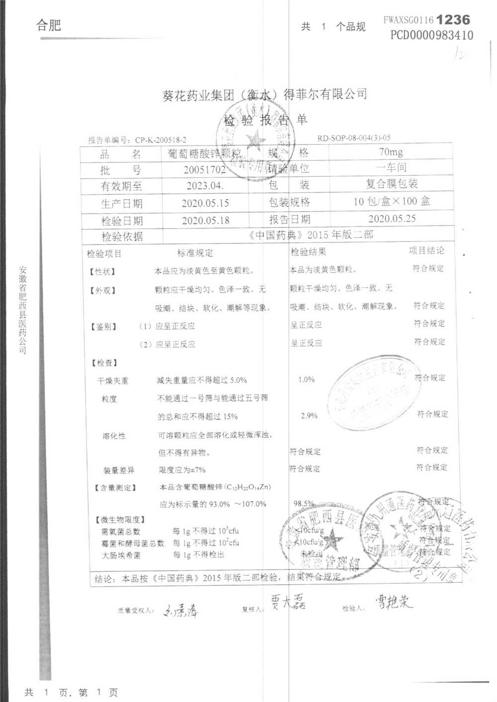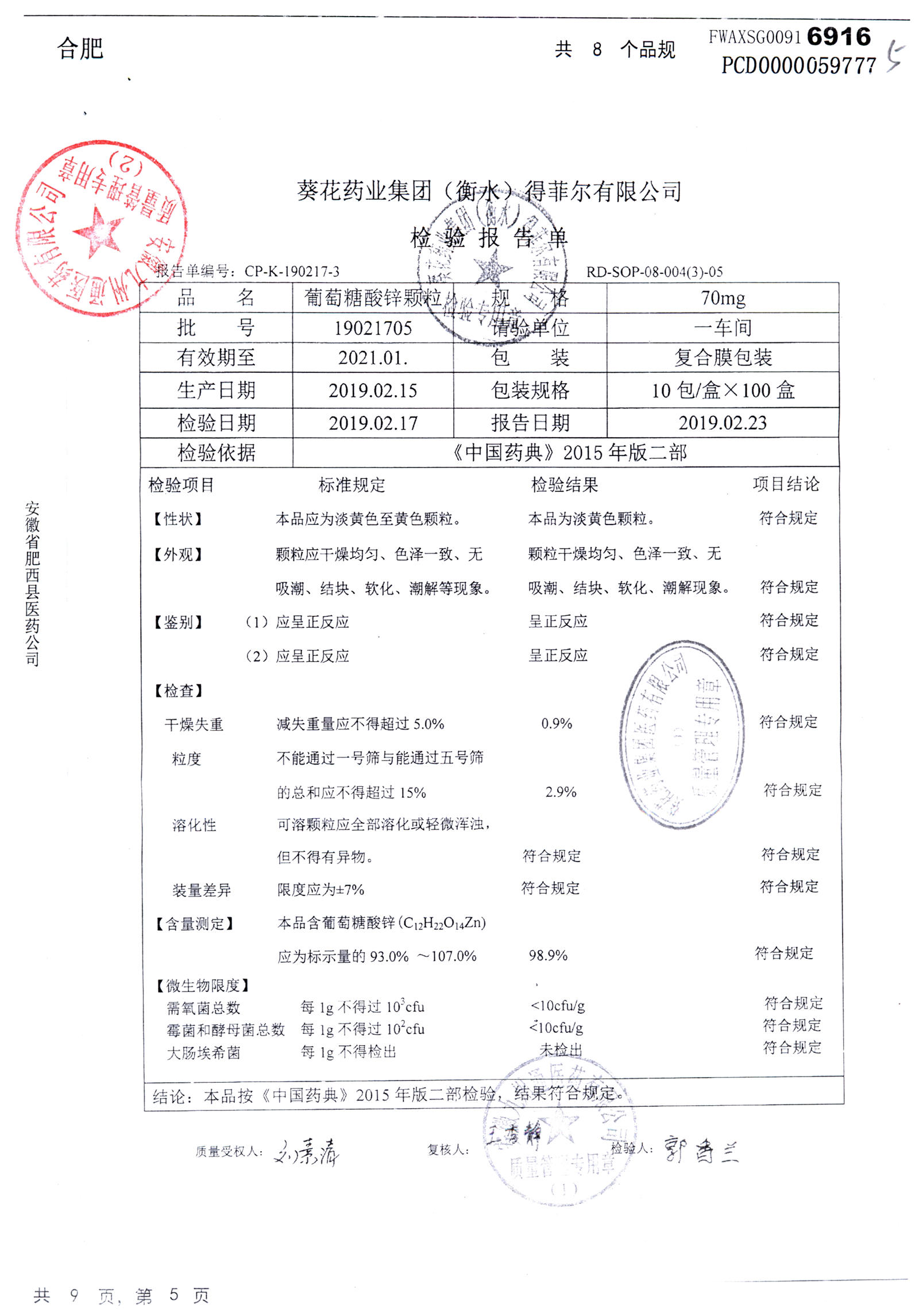 葡萄糖酸锌颗粒 | 70mg*10包 | 20051702 | 查看详情 |
