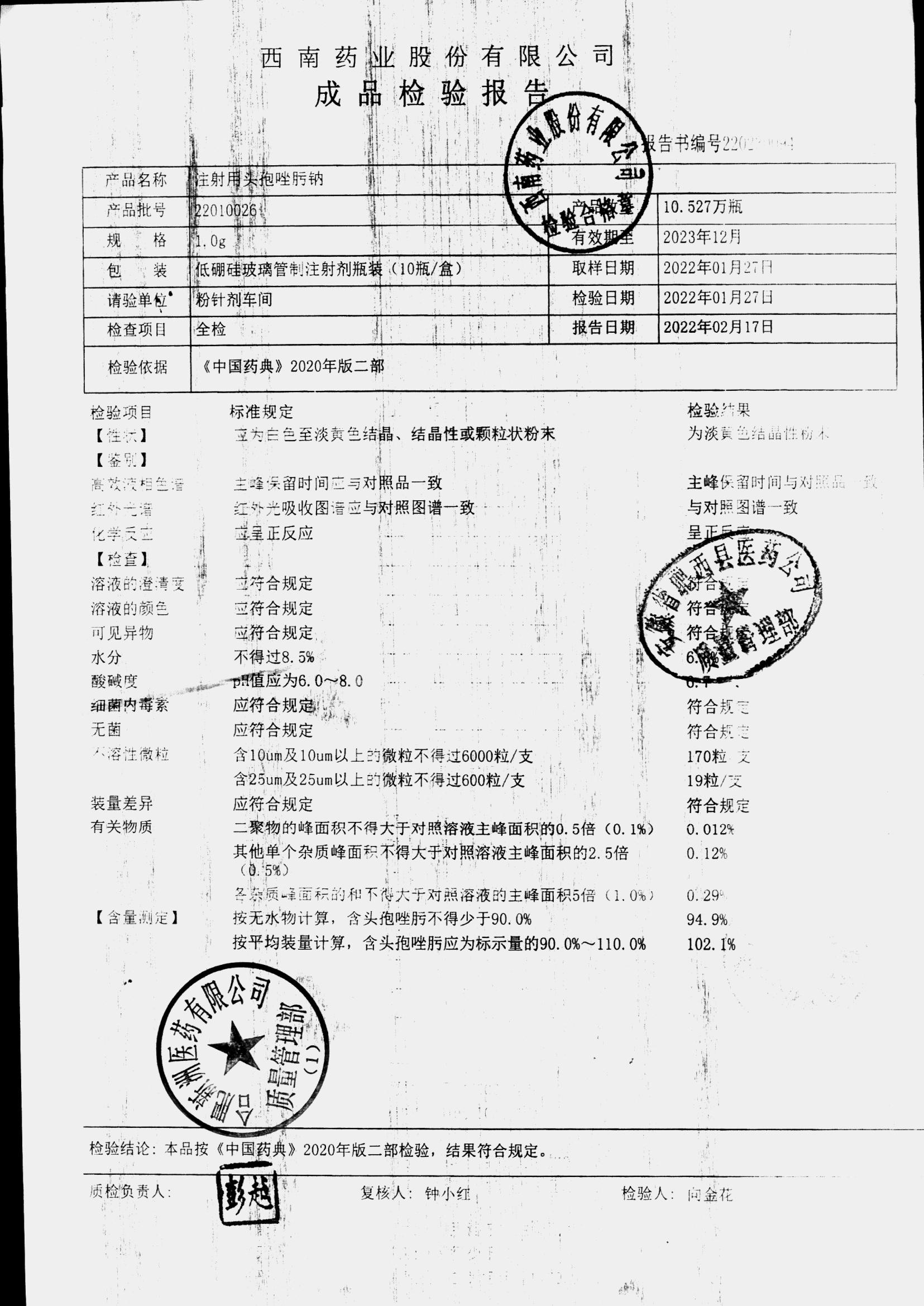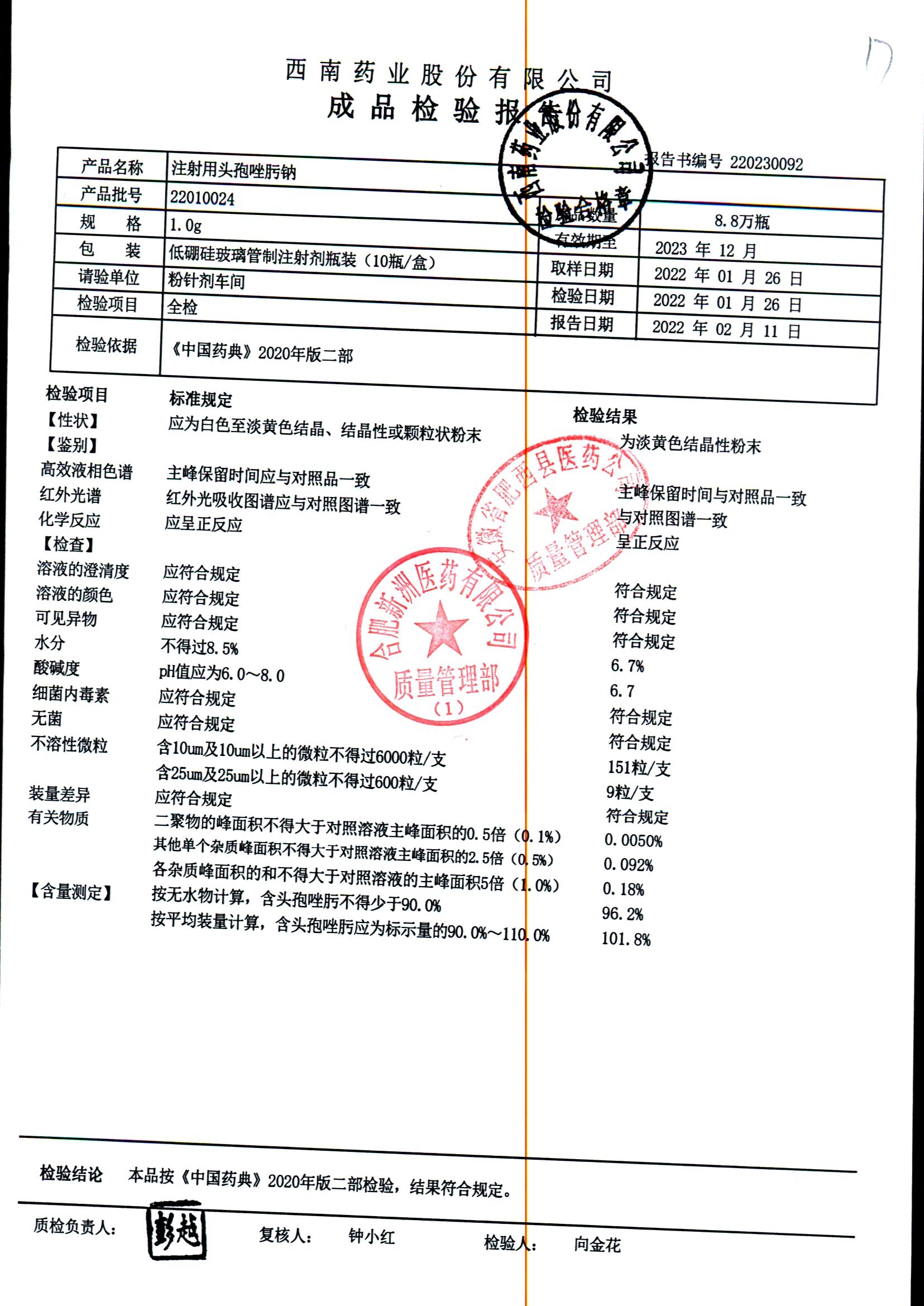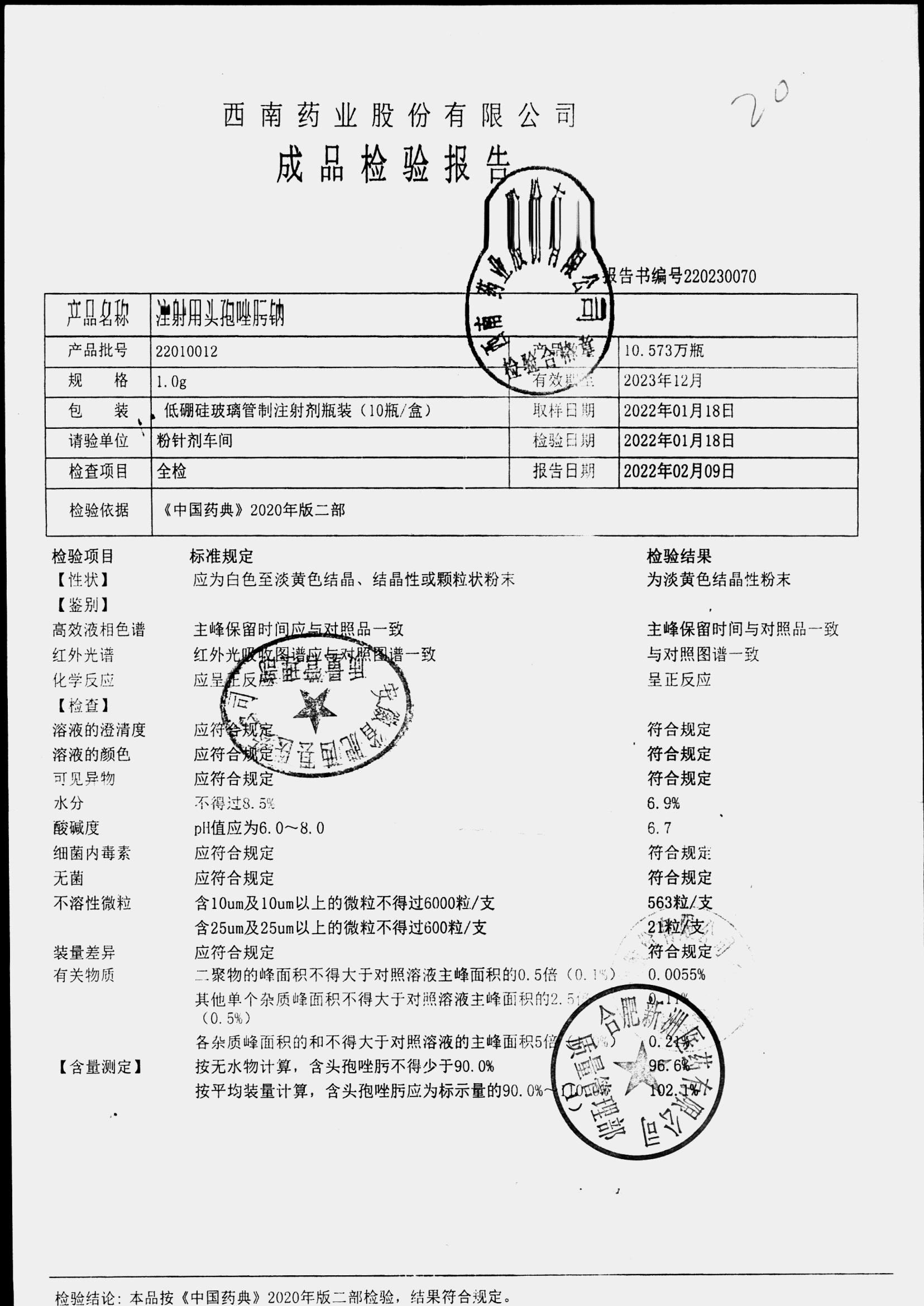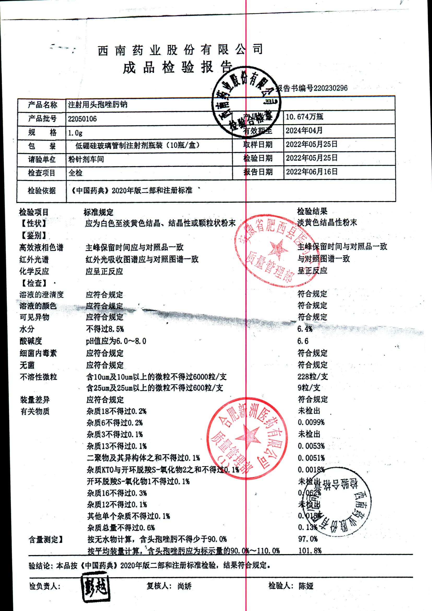 注射用头孢唑肟钠 | 1.0g | 22060123 | 查看详情 |