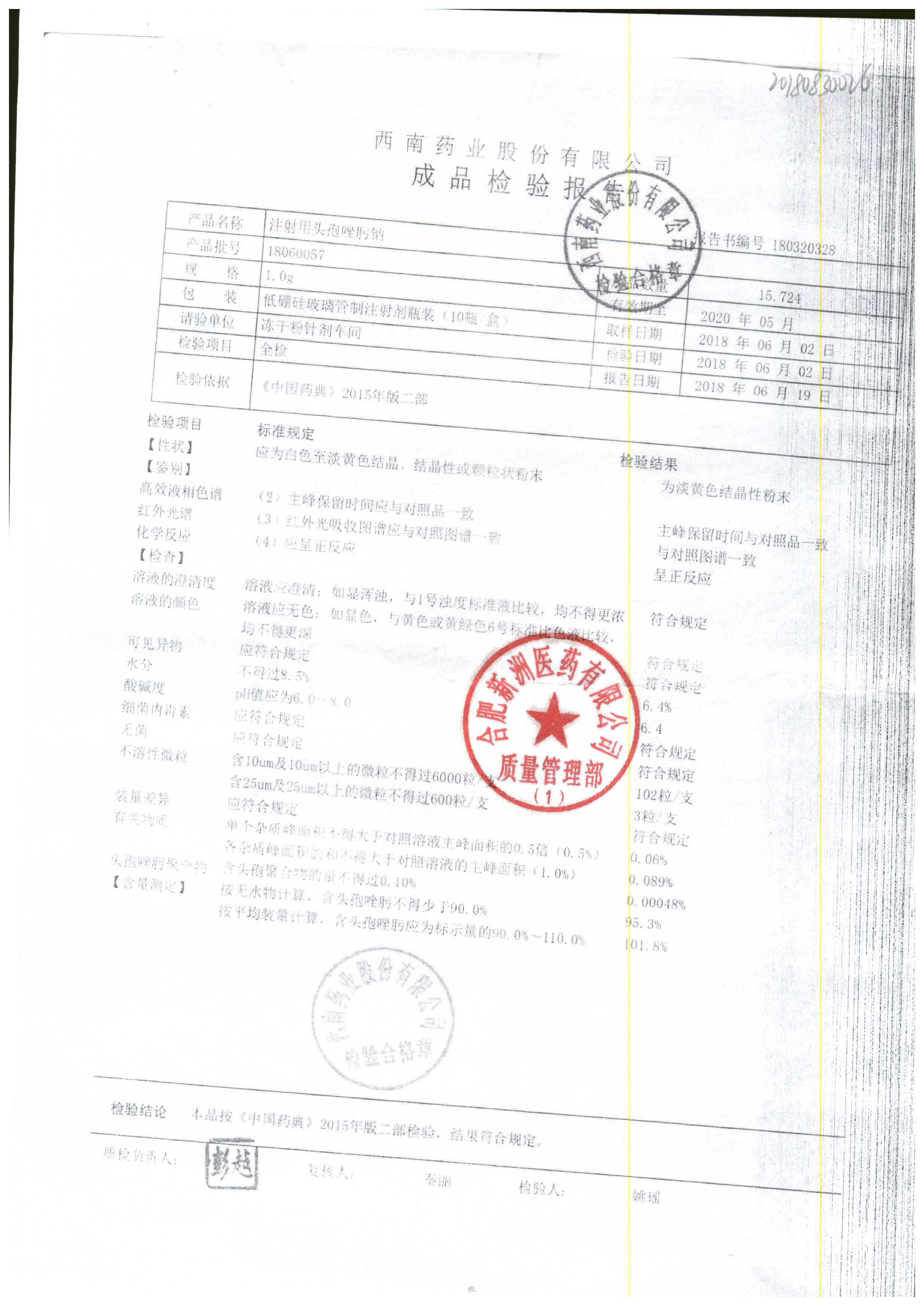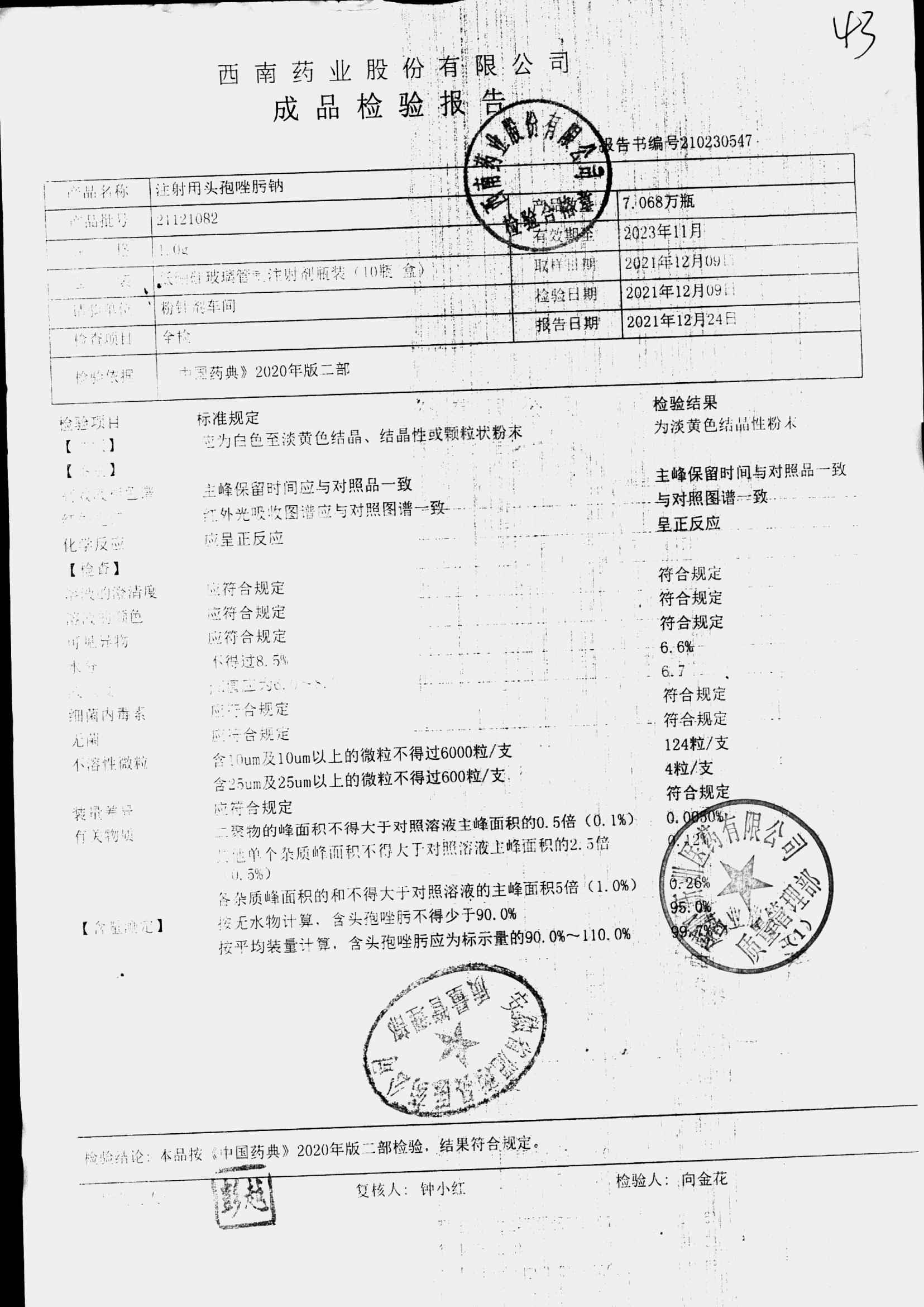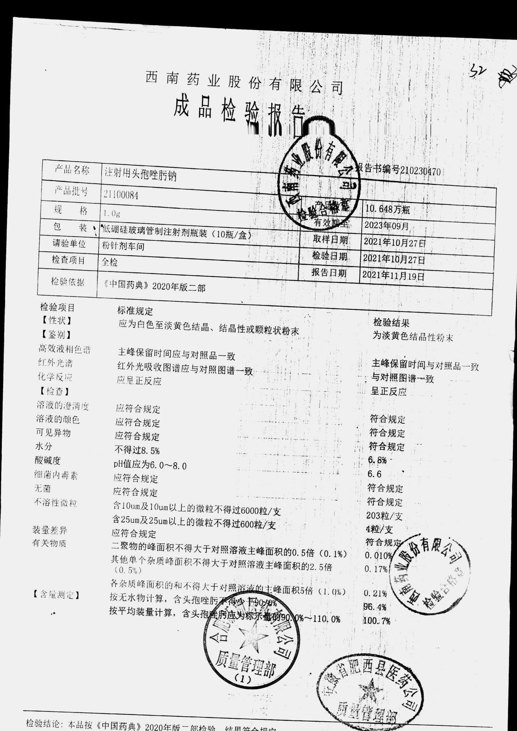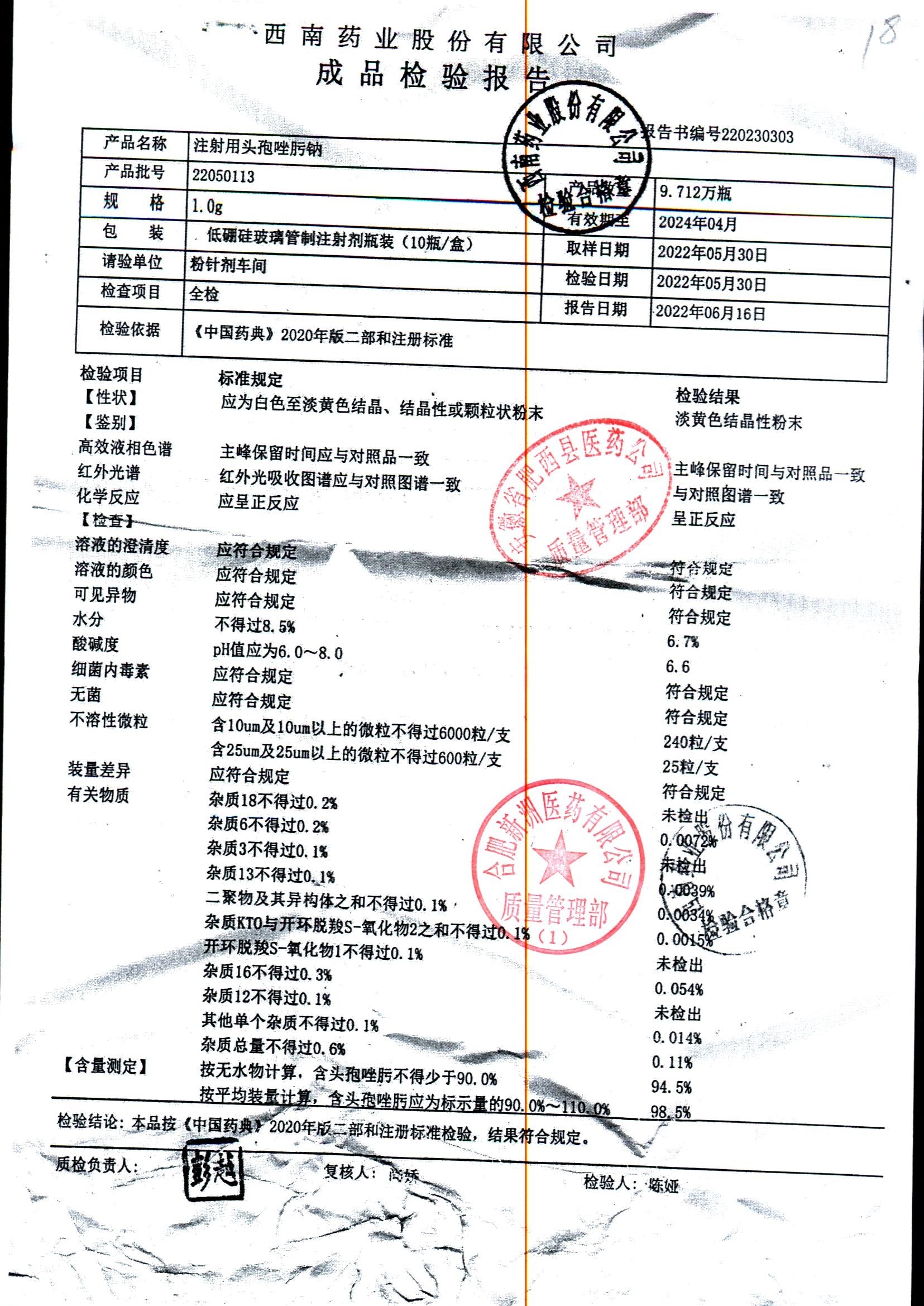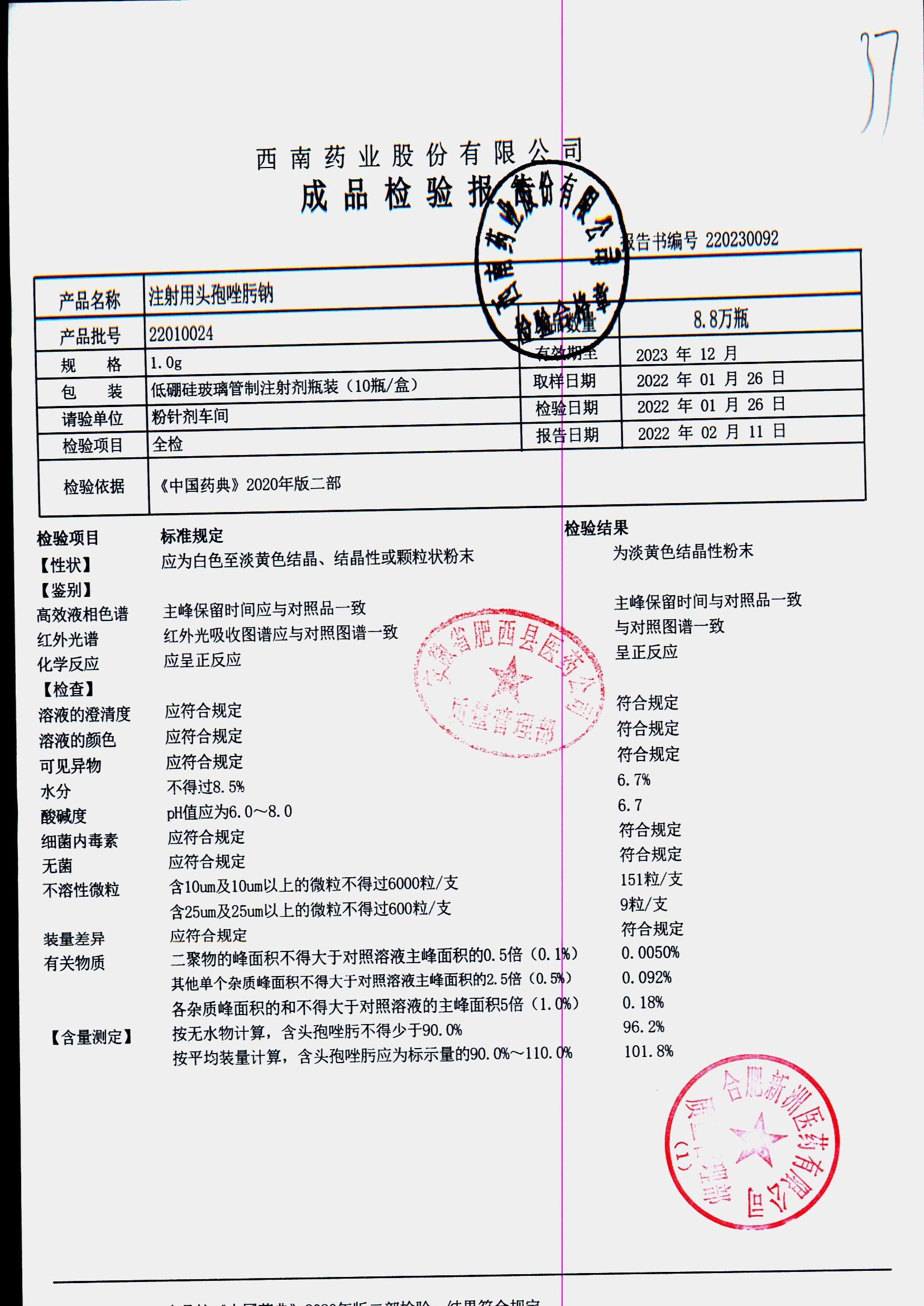 注射用头孢唑肟钠 | 1.0g | 22060123 | 查看详情 |