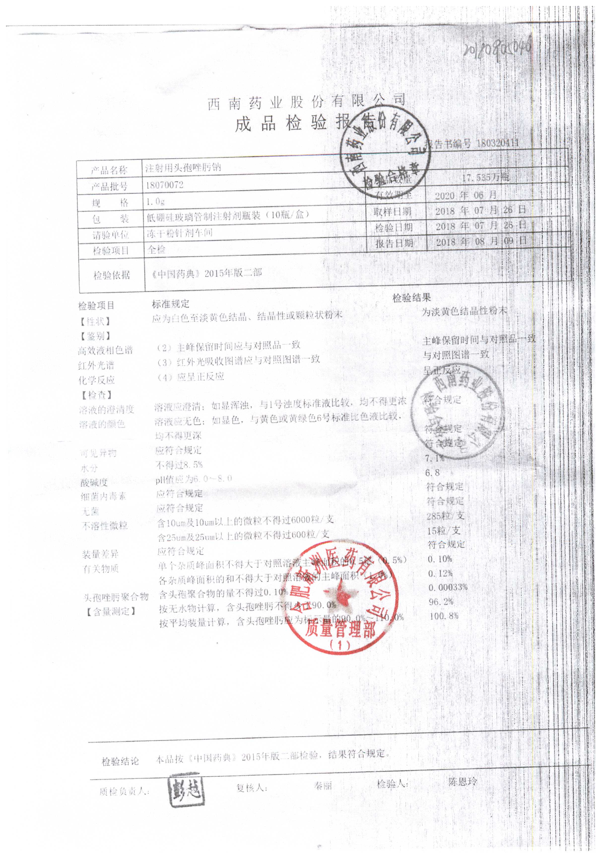 注射用头孢唑肟钠 | 1.0g | 18070072 | 查看详情 |