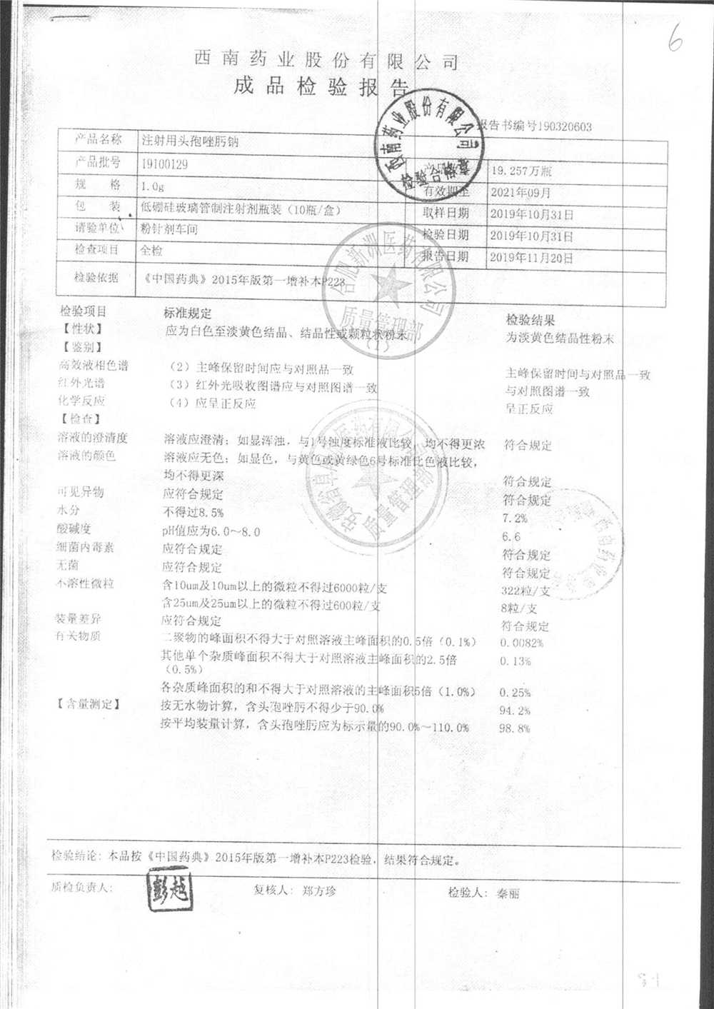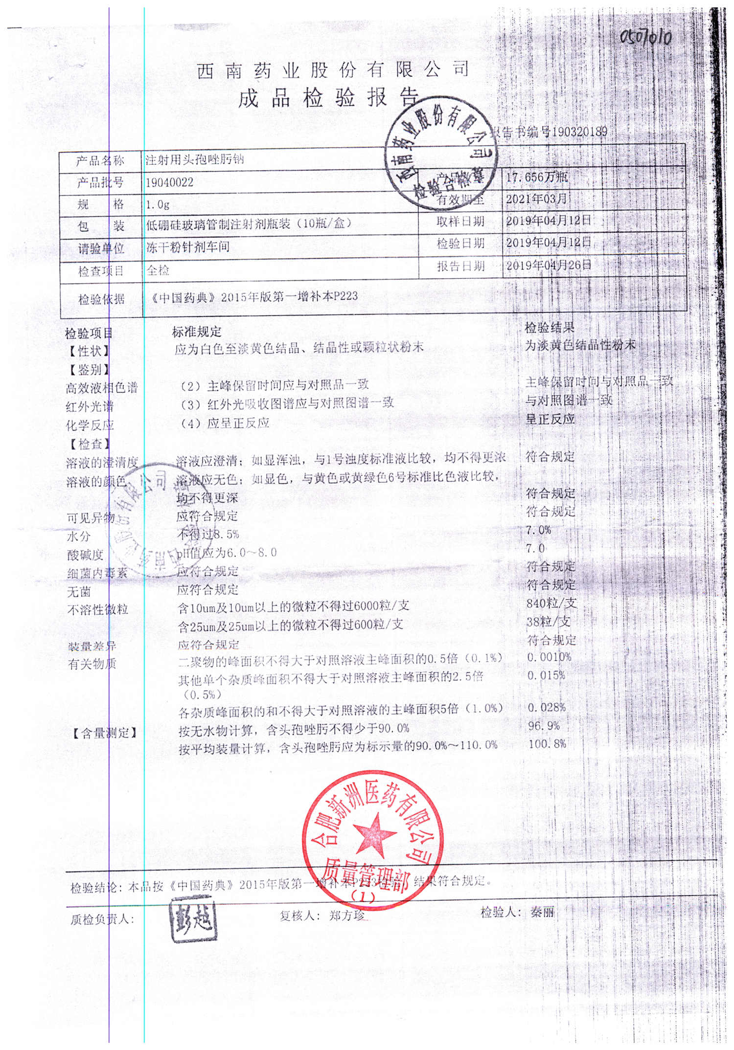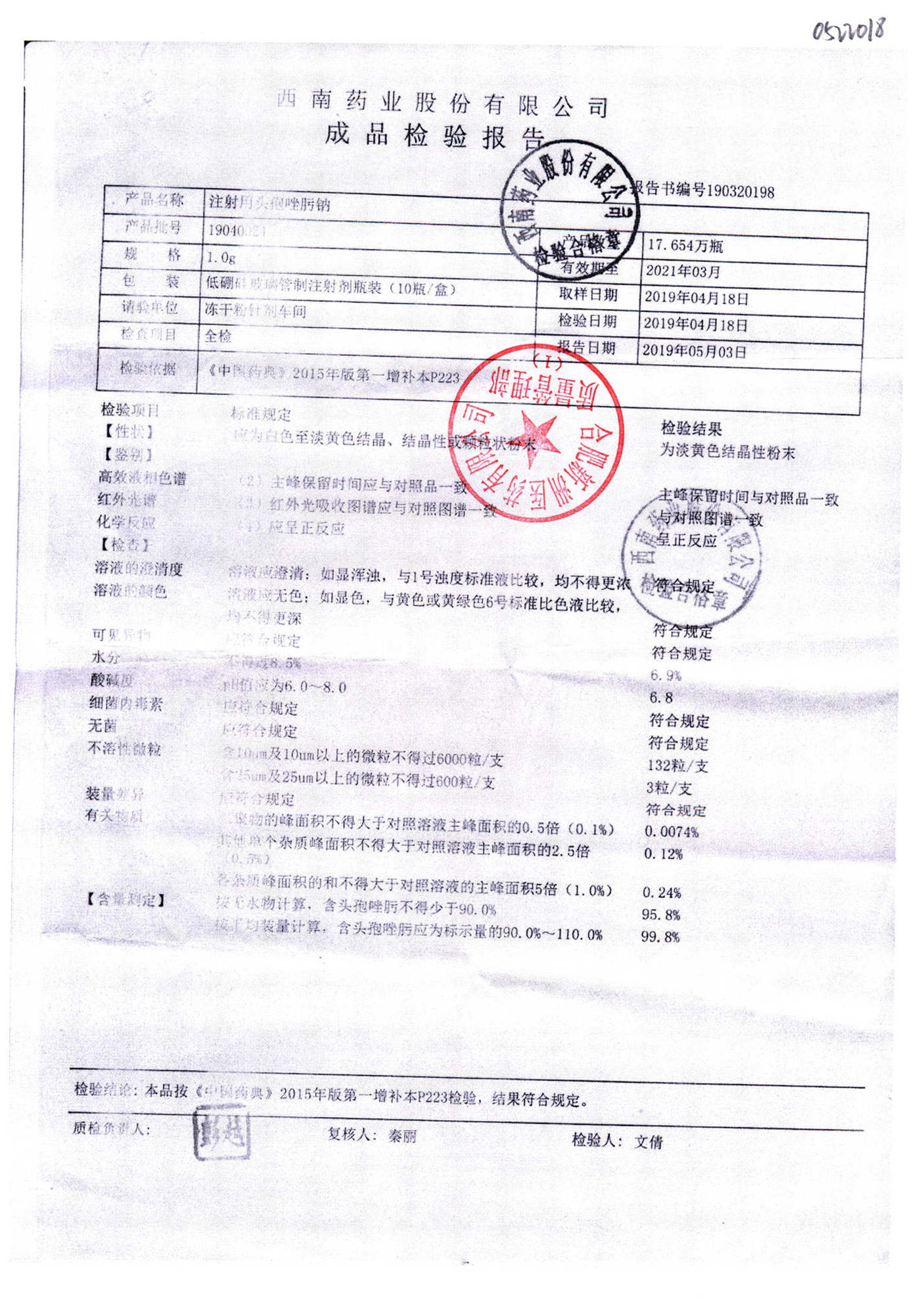 注射用头孢唑肟钠 | 1.0g | 19100129 | 查看详情 |