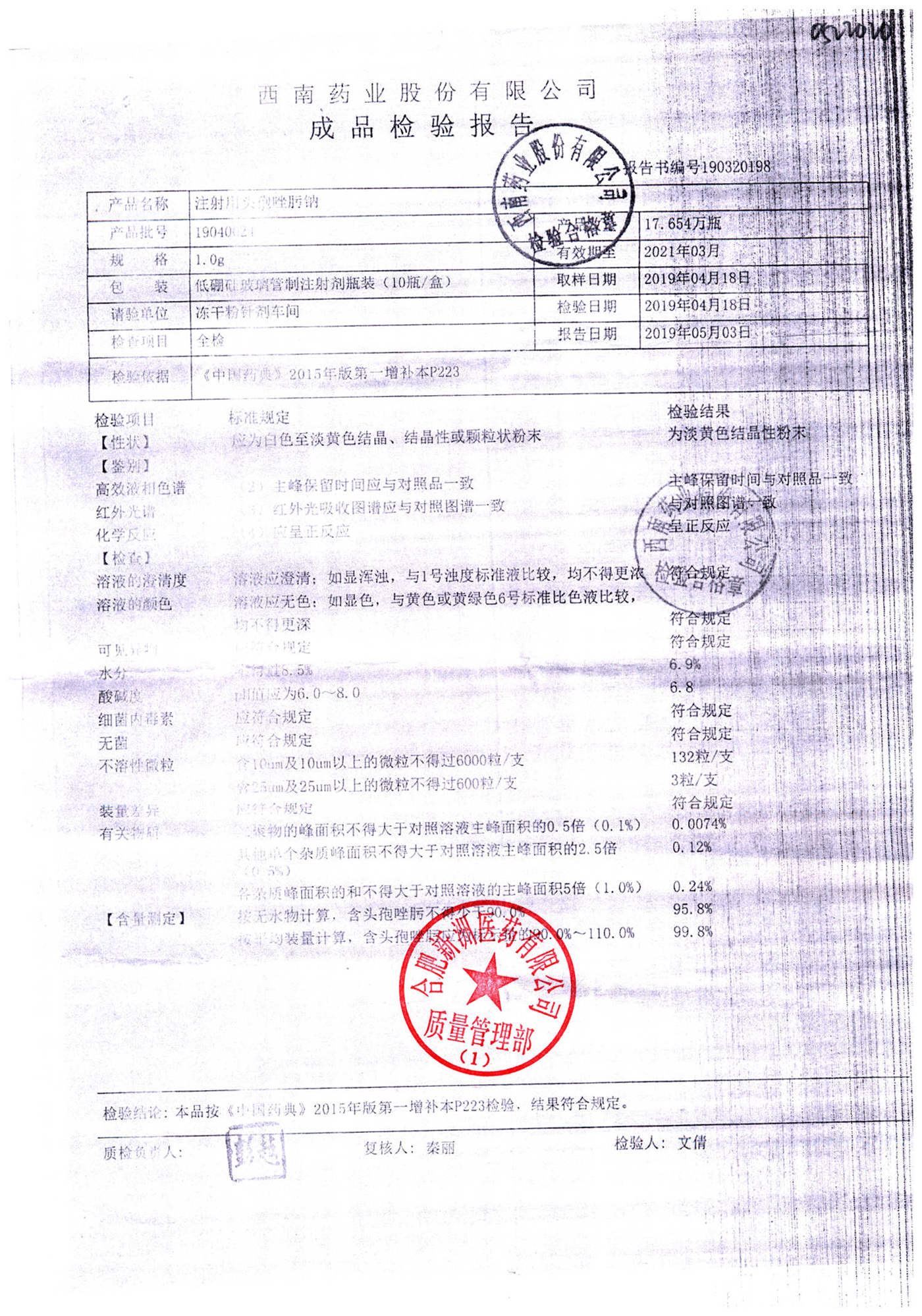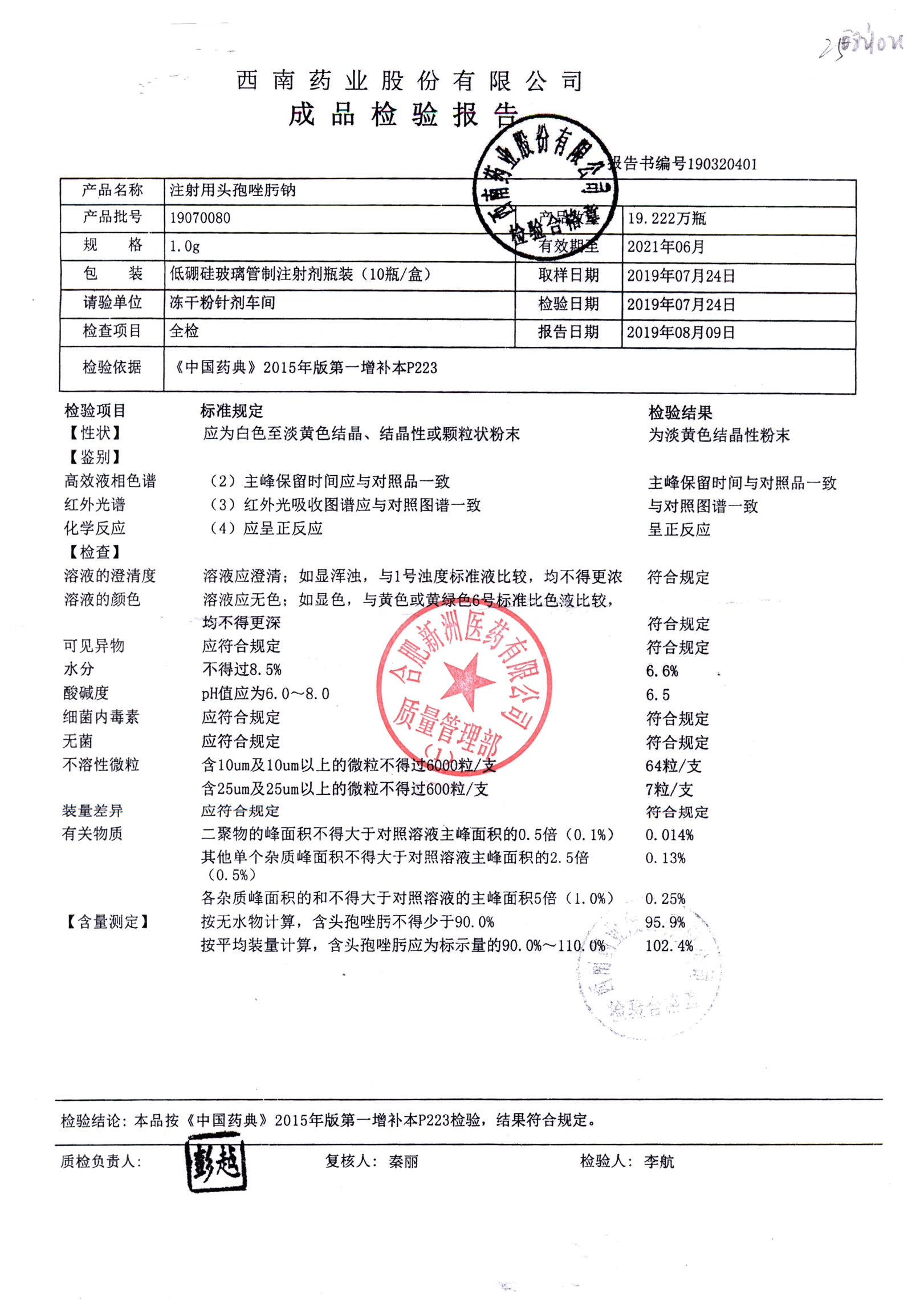 注射用头孢唑肟钠 | 1.0g | 19040021 | 查看详情 |