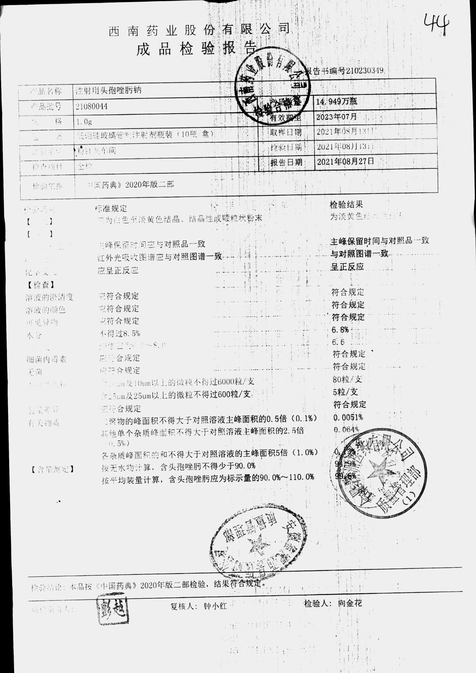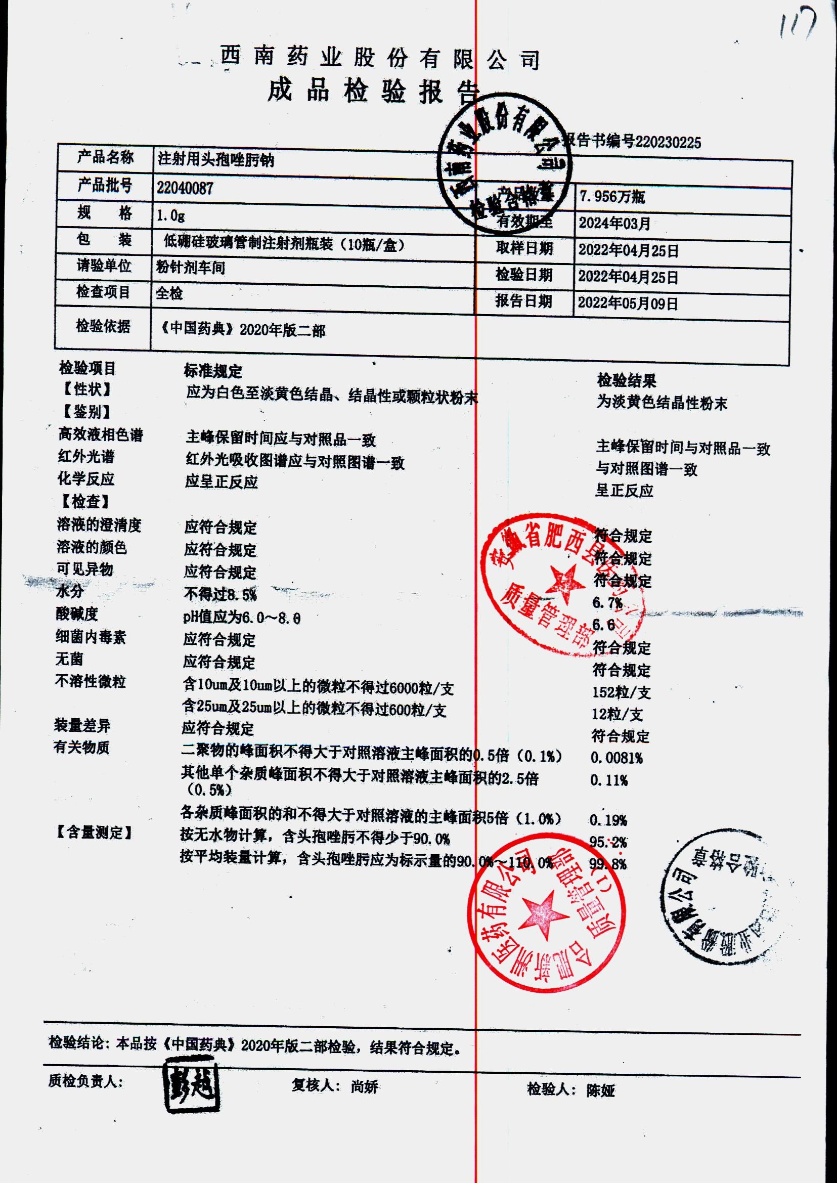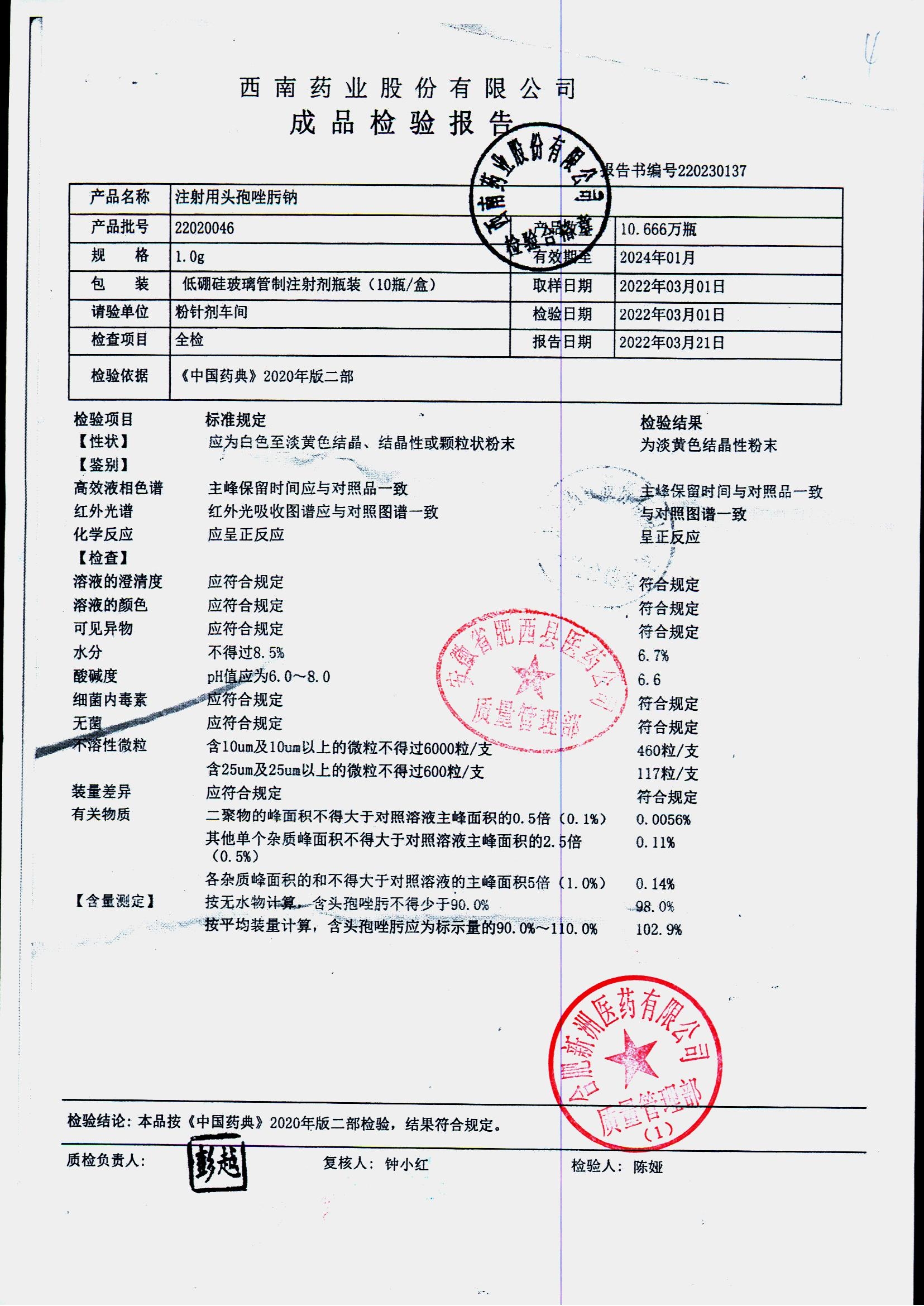 注射用头孢唑肟钠 | 1.0g | 22050113 | 查看详情 |