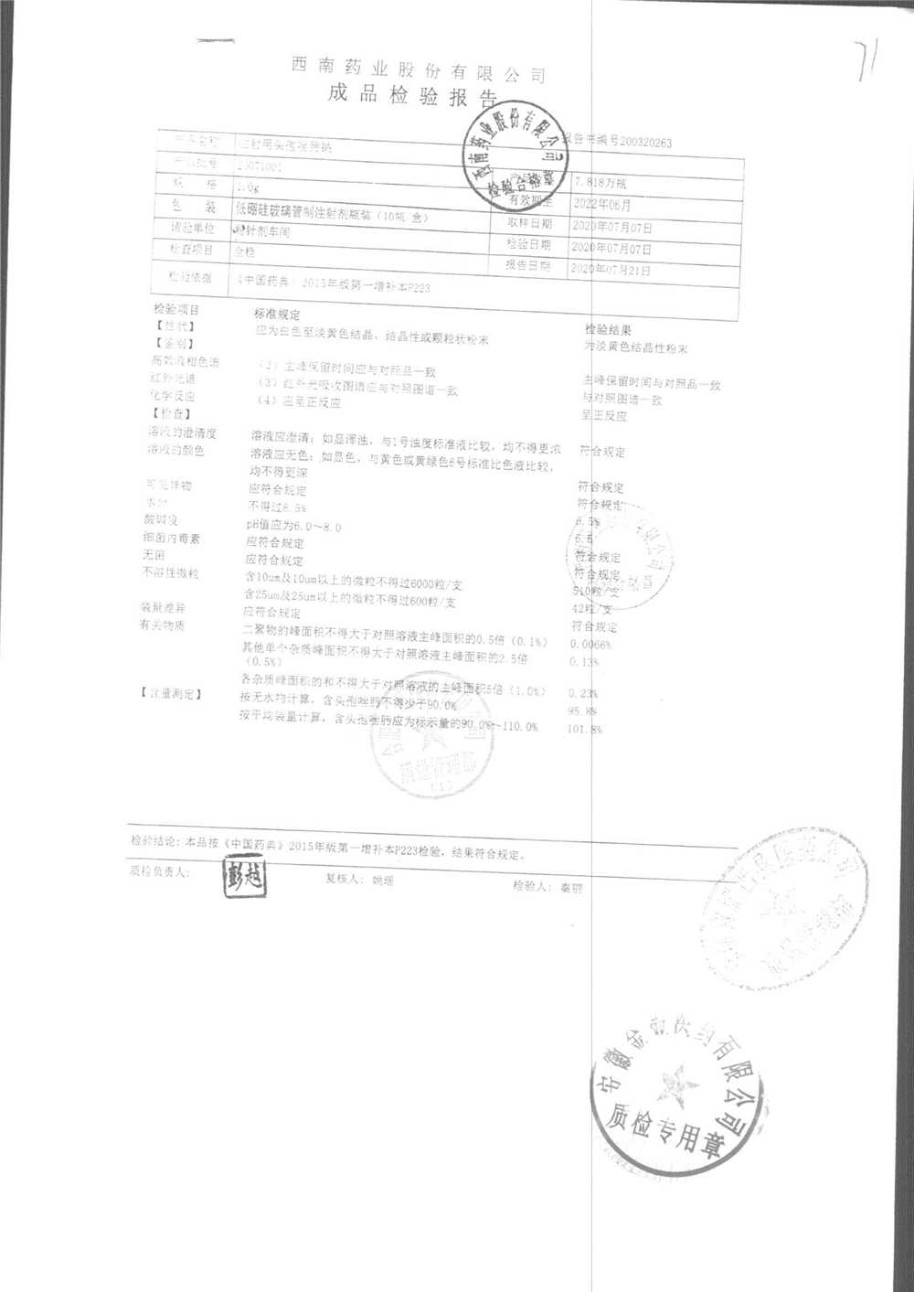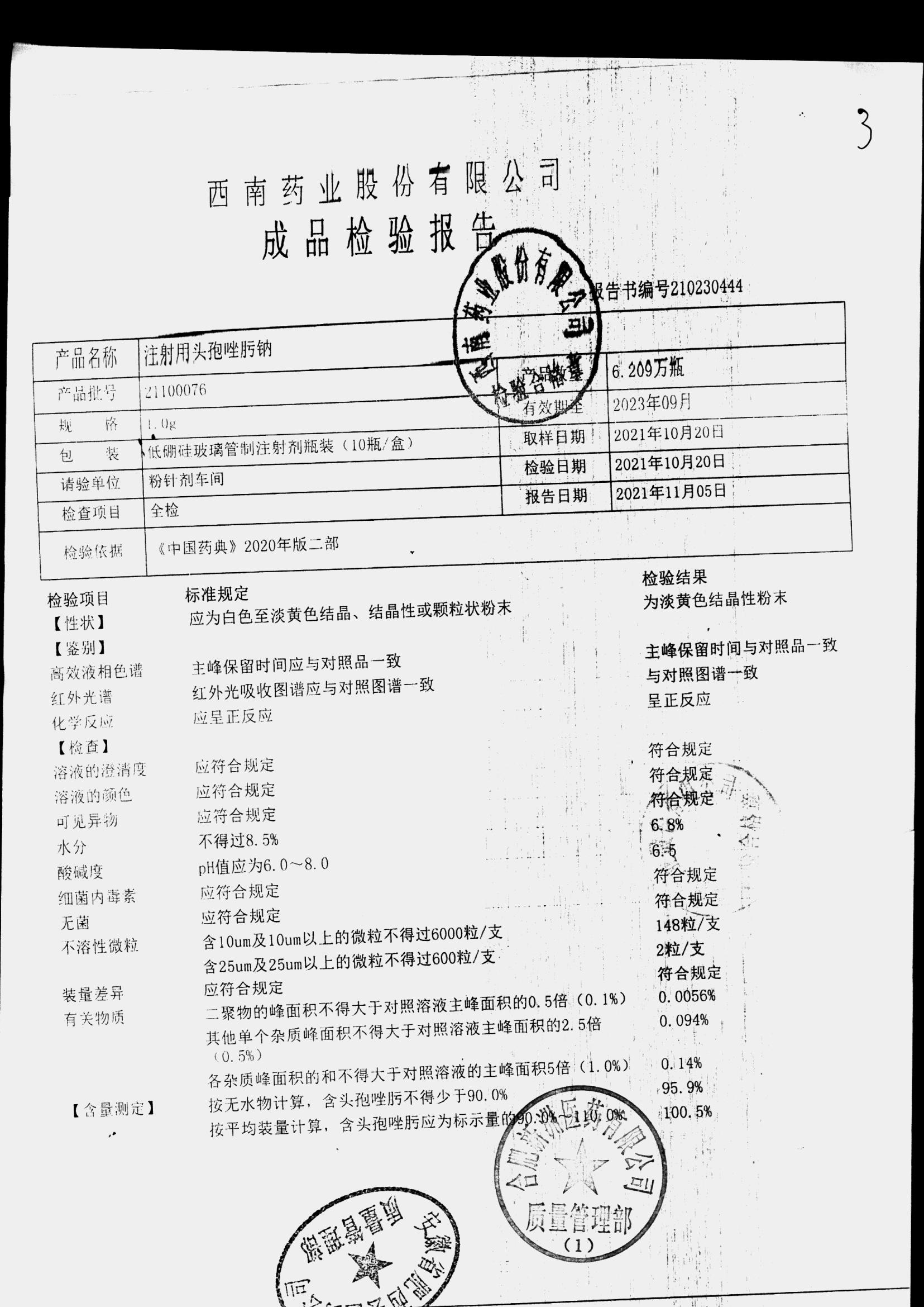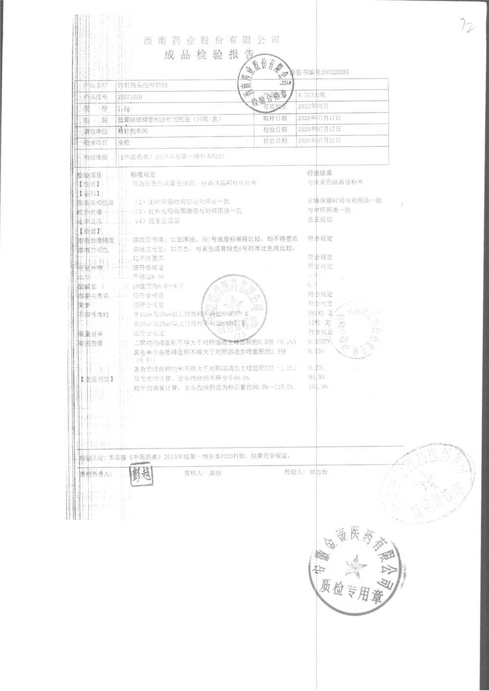 注射用头孢唑肟钠 | 1.0g | 22050113 | 查看详情 |