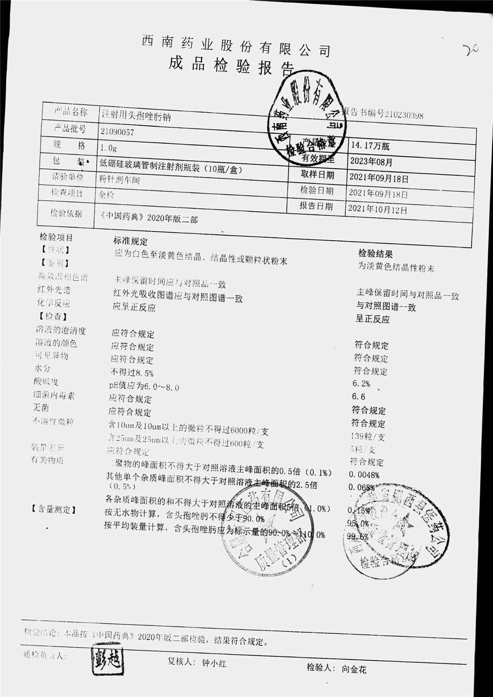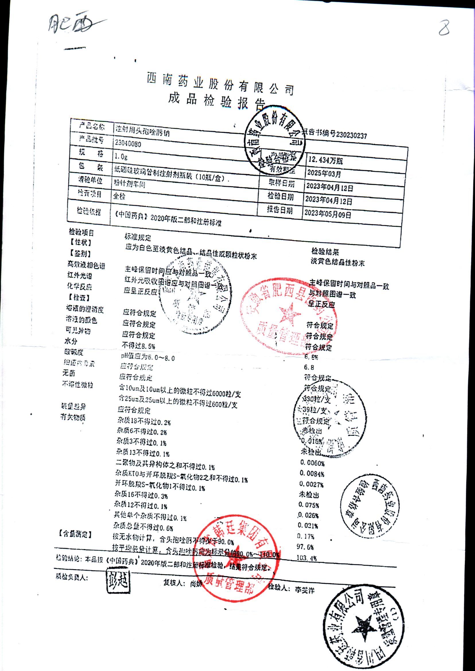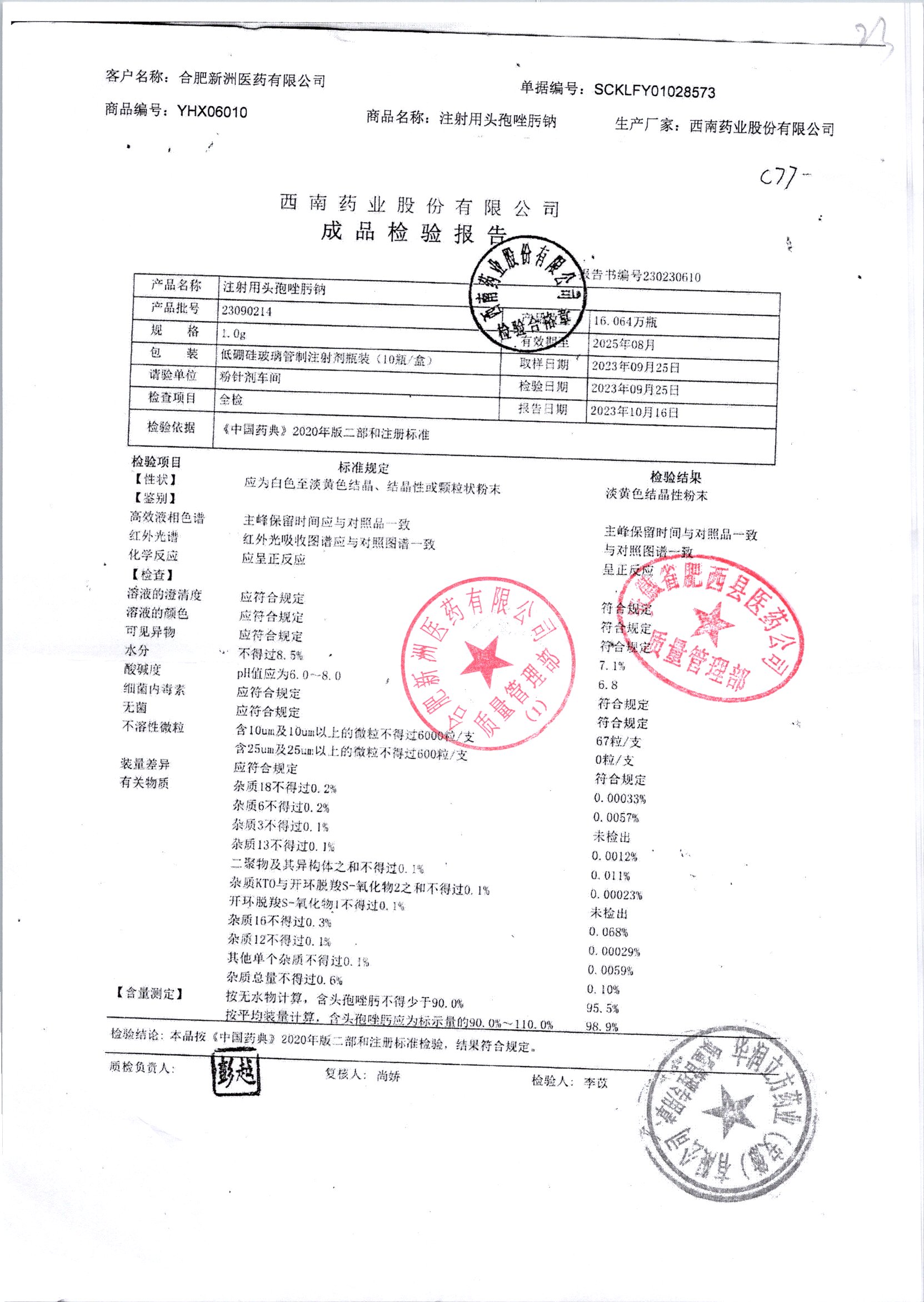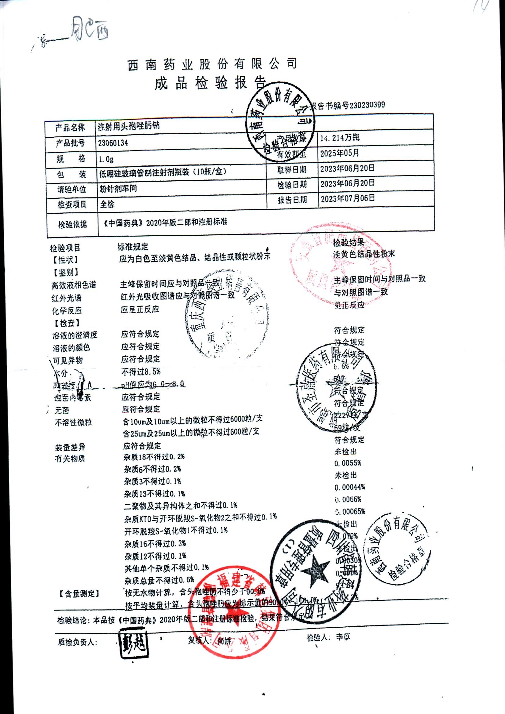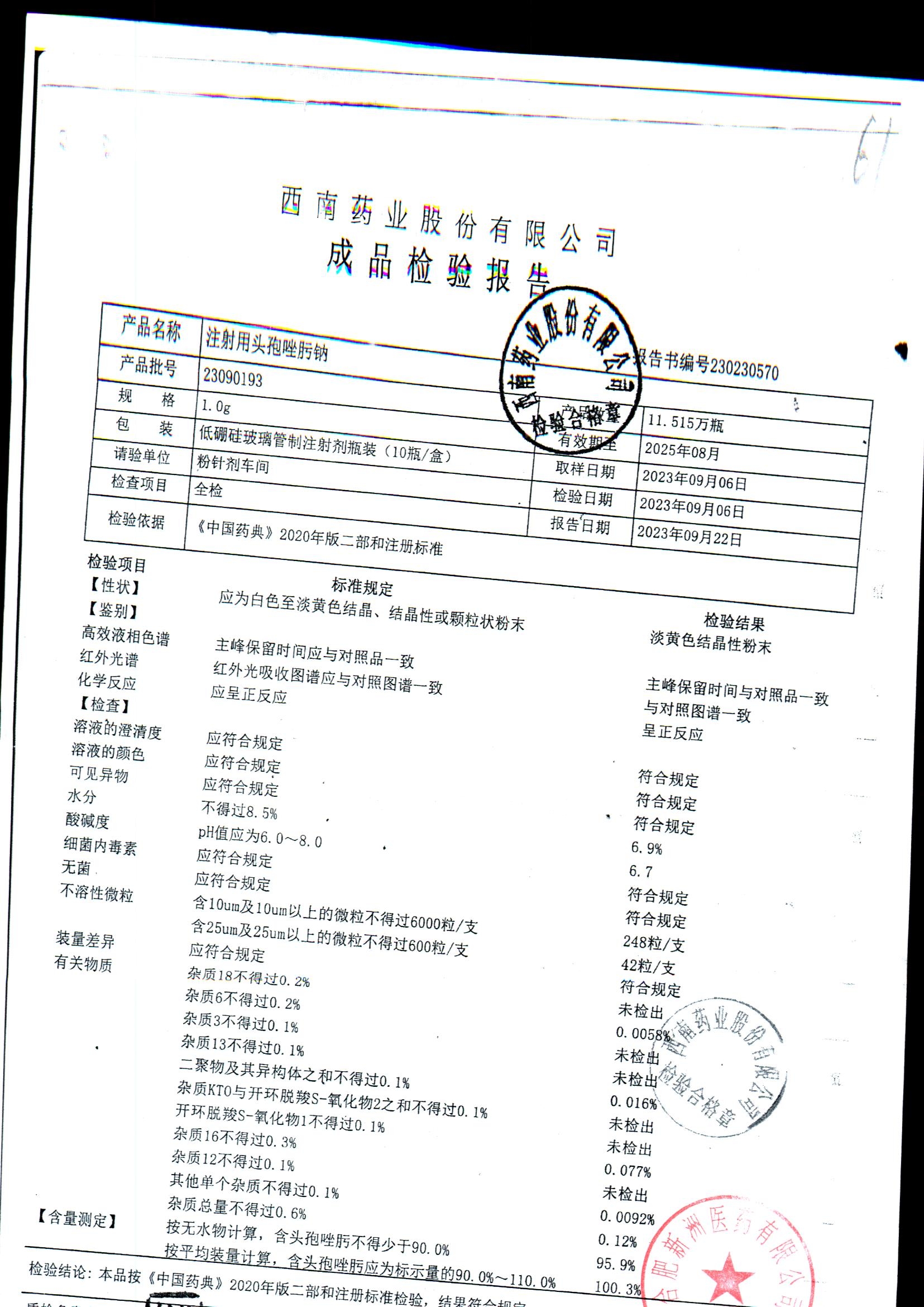注射用头孢唑肟钠 | 1.0g | 23090214 | 查看详情 |