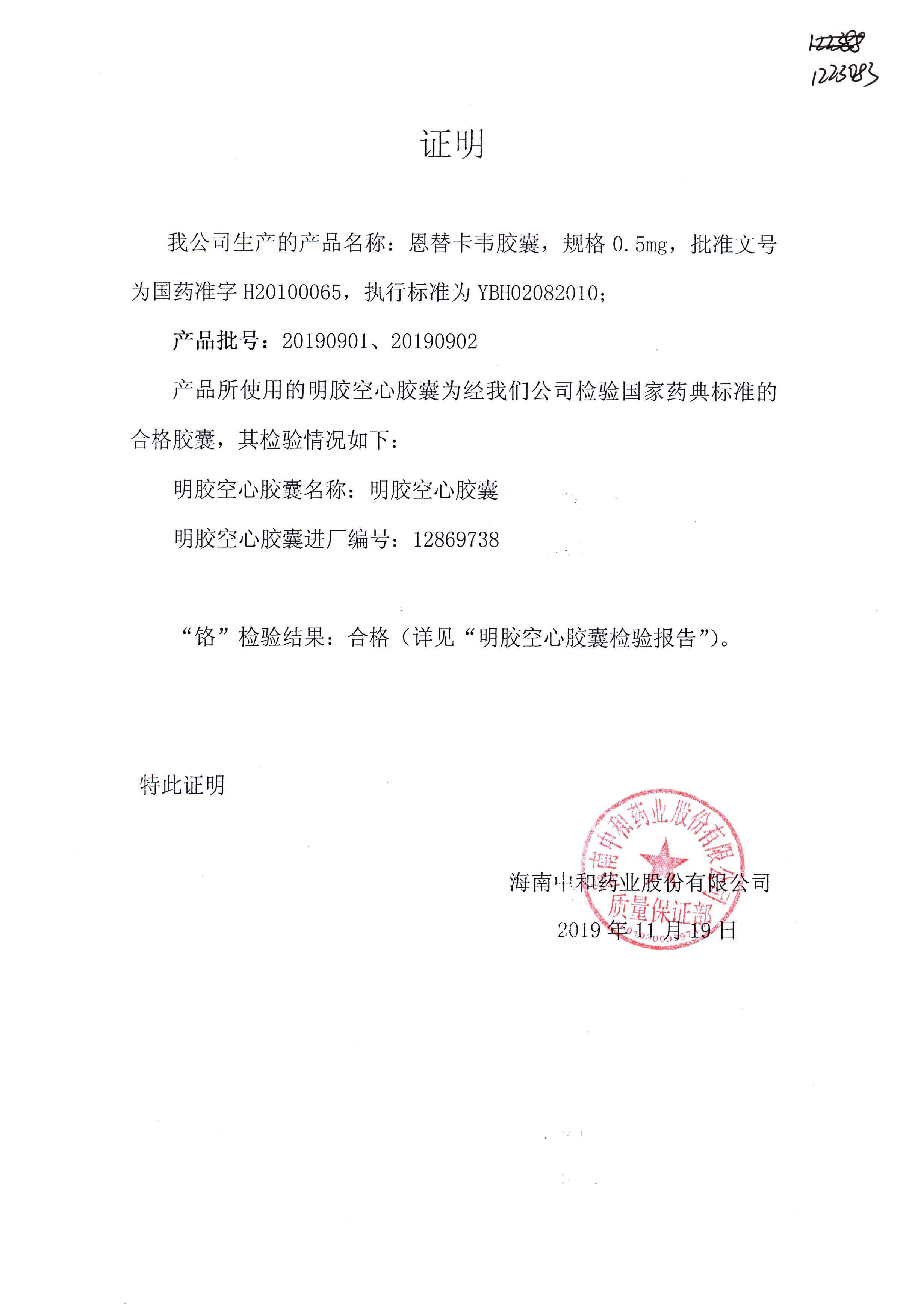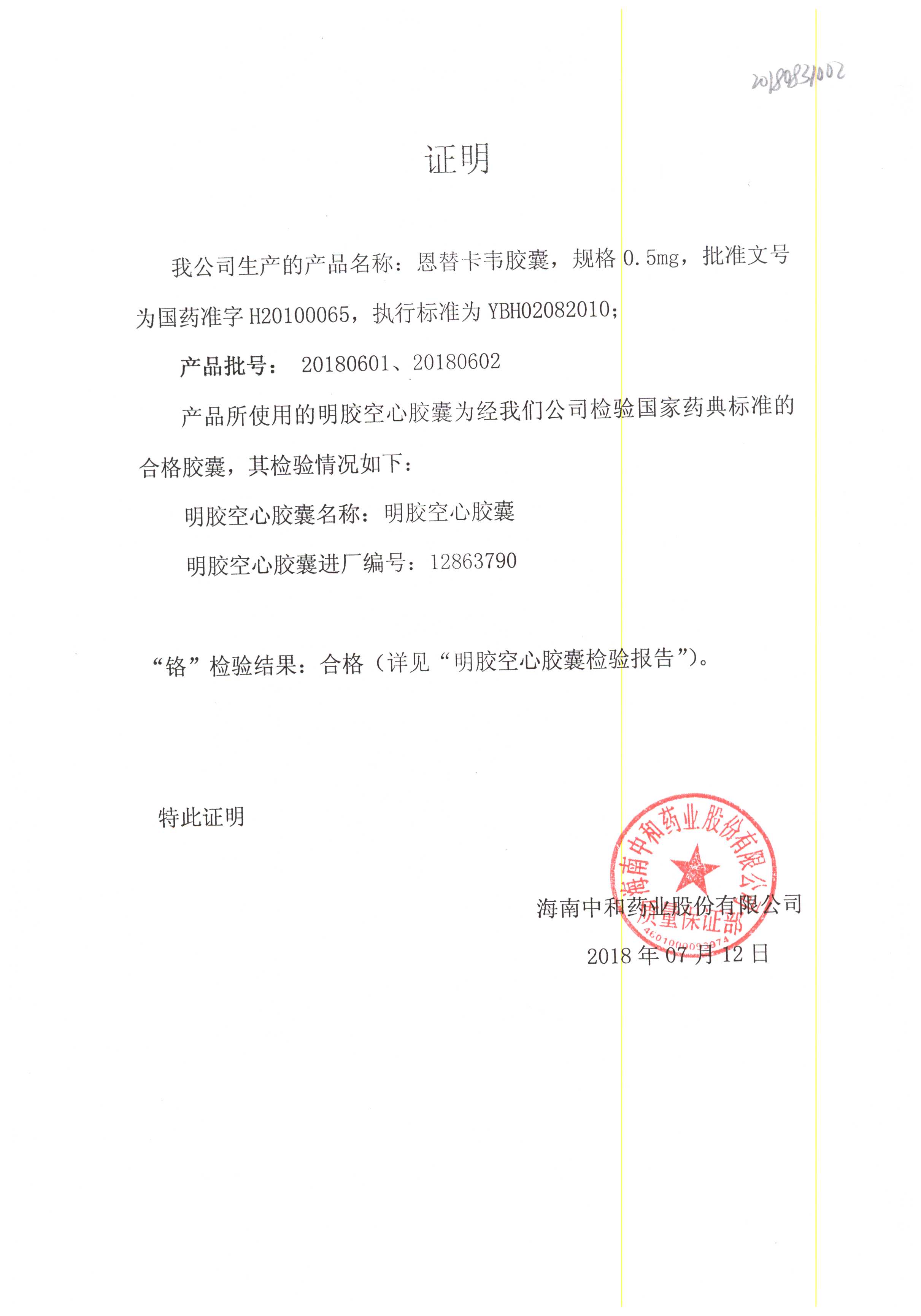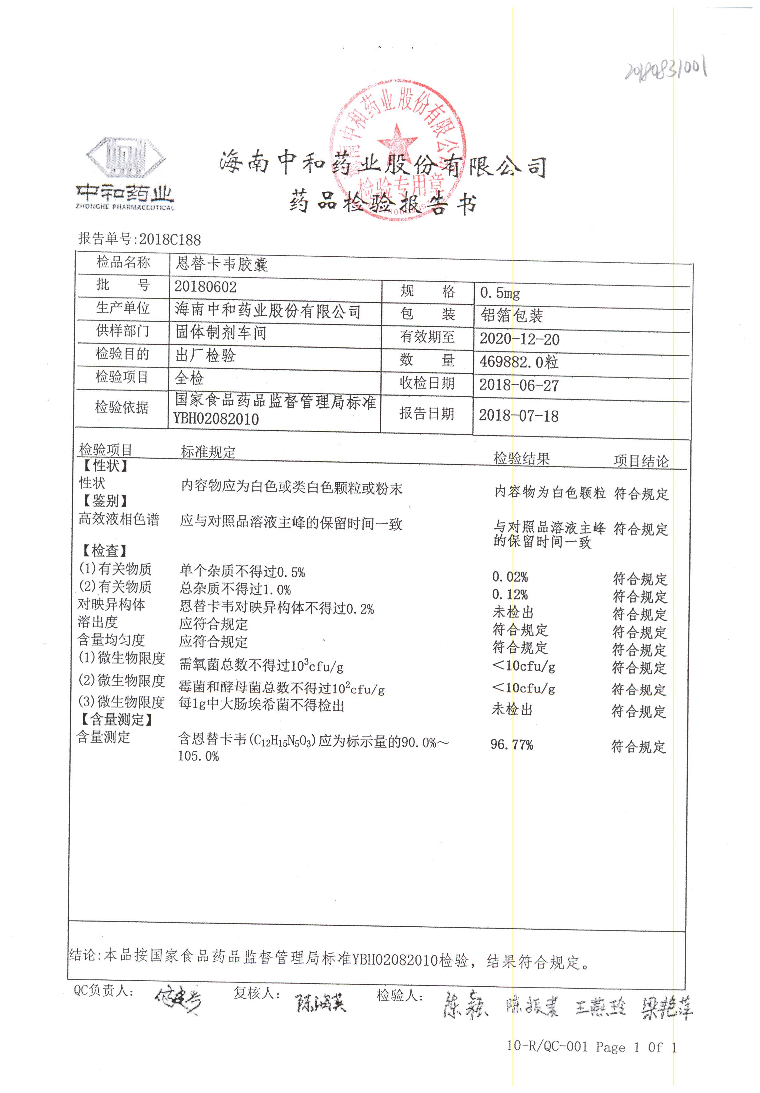 恩替卡韦胶囊 | 0.5mg | 20190902(2/3) | 查看详情 |