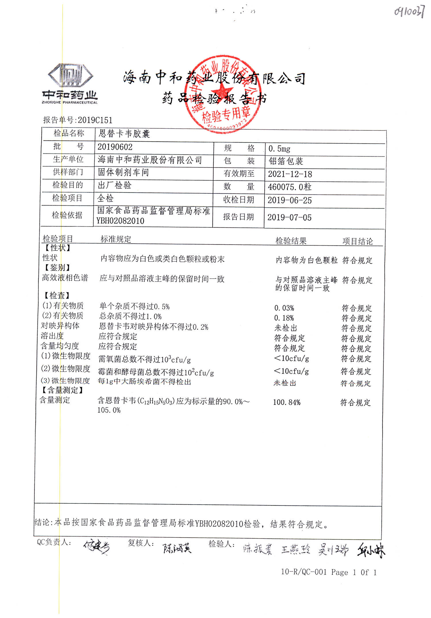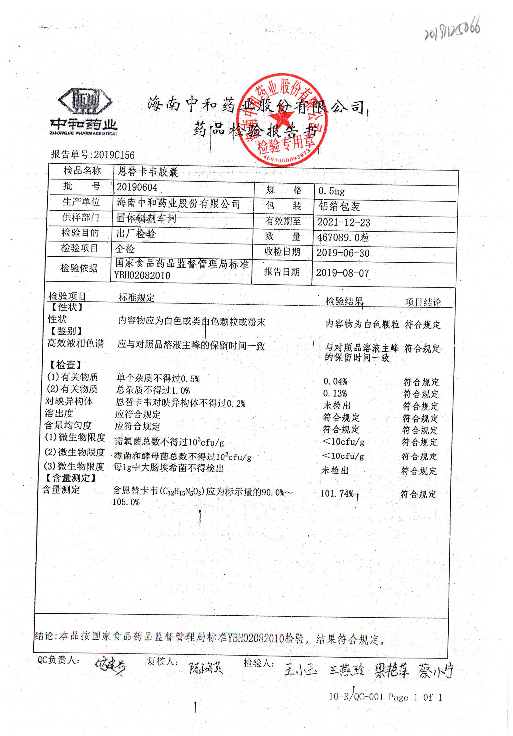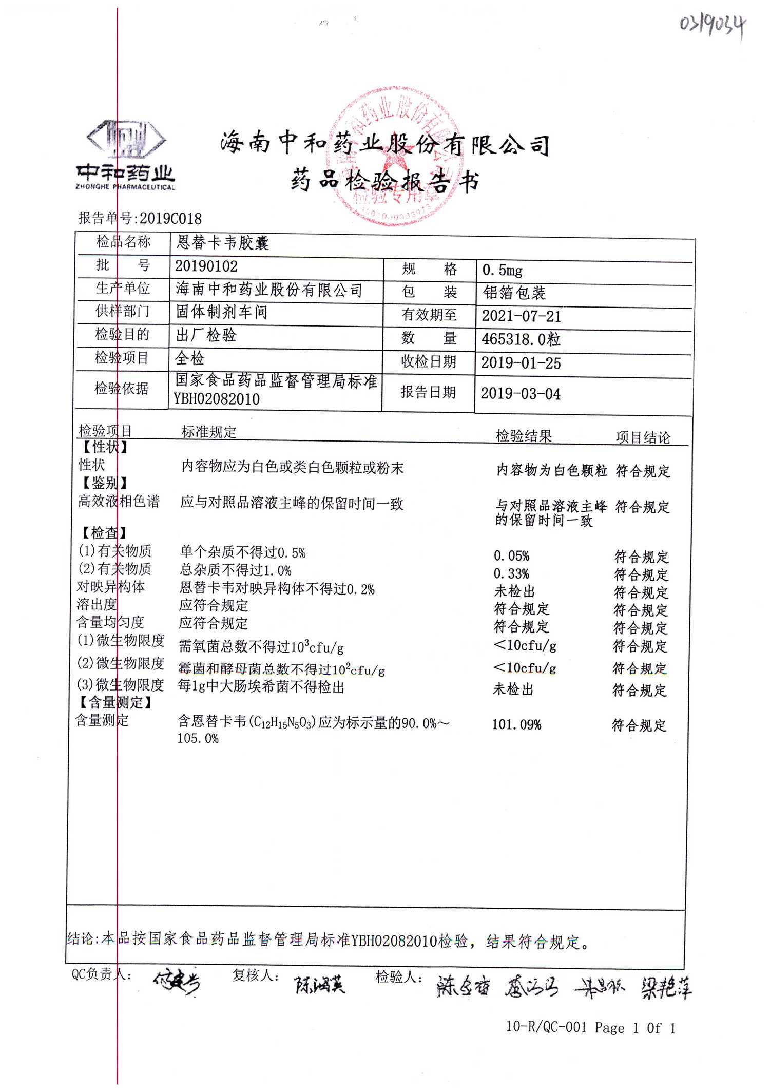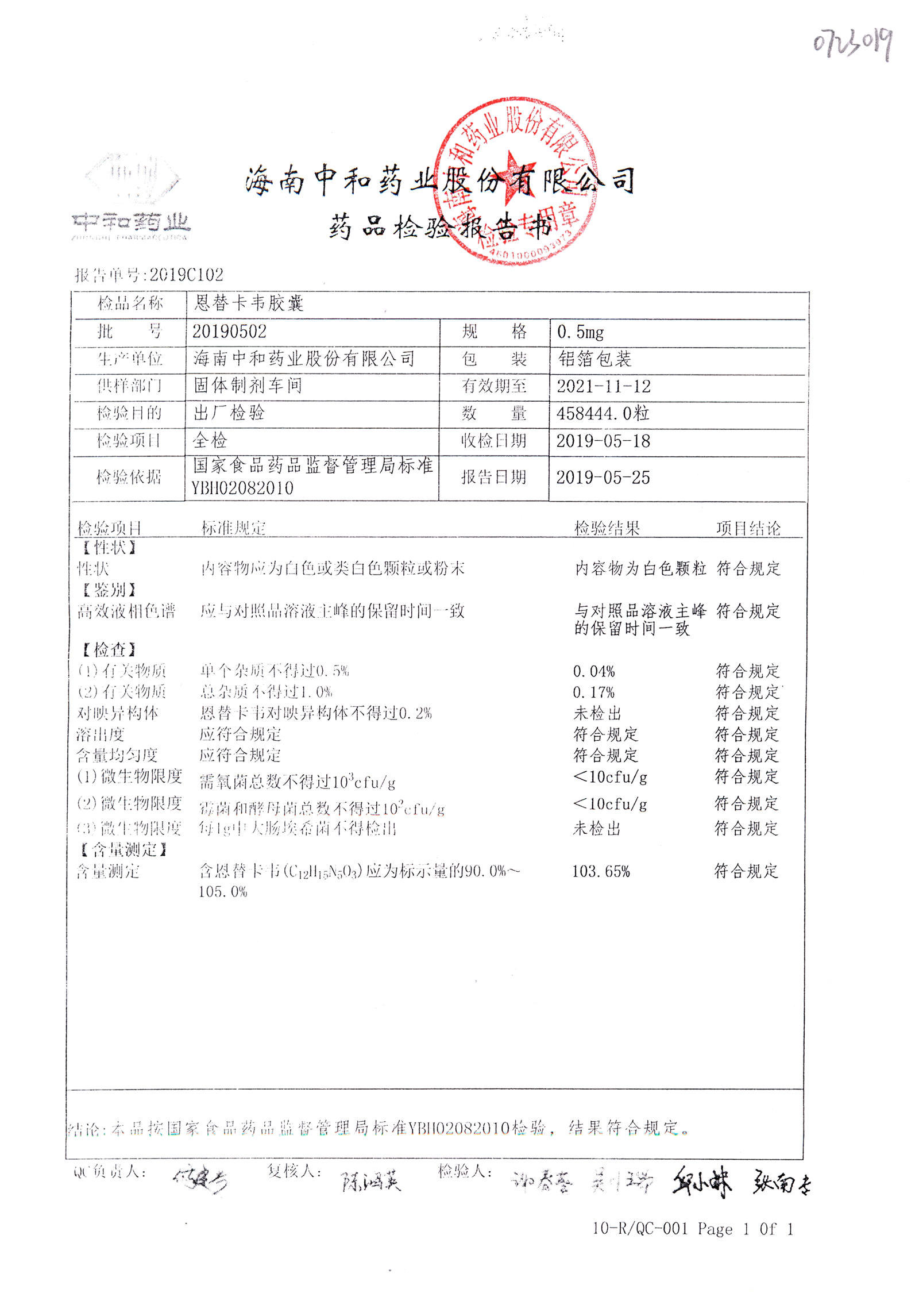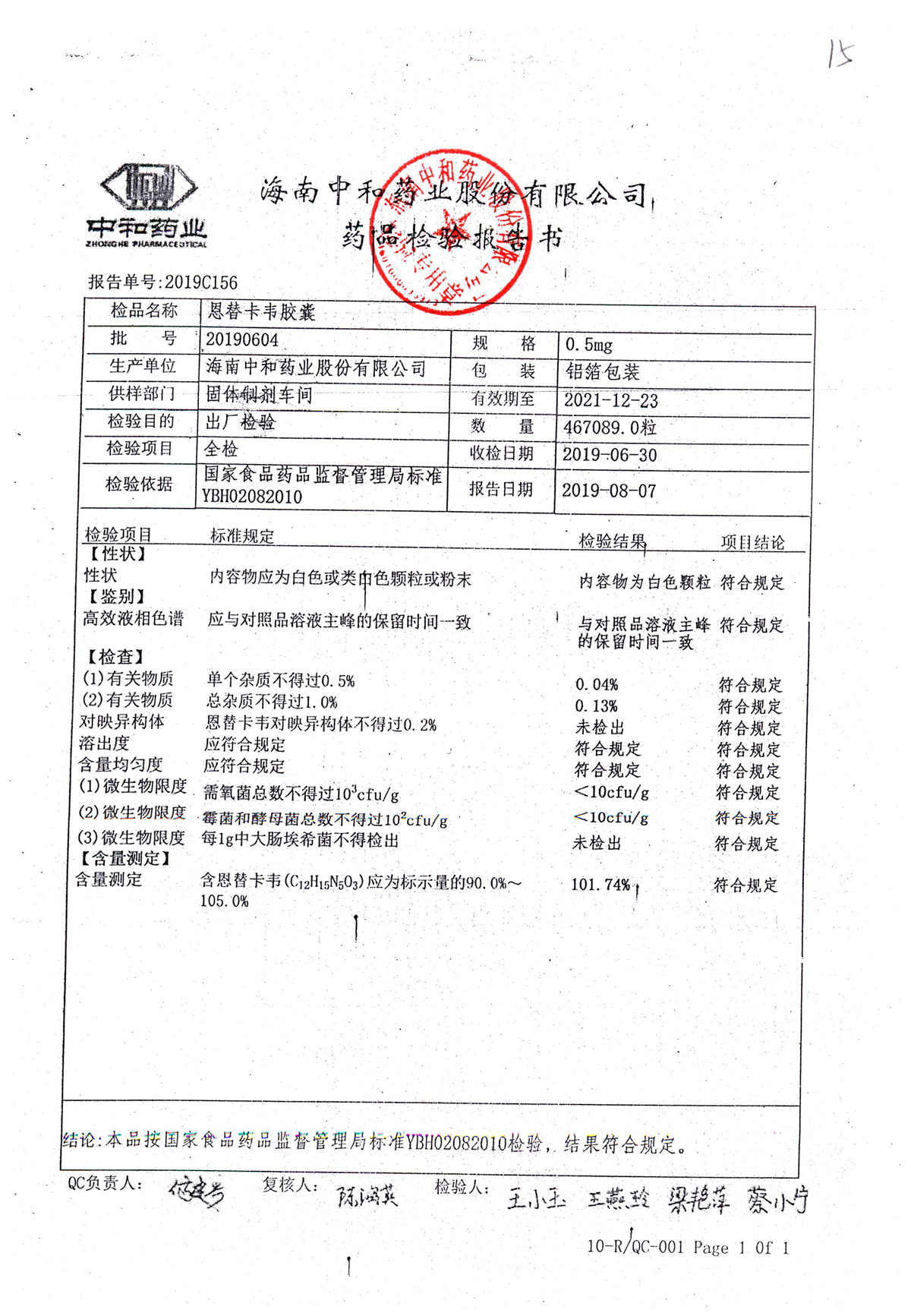 恩替卡韦胶囊 | 0.5mg | 20190604(1/3) | 查看详情 |