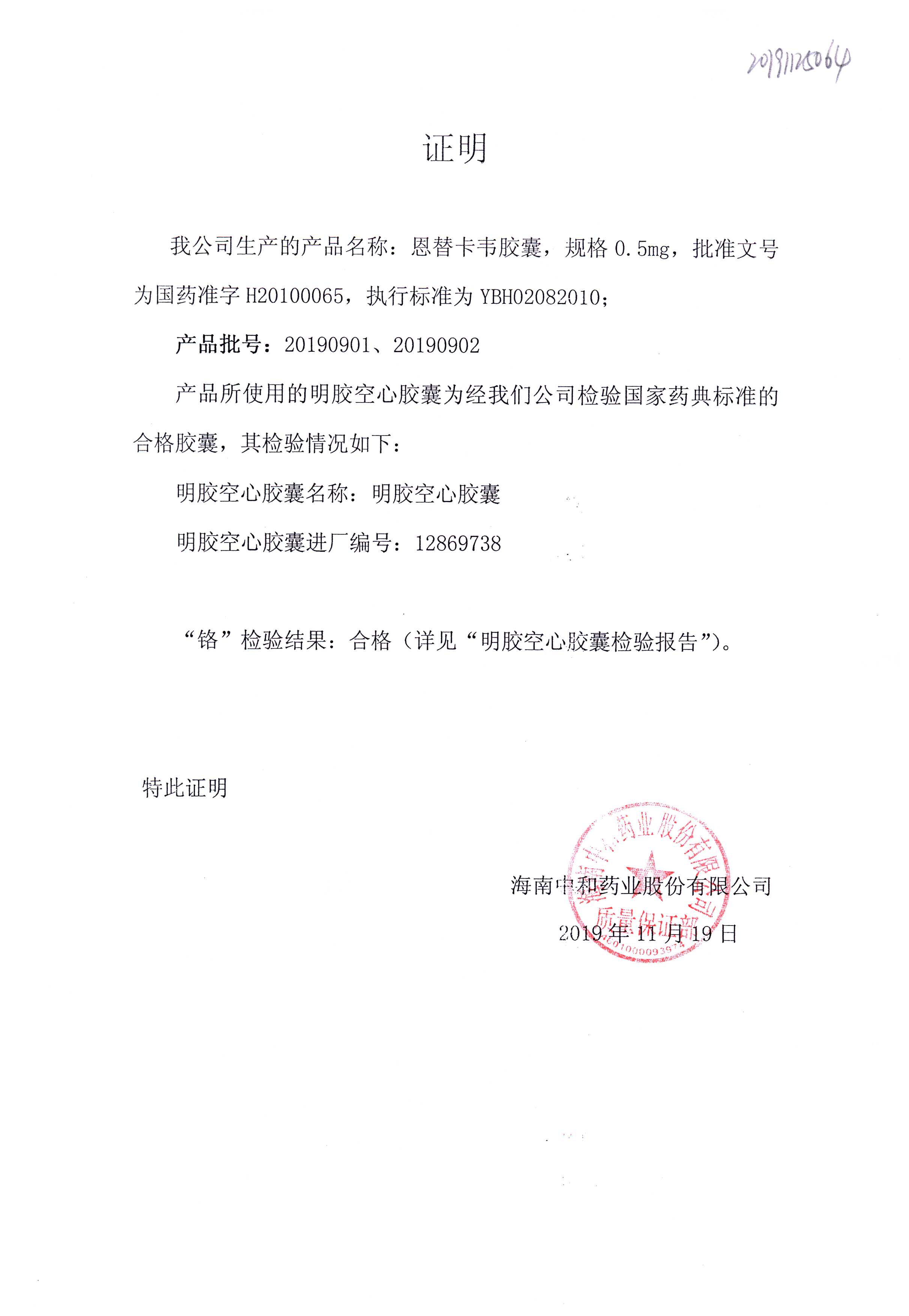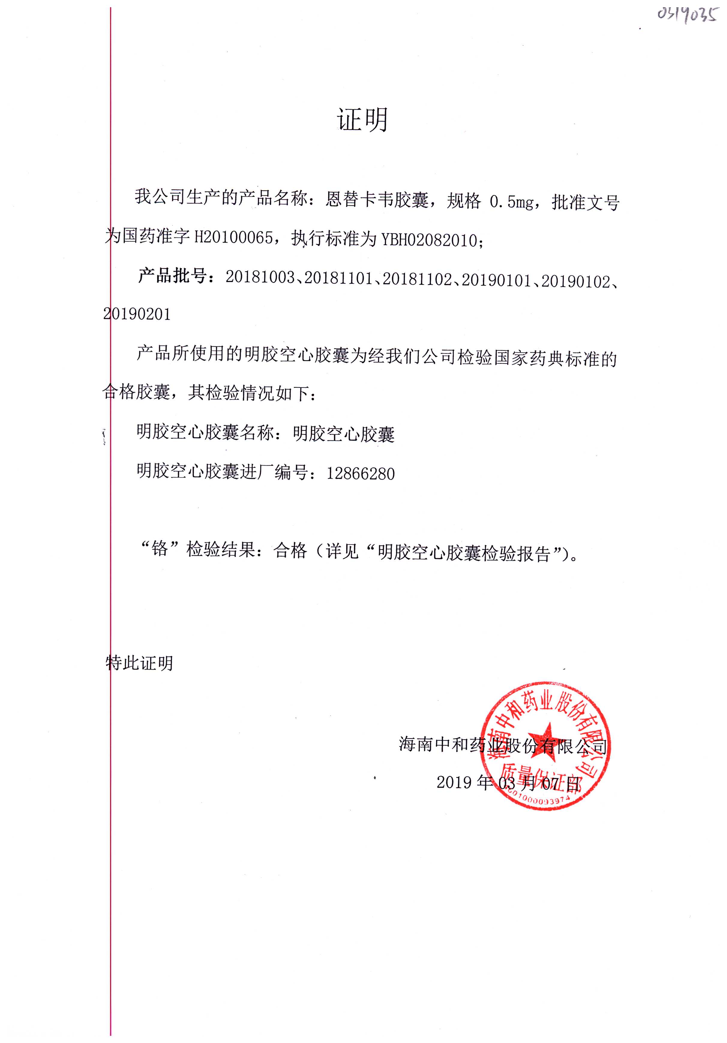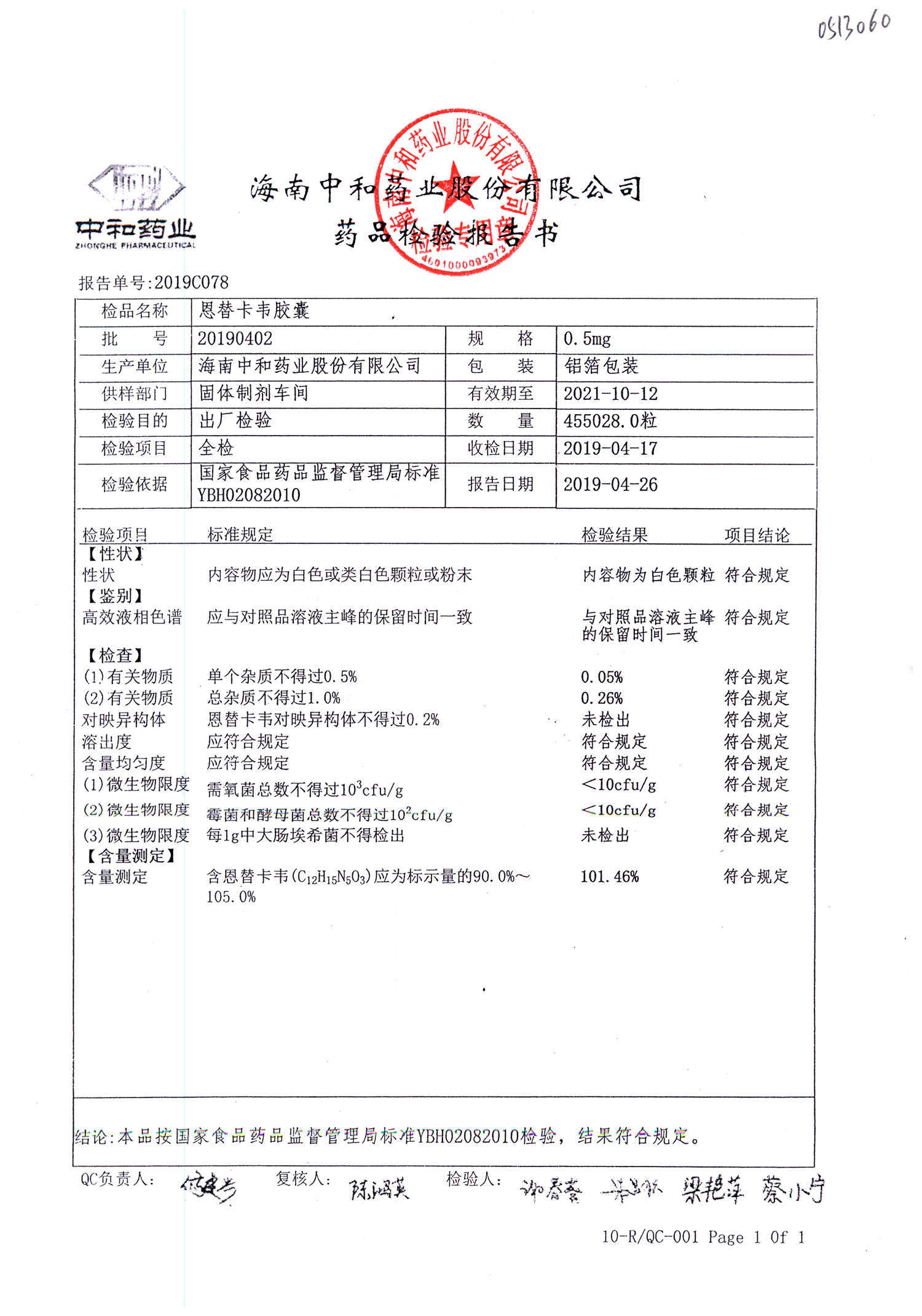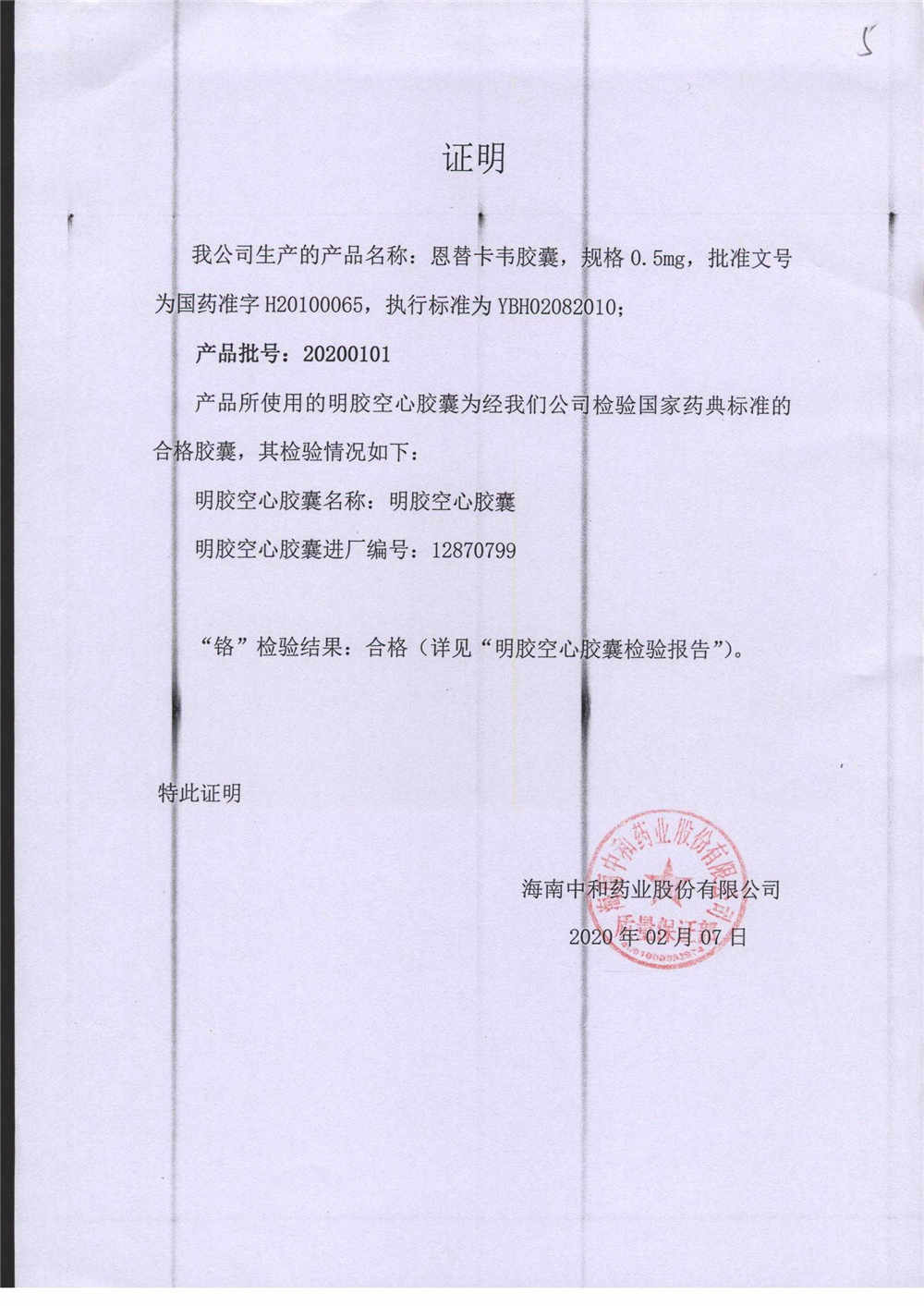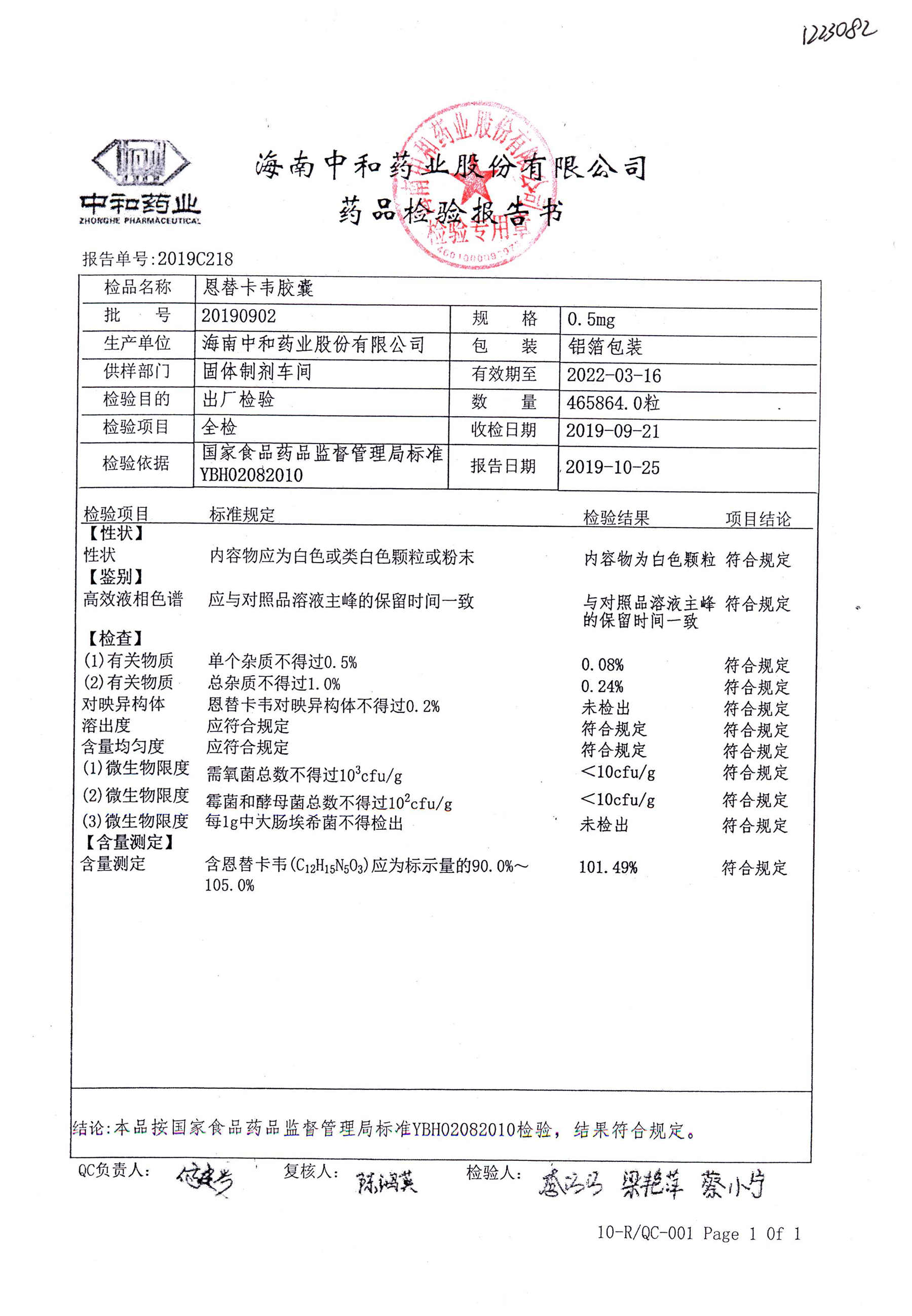 恩替卡韦胶囊 | 0.5mg | 20190604(1/3) | 查看详情 |
