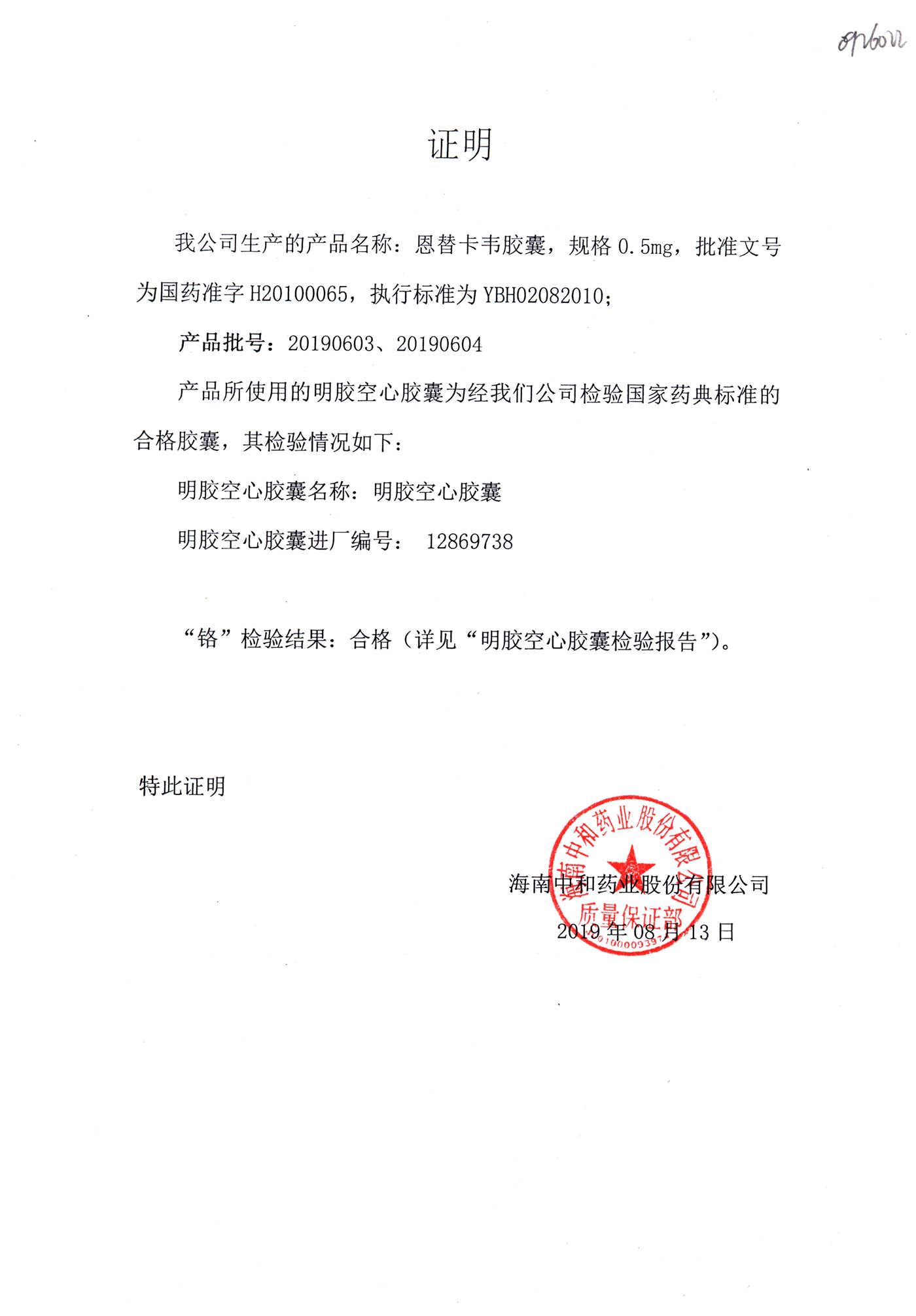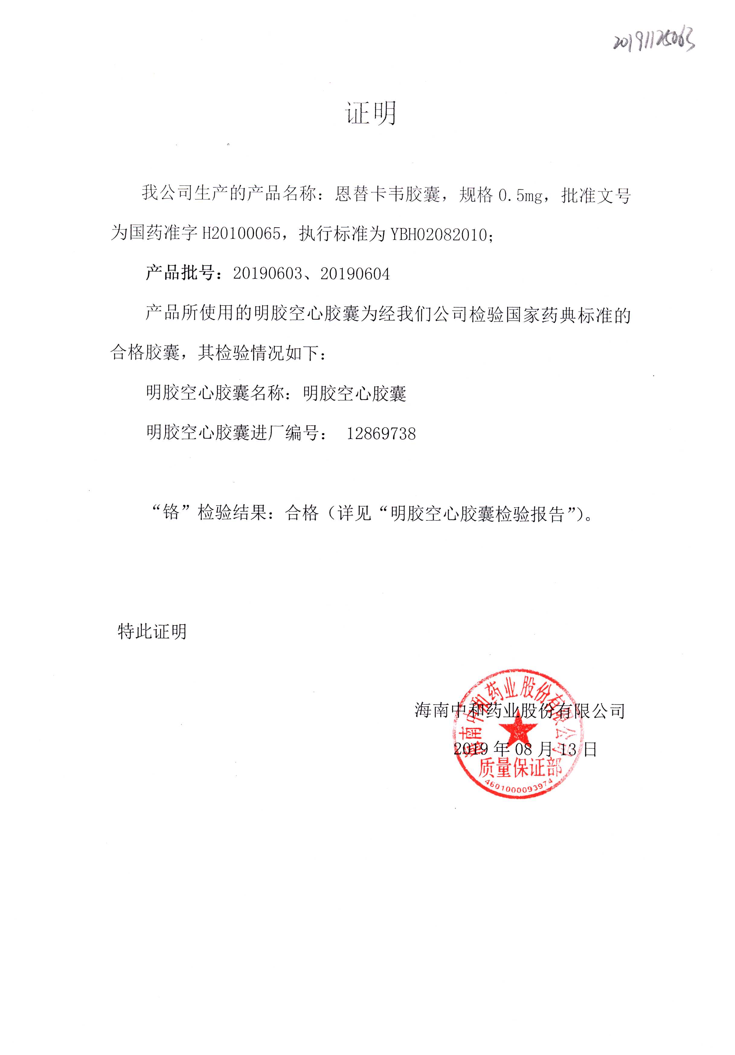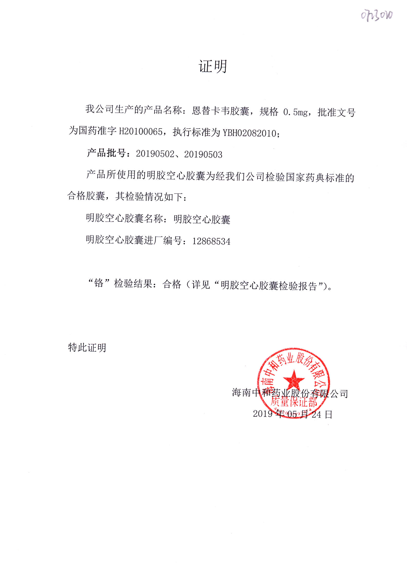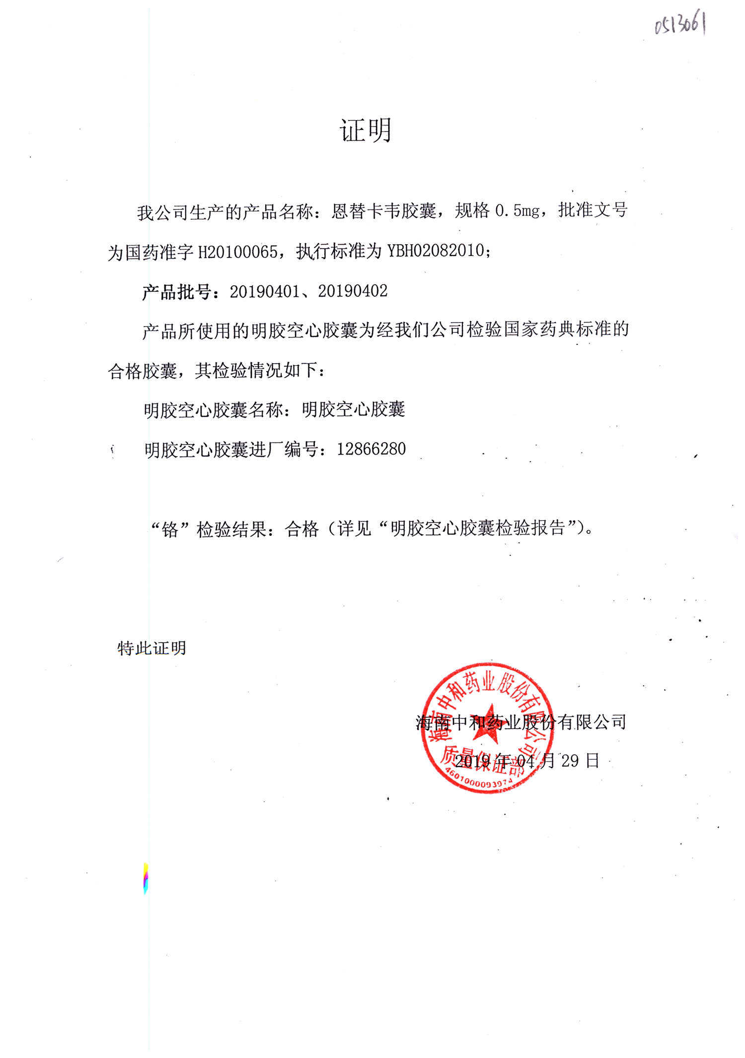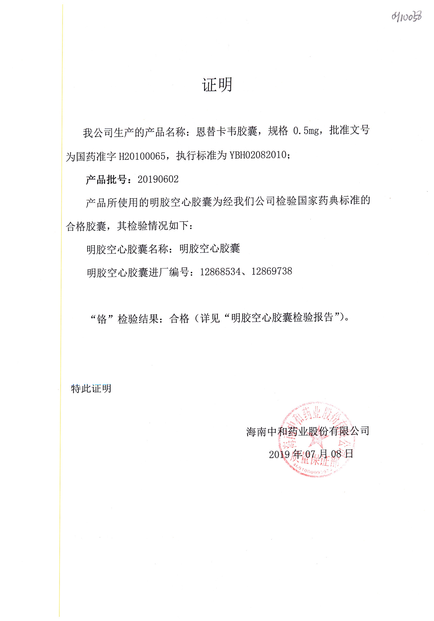 恩替卡韦胶囊 | 0.5mg | 20190604(1/3) | 查看详情 |